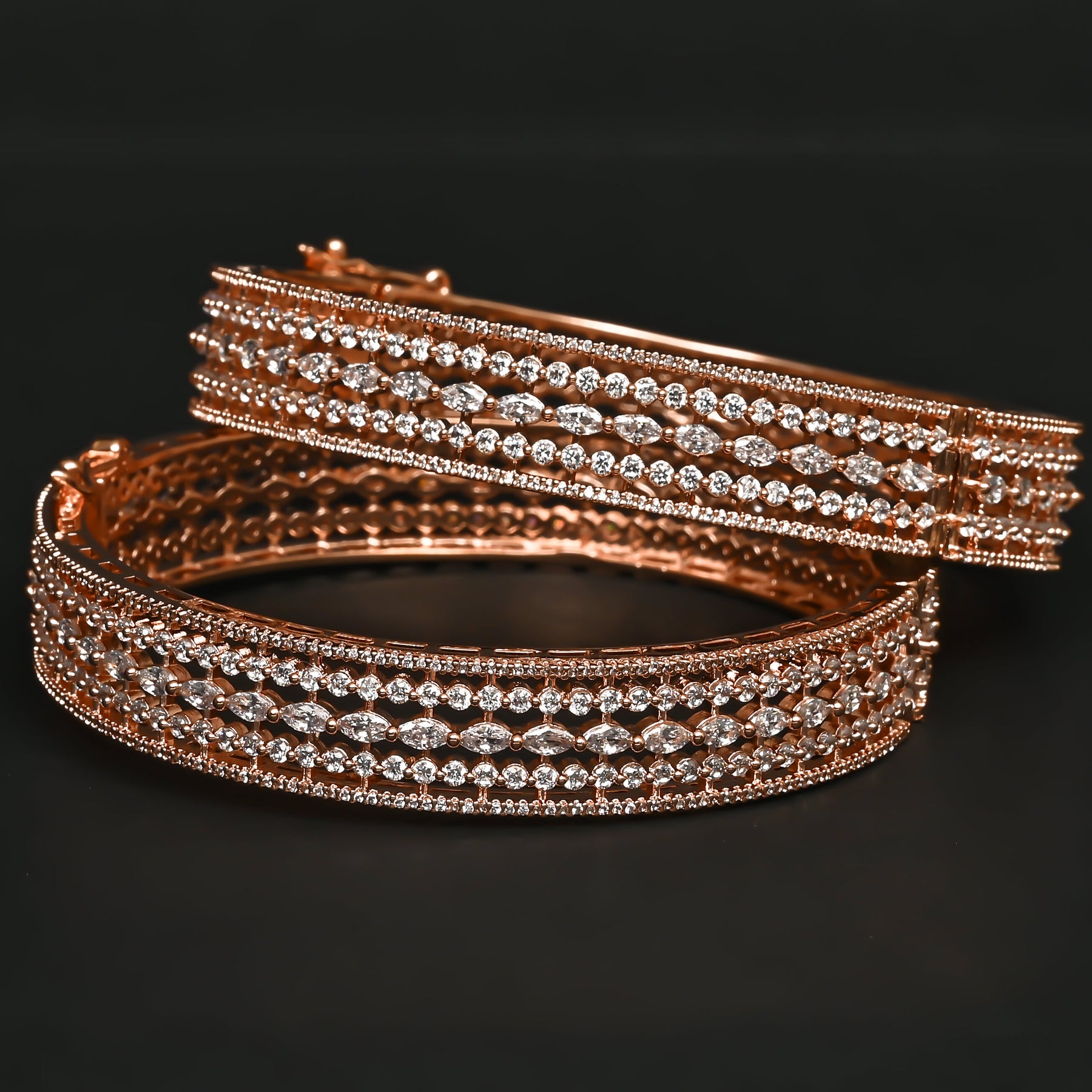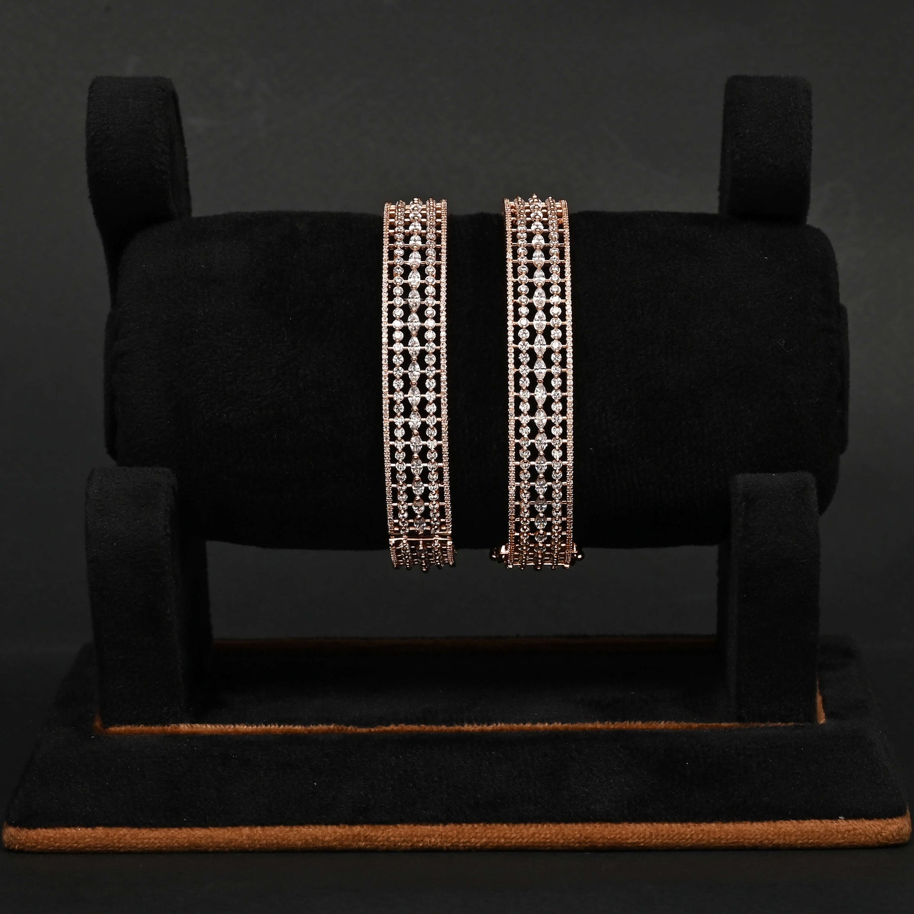 Elevate your elegance with these CZ Rose Gold Bangles, featuring genuine CZ stones that mimic the brilliance of diamonds. Expertly handcrafted for a one-of-a-kind design, each bangle offers a rose gold finish that complements every skin tone. The innovative side screw mechanism ensures effortless wearing and secure fit, making these bangles both stylish and practical additions to your jewelry collection.