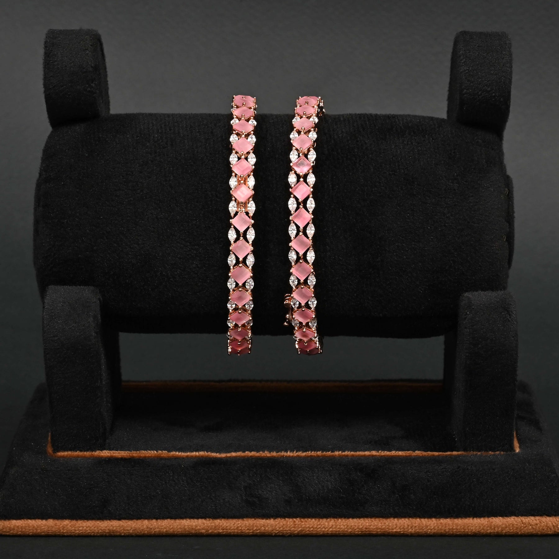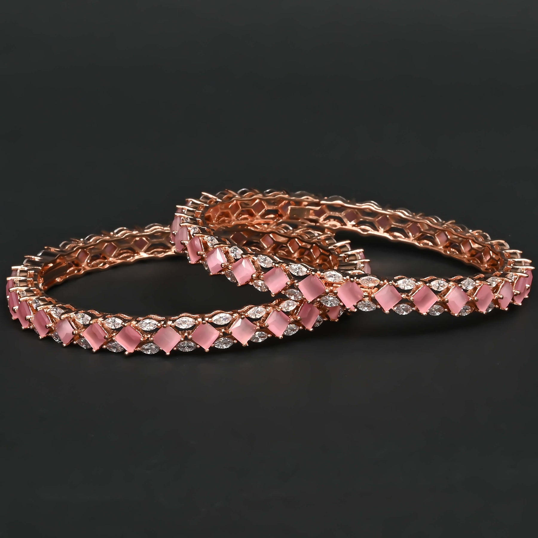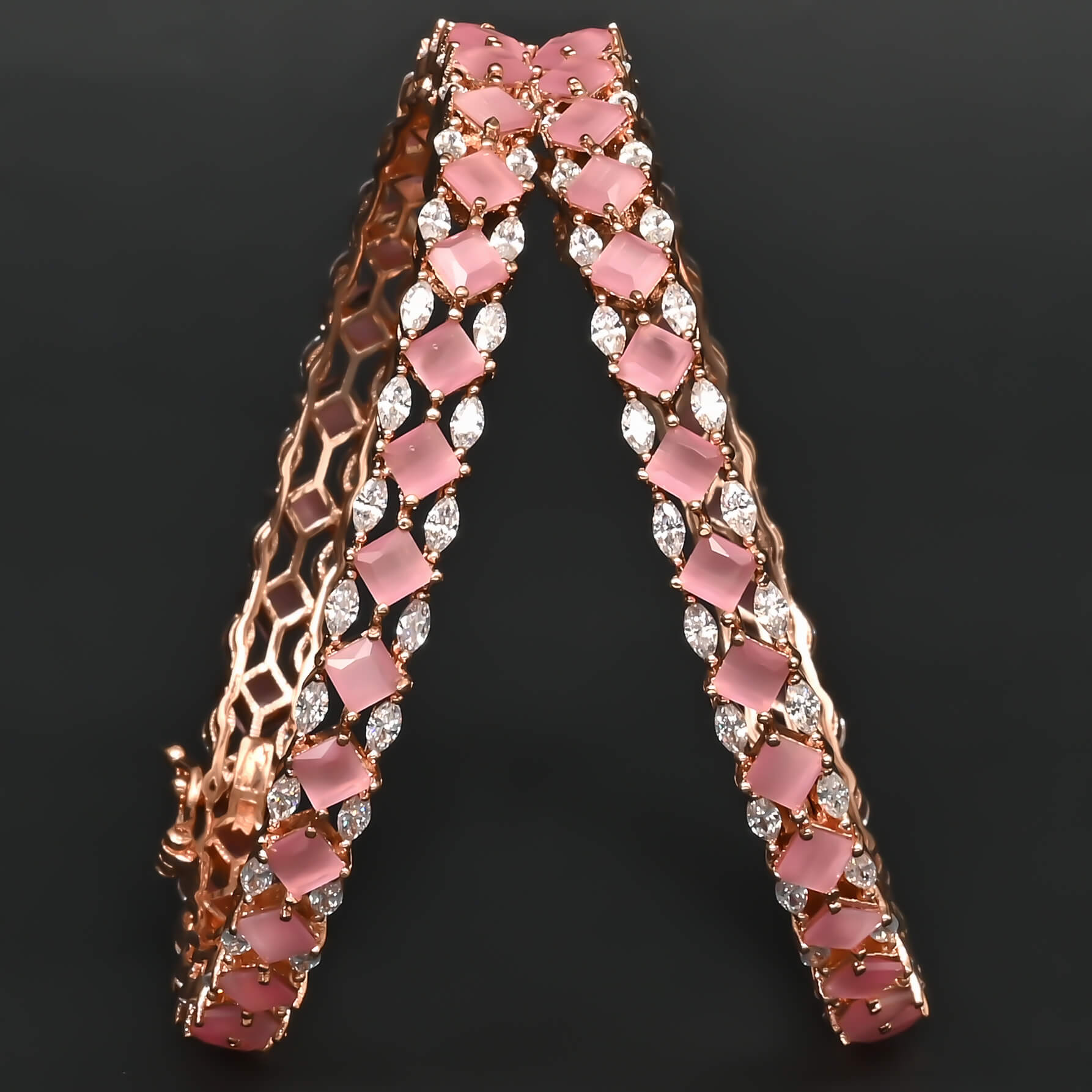 Elevate your style with these expertly handcrafted CZ Rose Gold Bangles, featuring dazzling real CZ stones that mimic the brilliance of diamonds. Accented with semi-precious pink stones, their unique design offers a one-of-a-kind elegance. The rose gold finish adds a warm glow, while the convenient side screw ensures effortless wear. Perfect for those seeking sophisticated craftsmanship paired with striking beauty.