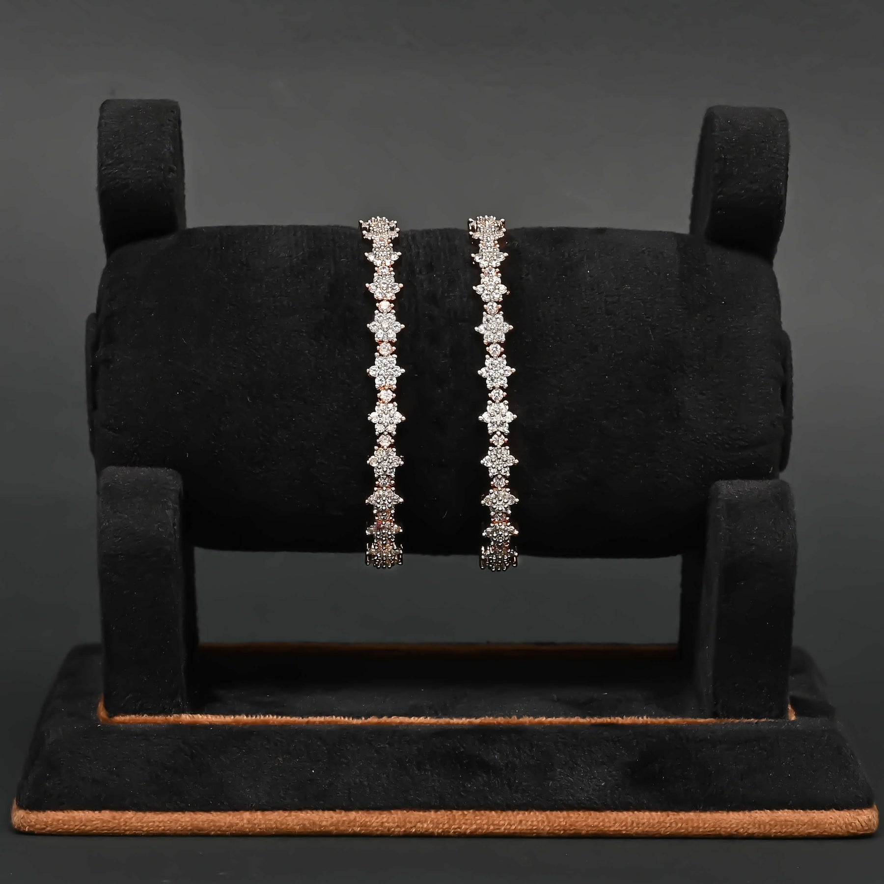 These CZ Rose Gold Finish Bangles showcase expert craftsmanship with genuine cubic zirconia stones that resemble the sparkle of diamonds. Handcrafted with precision, each bangle features a unique design that stands out as one of a kind. The warm rose gold finish adds a refined touch, making these bangles a sophisticated addition to any jewelry collection.