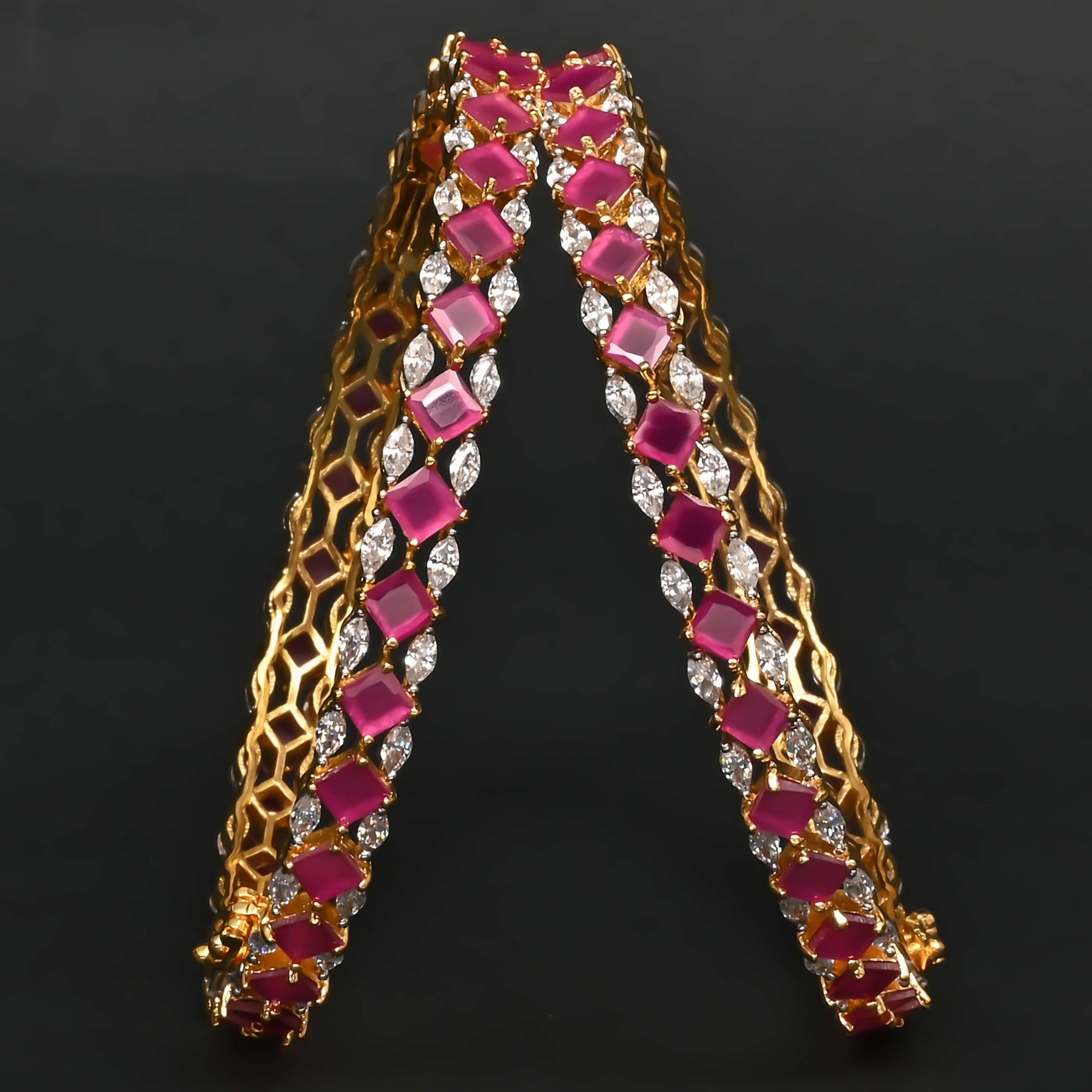 These handcrafted CZ Ruby Bangles showcase a unique design set with sparkling real CZ stones and semi-precious ruby accents, creating a stunning diamond-like appearance. Featuring a convenient side screw for easy wear, they combine elegance with functionality. Perfect for those seeking distinctive, expertly crafted jewelry with lasting beauty.