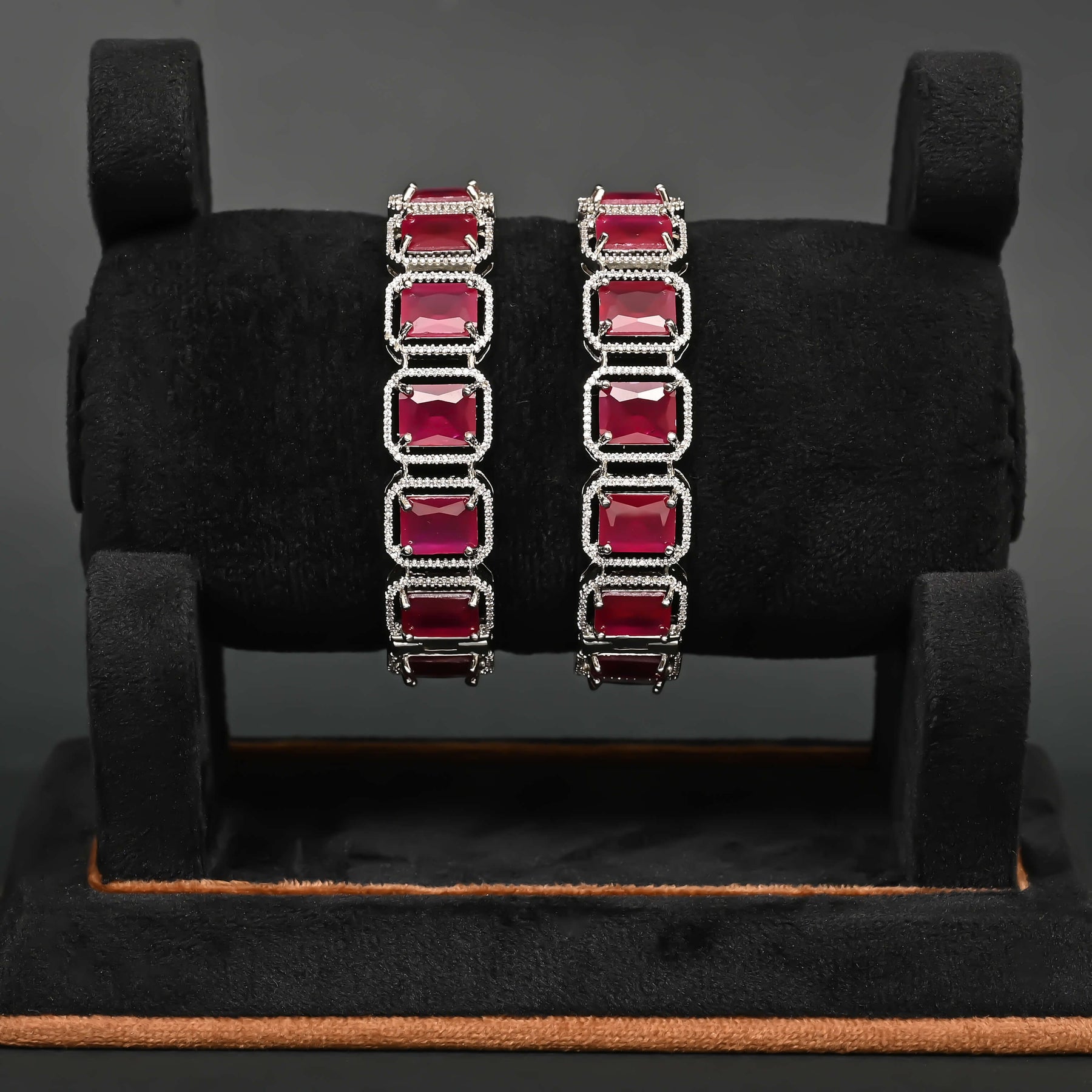 Experience the elegance of CZ Ruby Bangles, expertly handcrafted with a white gold finish to highlight the brilliance of real CZ stones. Featuring semi-precious ruby accents that mimic the allure of diamonds, these bangles offer a unique, one-of-a-kind design. The side screw mechanism ensures easy and secure wear, combining luxury with practicality in every piece.