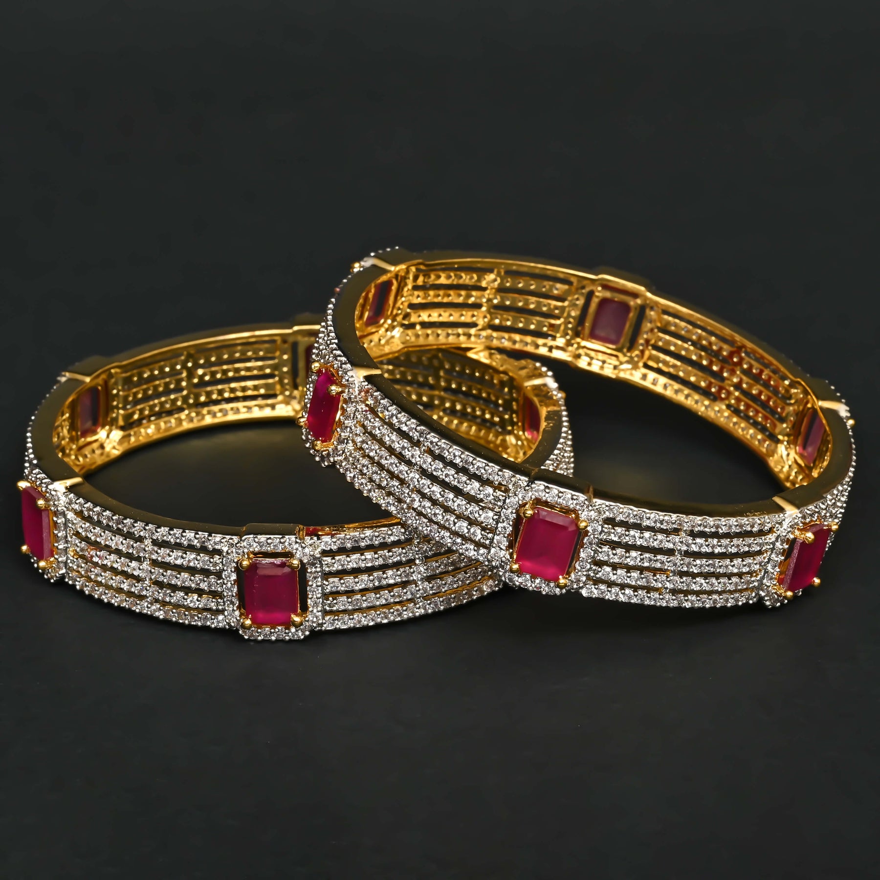 Elevate your elegance with these expertly handcrafted CZ Ruby Bangles, featuring genuine CZ stones paired with semi-precious ruby accents. Designed with a convenient side screw, they ensure effortless wear while highlighting a unique, one-of-a-kind design in a sophisticated diamond finish. Perfect for those seeking a refined accessory that combines durability with exquisite craftsmanship.