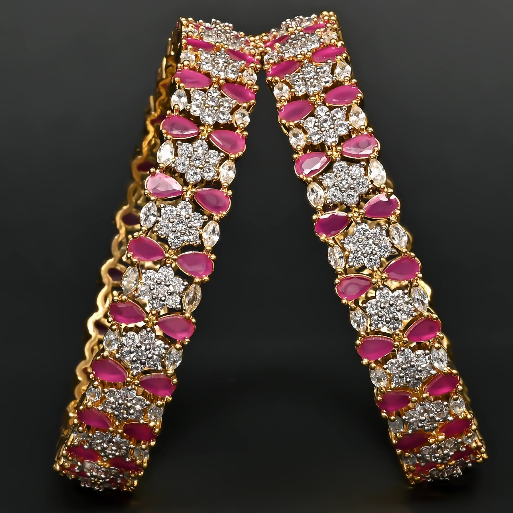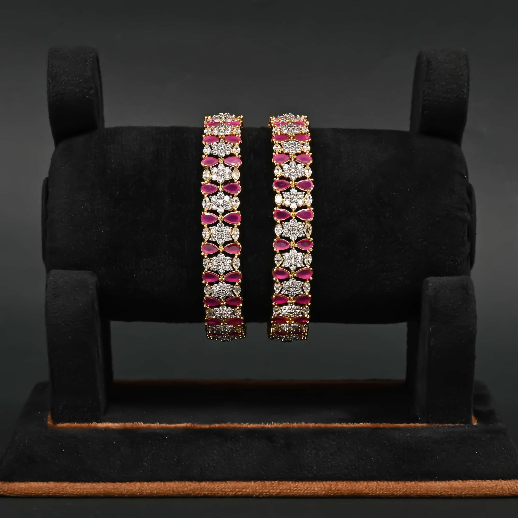 These expertly handcrafted CZ Ruby Bangles feature genuine cubic zirconia stones alongside semi-precious ruby accents, creating a radiant diamond-like finish. Designed with a convenient side clip for easy wear and secure fit, each bangle is a unique, one-of-a-kind piece that combines timeless elegance with refined craftsmanship.