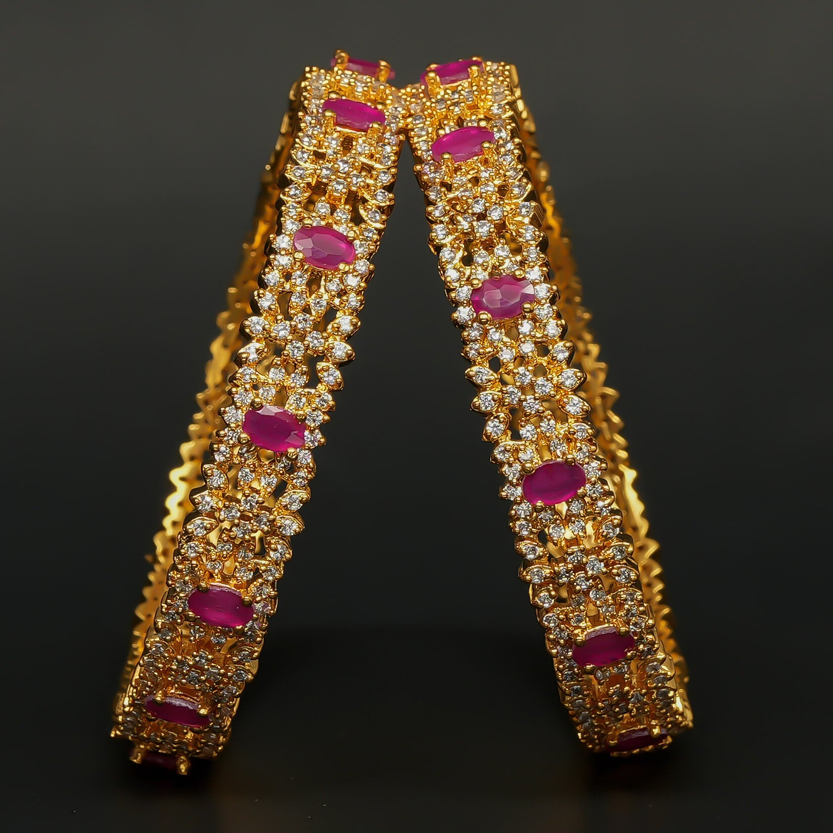 Elevate your collection with these expertly handcrafted CZ Ruby Bangles, featuring a gold finish that highlights genuine CZ and semi-precious ruby stones. Designed with a unique side screw mechanism, they ensure effortless wear and secure fit. Each piece is one of a kind, merging exquisite craftsmanship with timeless elegance for a distinctive accessory.