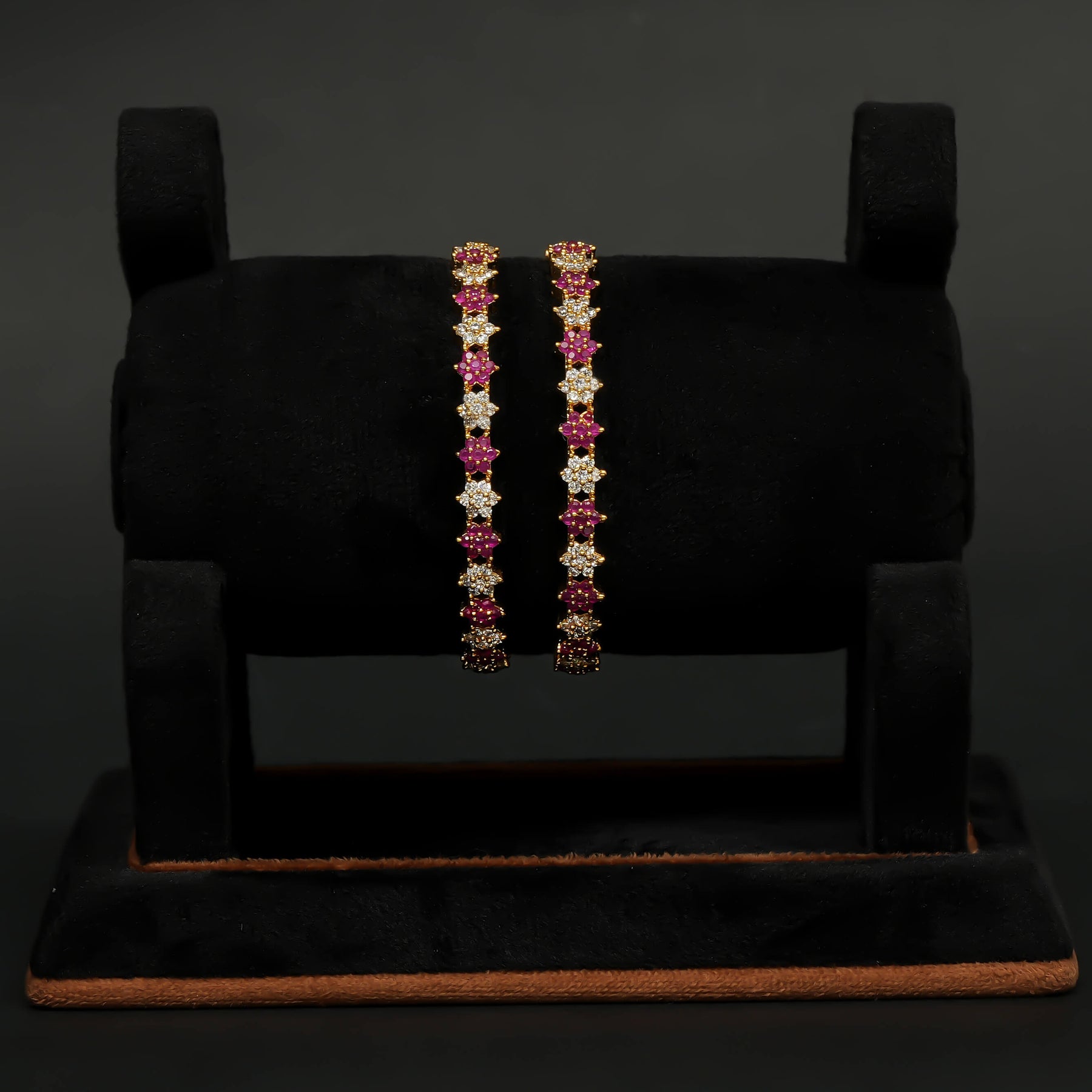 These exquisitely handcrafted CZ Ruby Bangles feature real cubic zirconia stones paired with semi-precious ruby accents, set in a gold-finished frame. Designed with a unique one-of-a-kind pattern and equipped with a side screw mechanism, they ensure effortless wear and exceptional comfort. Perfect for adding a refined touch to any ensemble, these bangles combine timeless elegance with expert craftsmanship.