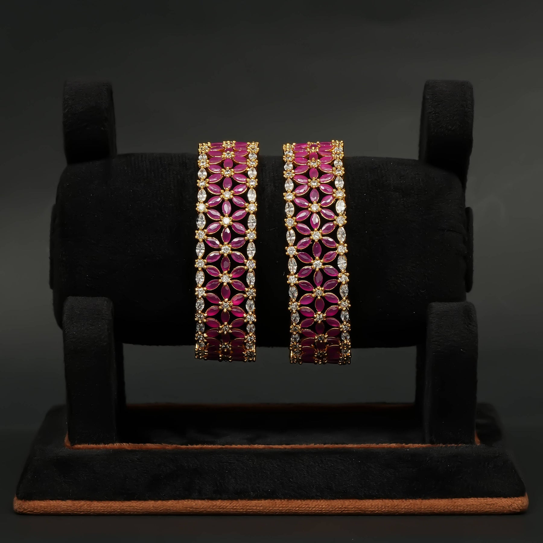 Crafted with precision, these CZ Ruby Bangles feature genuine CZ stones and semi-precious ruby accents set in a gold-finish frame. Each piece is uniquely handcrafted with a practical side screw for effortless wear, combining timeless elegance with convenience. This one-of-a-kind design showcases expert craftsmanship, perfect for those seeking exclusive sophistication in their jewelry collection.