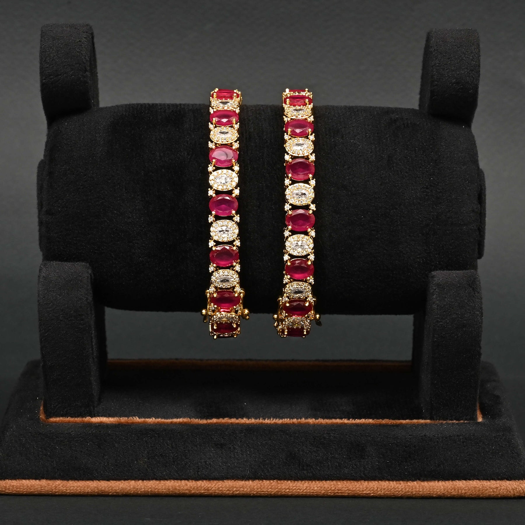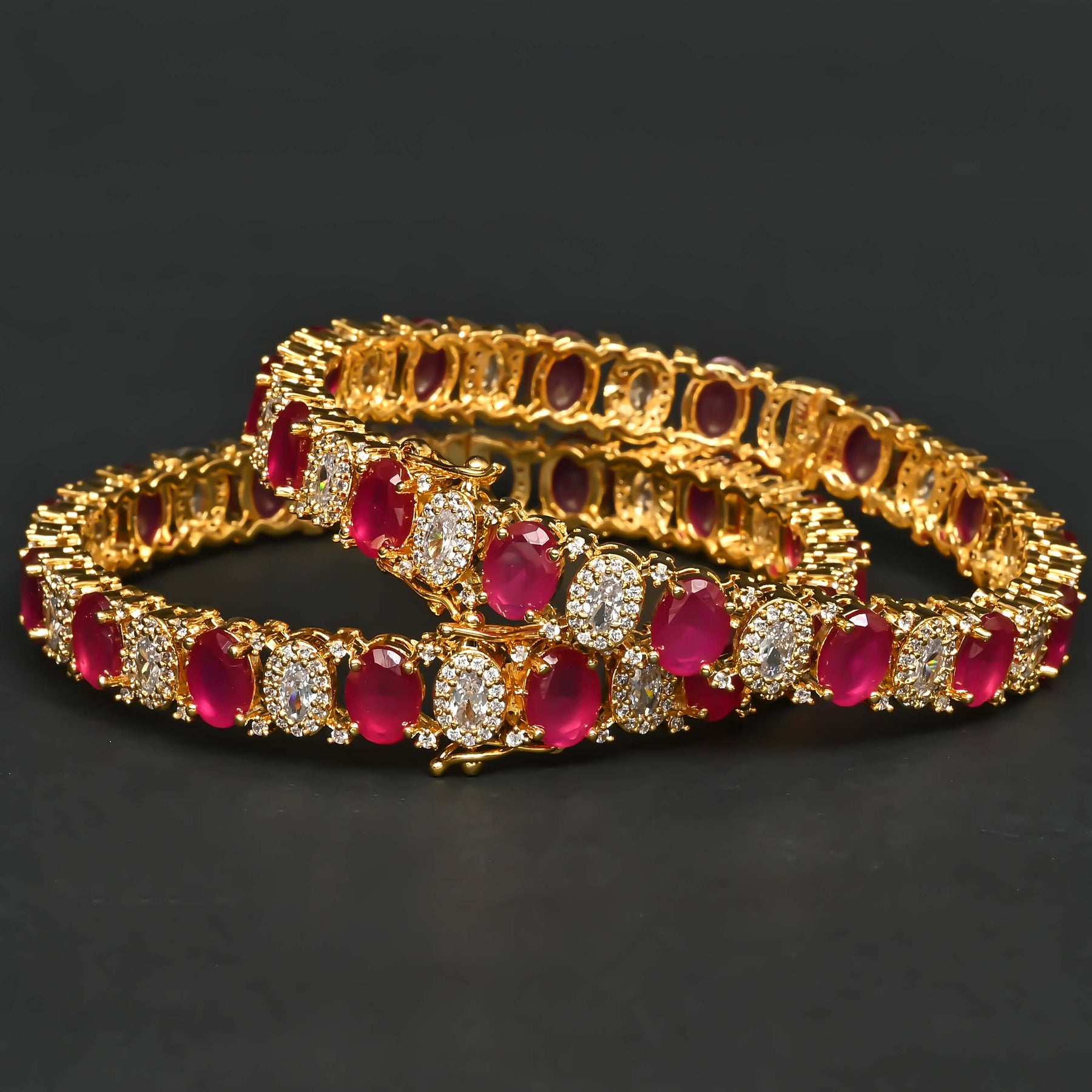 These CZ Ruby Bangles feature a gold finish and are adorned with real CZ stones that sparkle with a diamond-like brilliance. Designed with a convenient side clip opening, they ensure easy and secure wear. Handcrafted with precision, each bangle showcases a unique, one-of-a-kind design that adds an elegant touch to any ensemble.