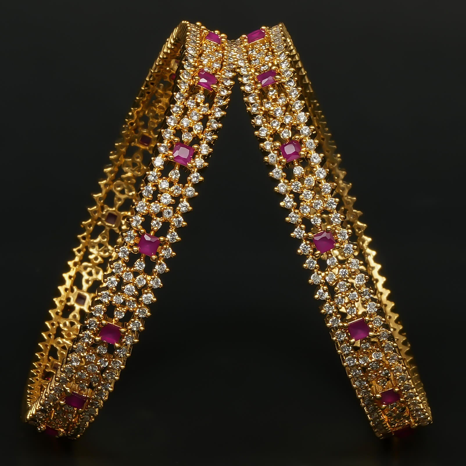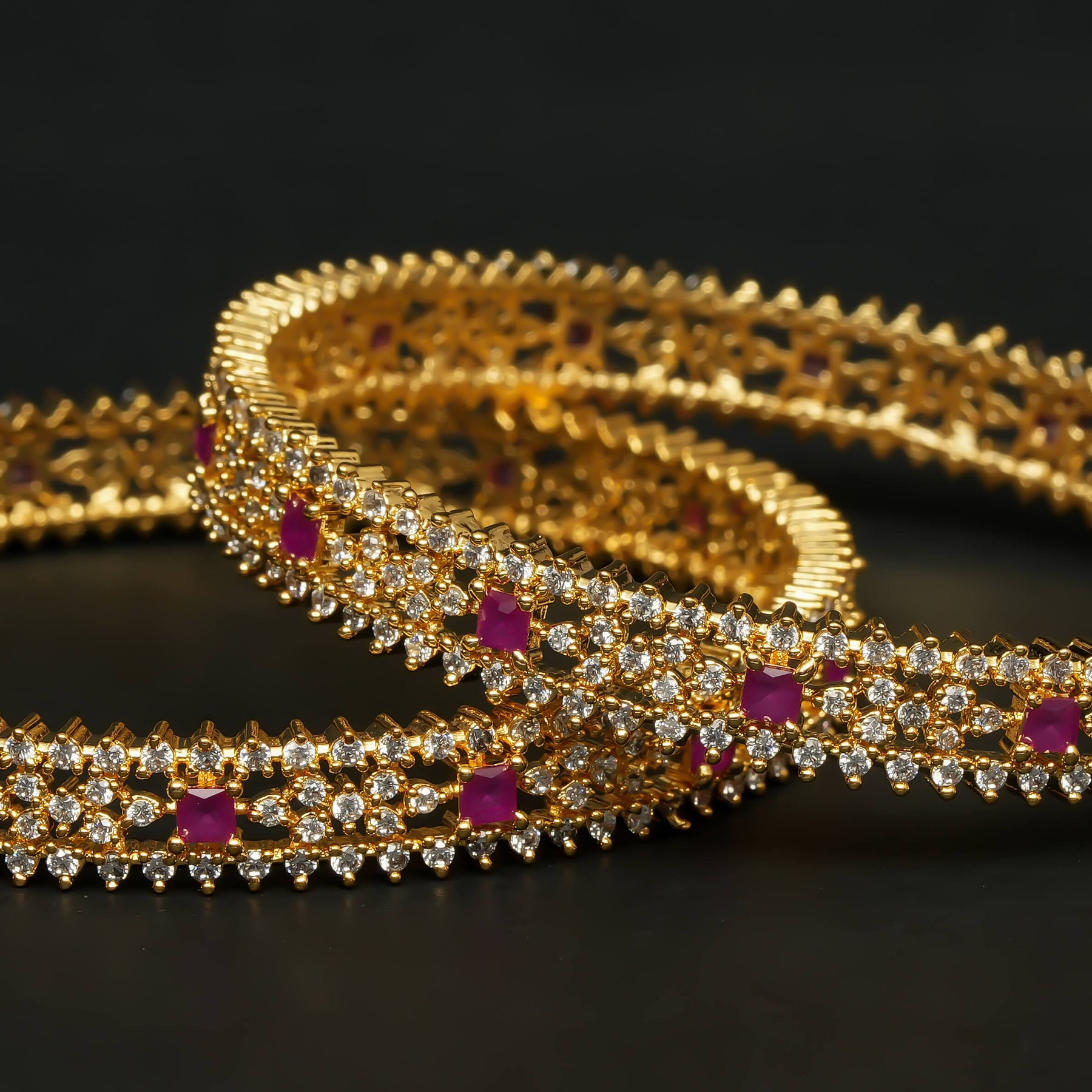 Elevate your jewelry collection with these exquisite CZ Ruby Bangles, featuring a luxurious gold finish that complements their handcrafted artistry. Adorned with genuine cubic zirconia stones and semi-precious ruby accents, these bangles boast a unique, one-of-a-kind design. The innovative side screw mechanism ensures effortless wearing and secure fit, blending convenience with elegance. Perfect for sophisticated occasions, these bangles showcase expert craftsmanship and timeless beauty.
