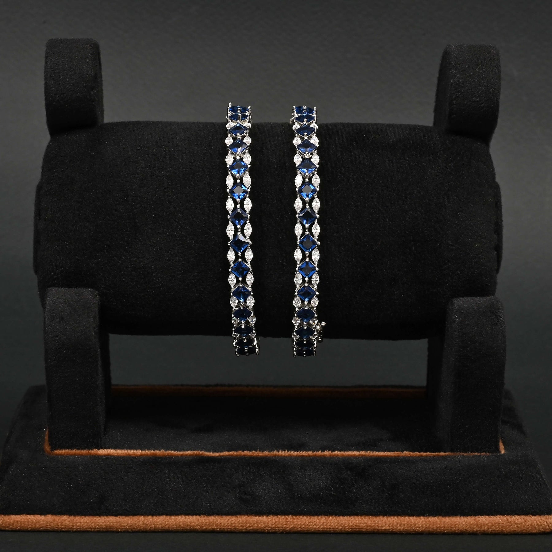 Experience elegance with our CZ Sapphire Bangles, meticulously handcrafted to showcase a unique design. Featuring real cubic zirconia stones that mimic diamonds and semi-precious sapphire accents, these bangles offer a brilliant white gold finish for timeless appeal. The convenient side screw mechanism ensures easy wear without compromising style. Perfect for those seeking sophistication with exceptional craftsmanship and one-of-a-kind charm.