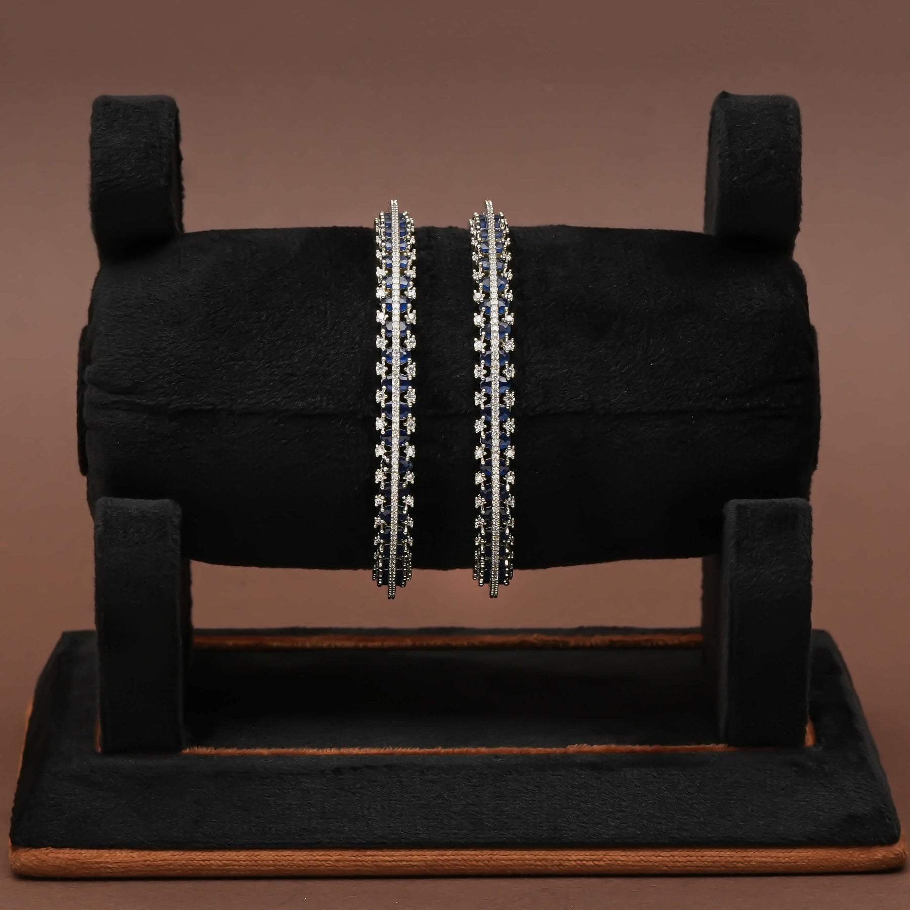 Elevate your style with these expertly handcrafted CZ Sapphire Bangles, featuring a stunning white gold finish. Each bangle is set with genuine CZ stones and semi-precious sapphires, offering exquisite brilliance and color. Designed with a secure side screw, they ensure effortless wear and a perfect fit. This one-of-a-kind design combines timeless elegance with meticulous craftsmanship, making it an exceptional addition to any jewelry collection.