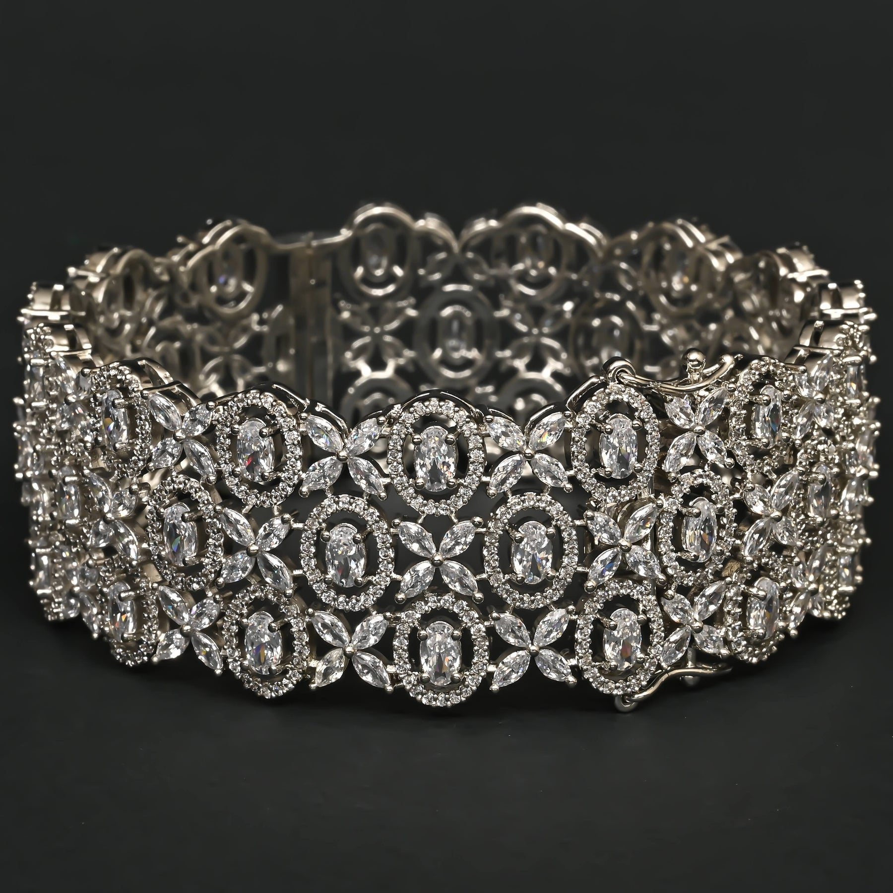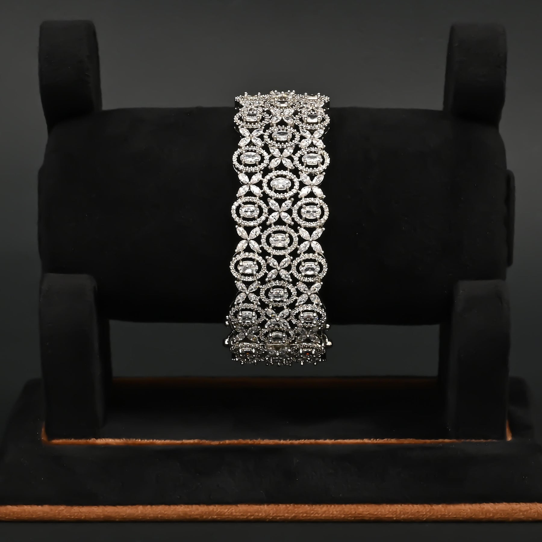 Elevate your elegance with this expertly handcrafted CZ White Gold Bangle, featuring dazzling real CZ stones that mimic the brilliance of diamonds. Its unique one-of-a-kind design is complemented by a discreet side screw, ensuring effortless wear and secure fitting. Finished in lustrous white gold, this bangle combines sophistication with practical ease for a timeless accessory that enhances any ensemble.