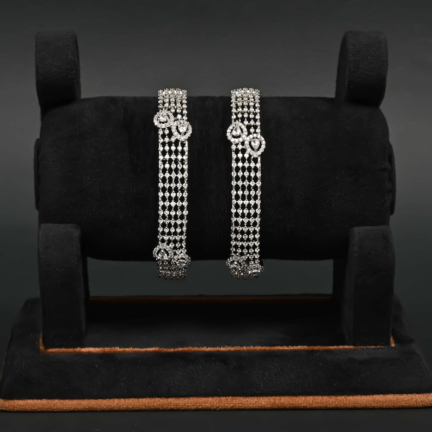These CZ White Gold Bangles are expertly handcrafted to showcase real cubic zirconia stones with a brilliant diamond-like sparkle. The elegant white gold finish enhances their sophisticated appeal. Featuring a convenient side clip, they offer easy wear and a secure fit. Each bangle is a unique, one-of-a-kind design combining timeless beauty with practical functionality.