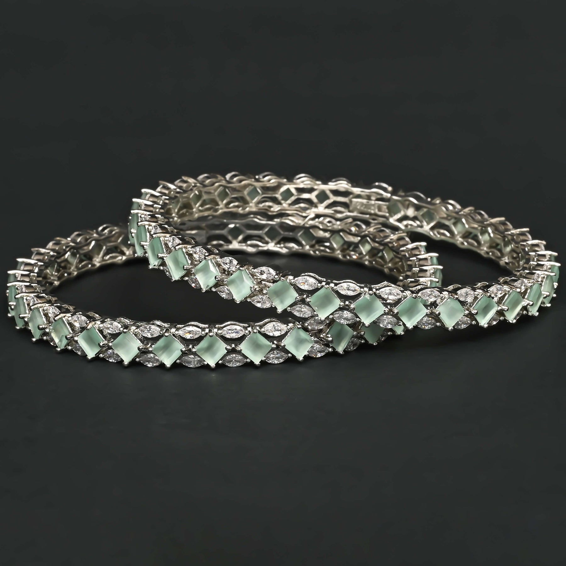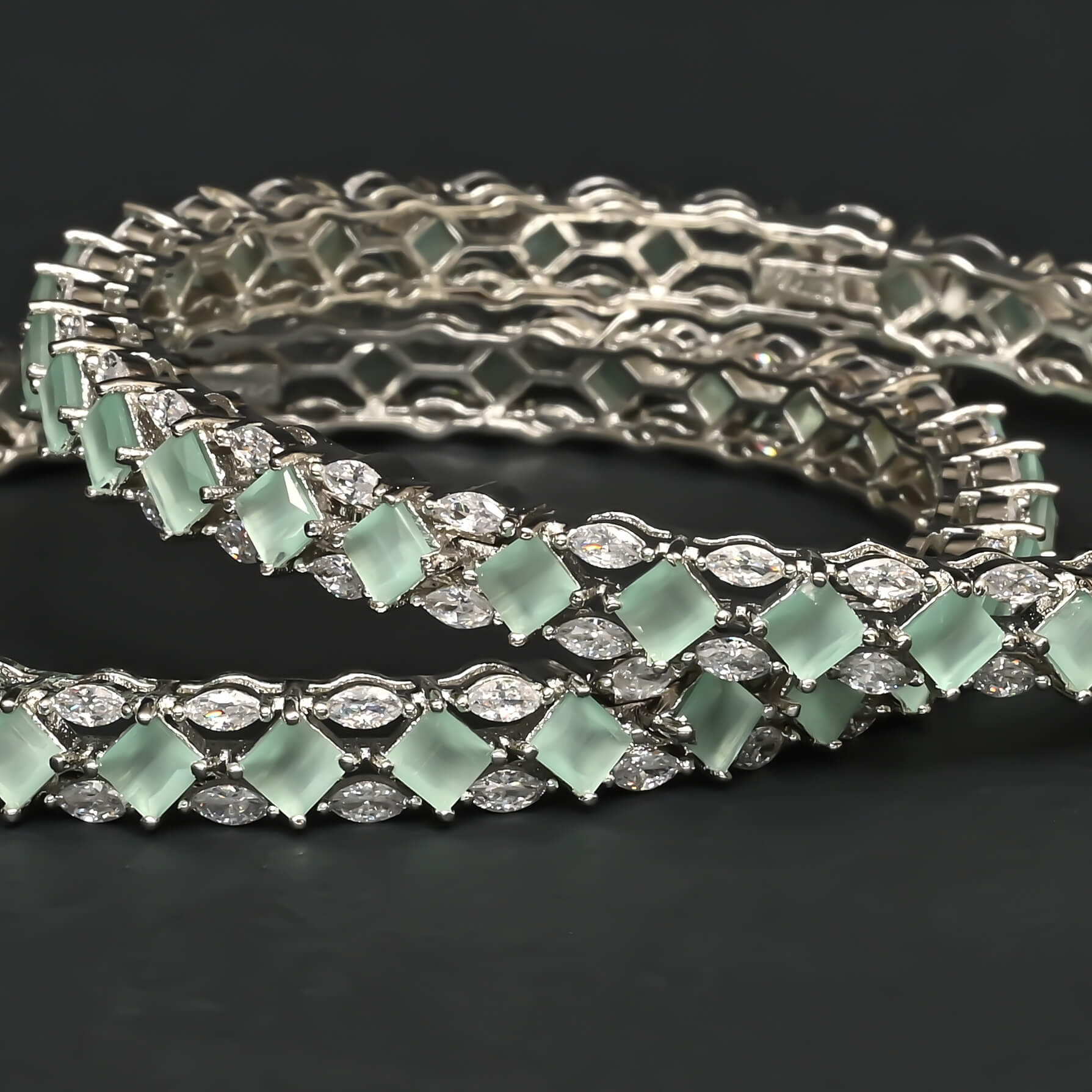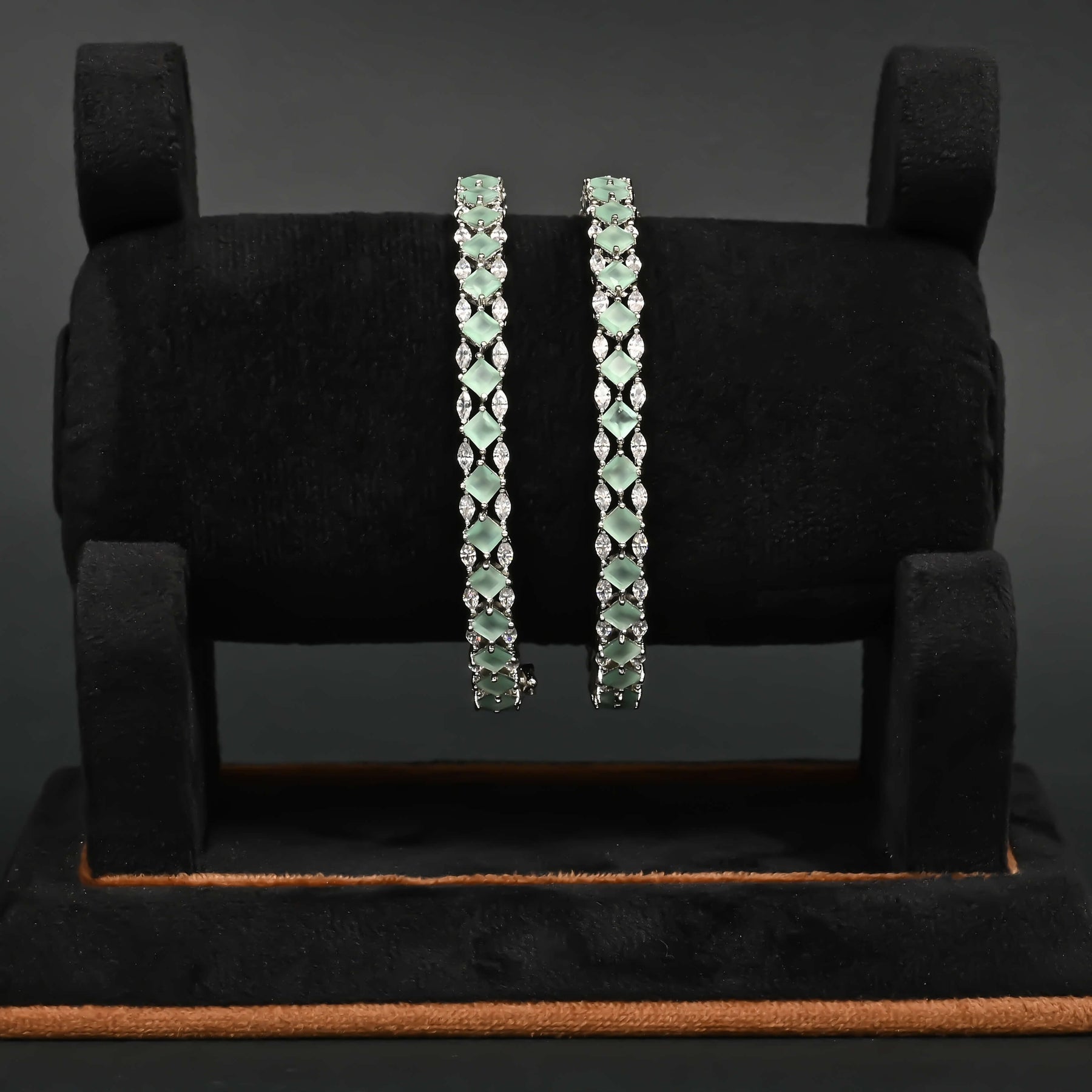 These handcrafted CZ White Gold Bangles showcase a unique design paired with authentic CZ stones and semi-precious mint stones that impart a refined diamond-like brilliance. Featuring a convenient side screw mechanism, they ensure easy wear without compromising elegance. Each piece is one of a kind, reflecting expert craftsmanship and meticulous attention to detail. Perfect for those seeking exquisite, durable jewelry with a sophisticated finish.