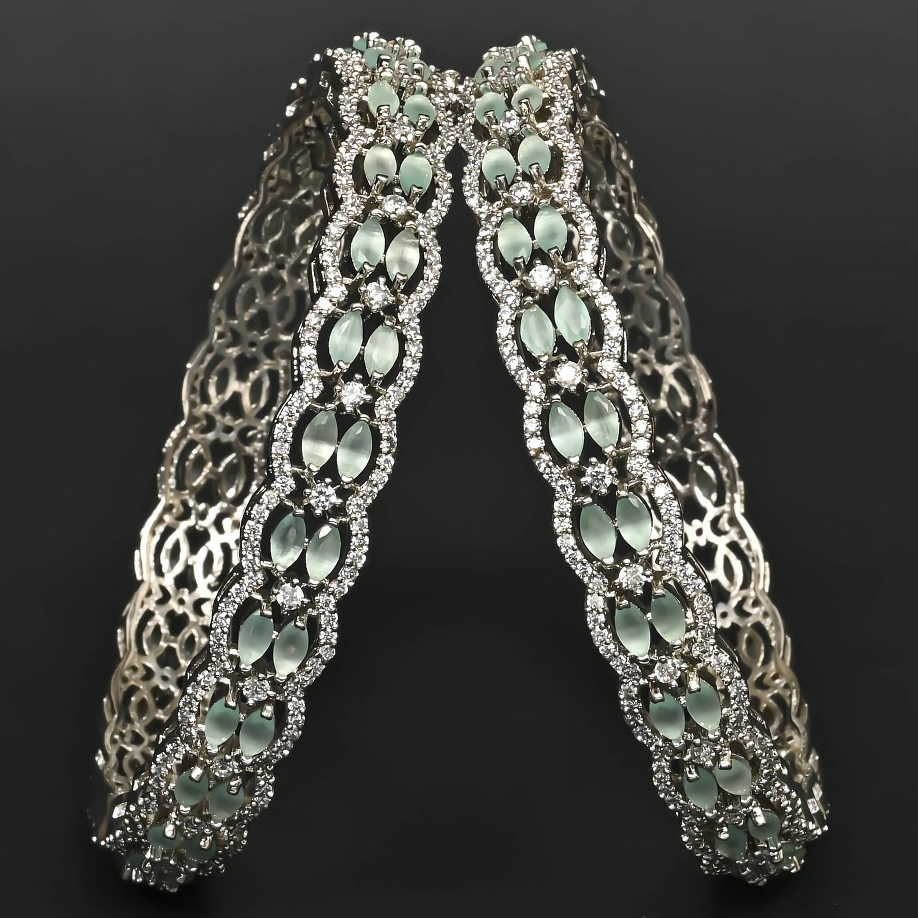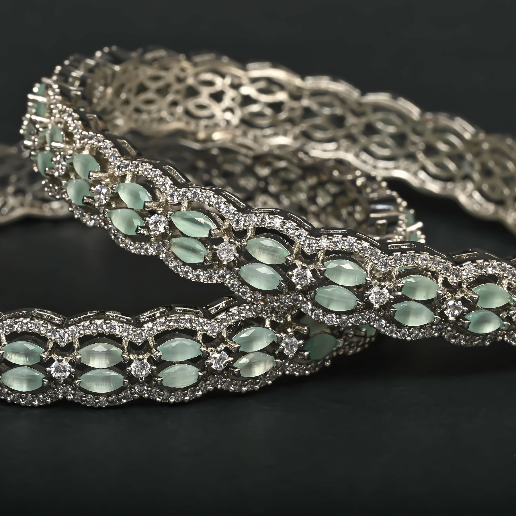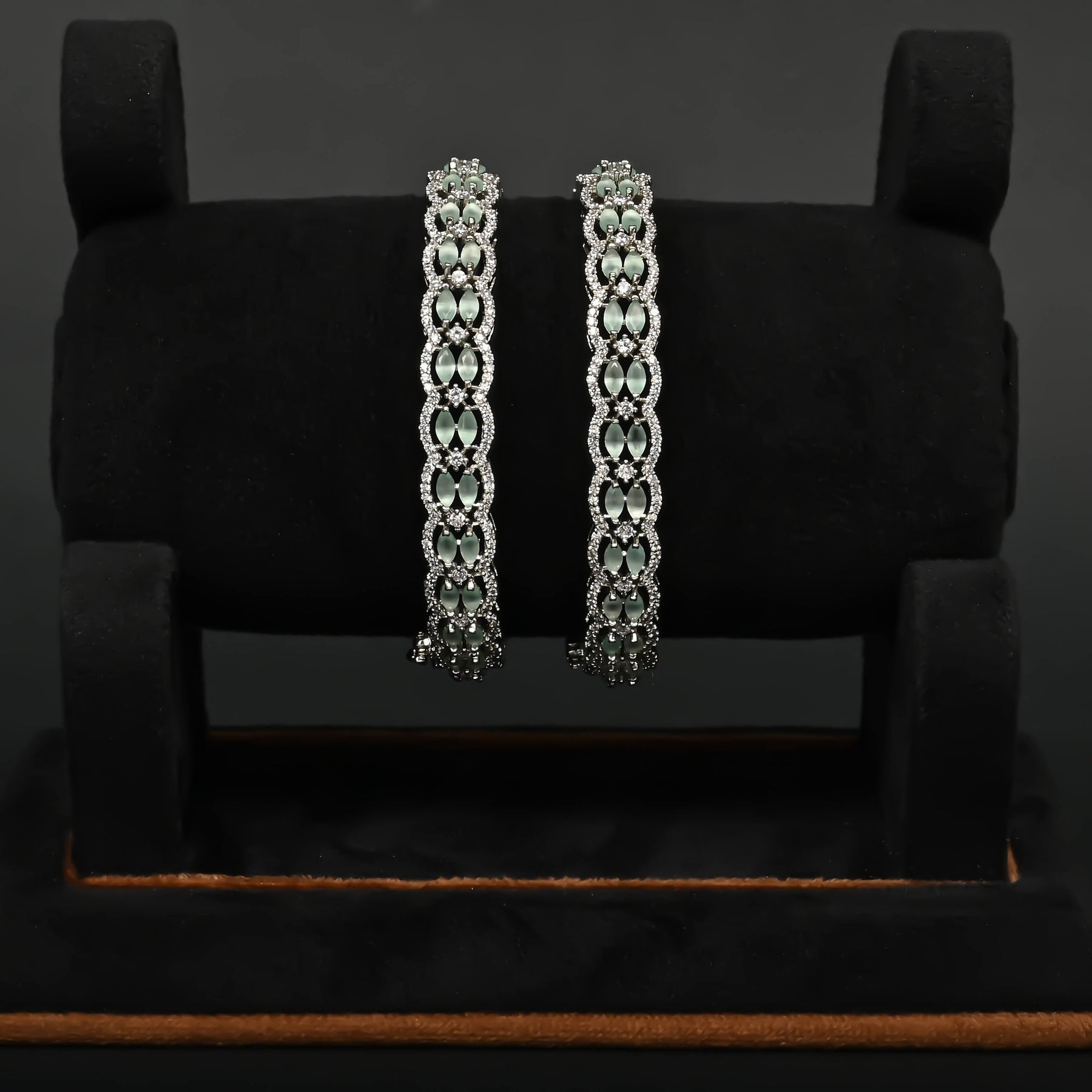 These CZ White Gold Bangles feature real cubic zirconia stones paired with semi-precious mint stones, offering the brilliance and elegance of diamonds at an accessible value. Expertly handcrafted with a unique, one-of-a-kind design, they include a convenient side screw for effortless wear. Perfect for those seeking refined style combined with lasting comfort.