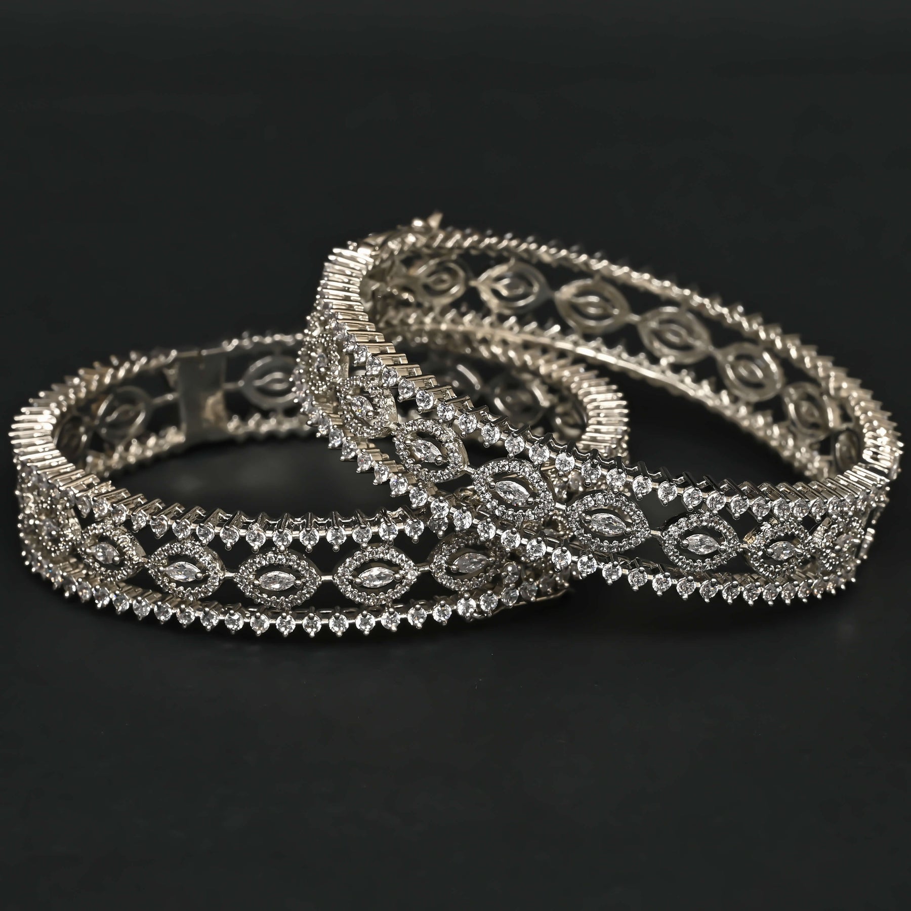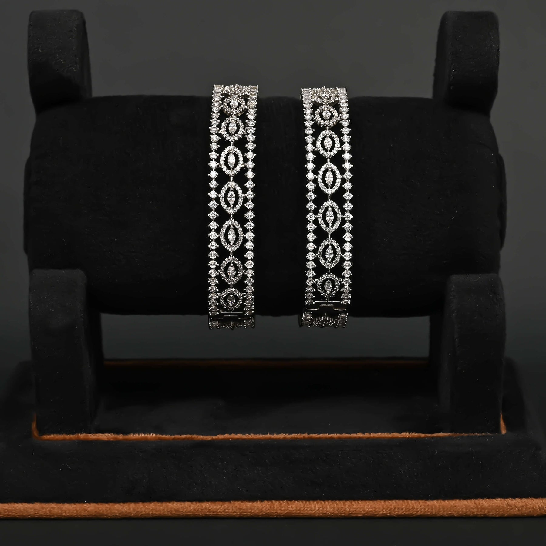 Elevate your elegance with these CZ White Gold Bangles, meticulously handcrafted to showcase dazzling real CZ stones that mimic the brilliance of diamonds. Featuring a unique one-of-a-kind design, the bangles include a convenient side screw for easy and secure wear. Their white gold finish adds a sophisticated shine, making them a timeless addition to any jewelry collection. Perfect for those seeking expert craftsmanship combined with stylish functionality.