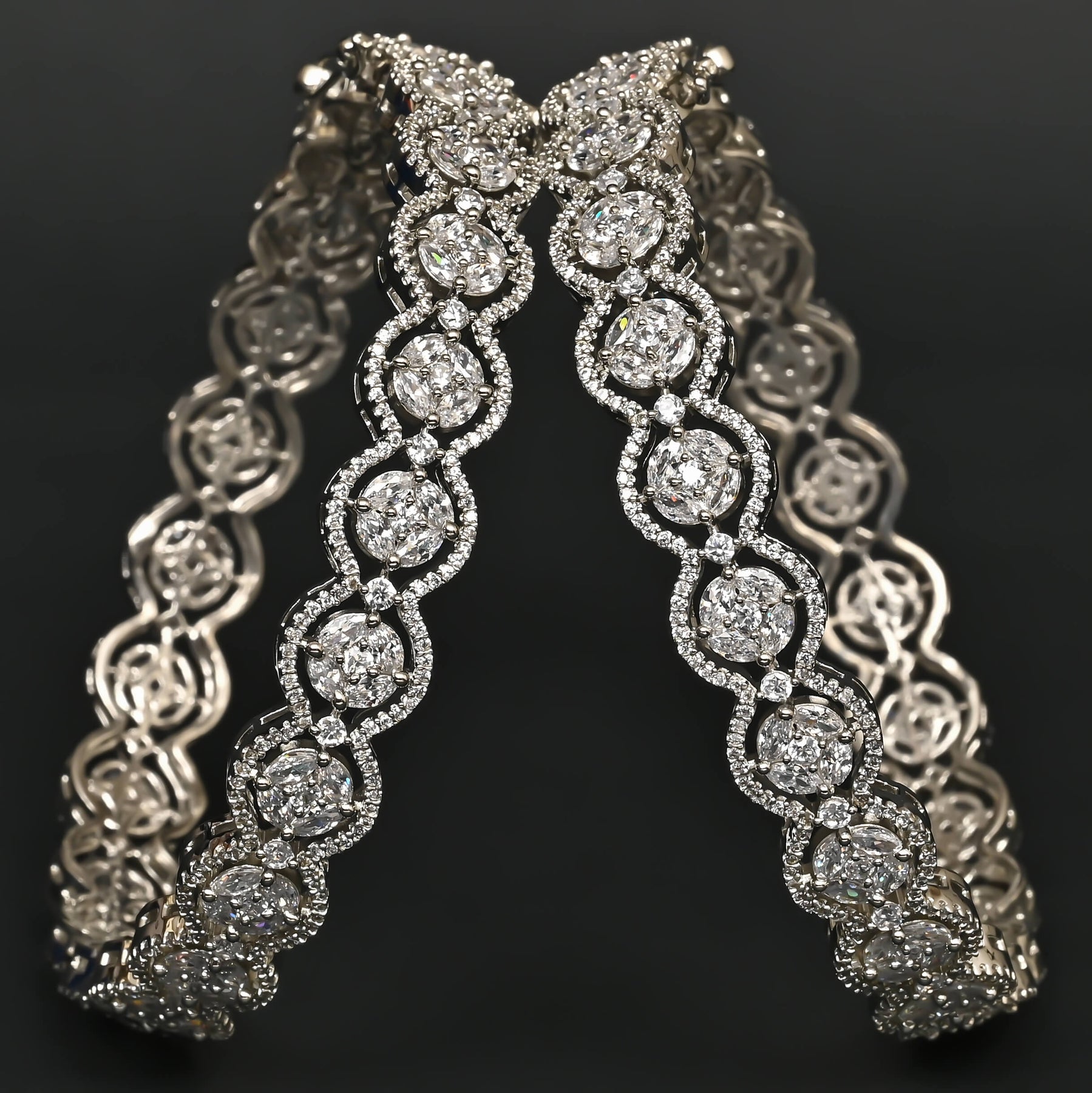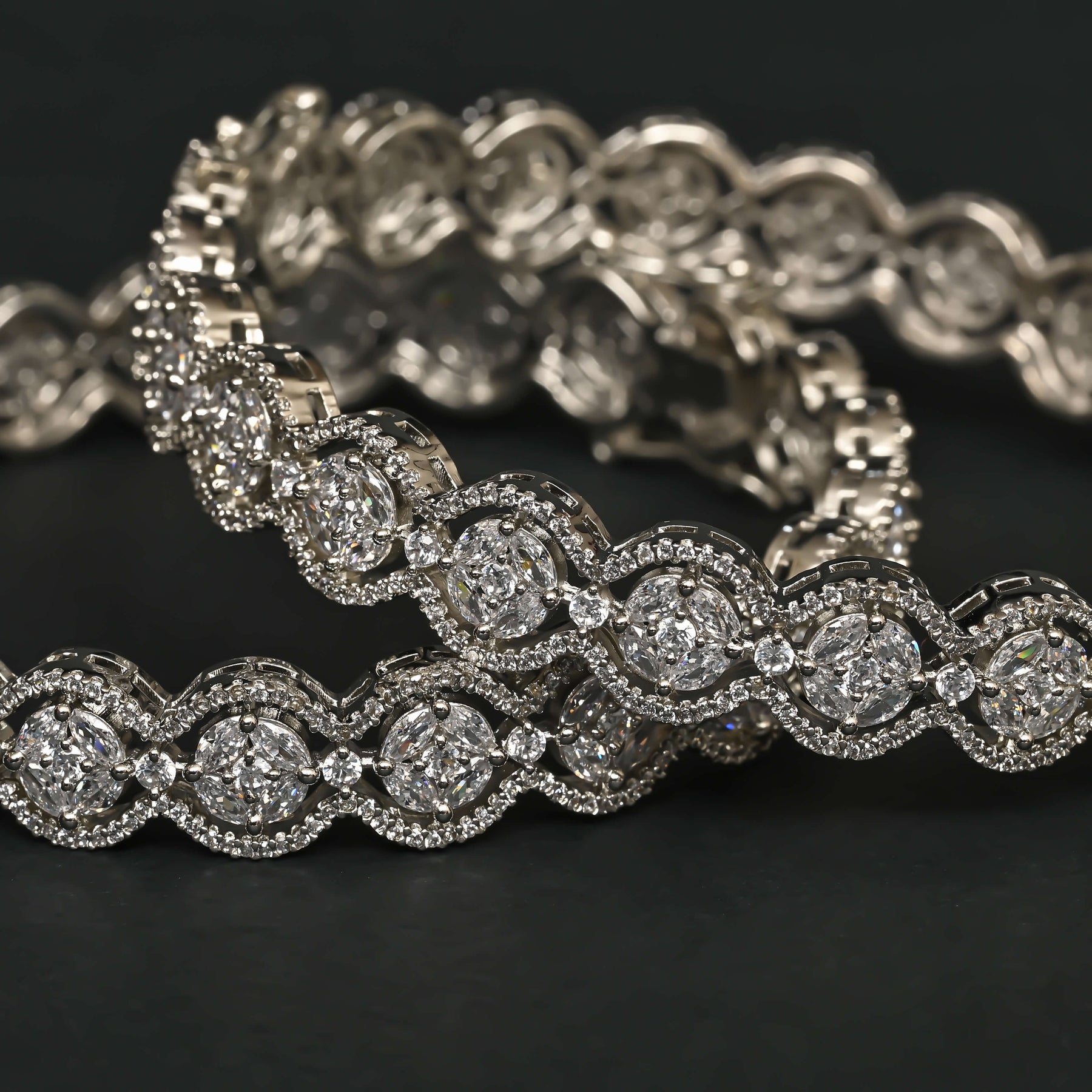 Experience elegance with these CZ White Gold Bangles, crafted with genuine CZ stones that mimic the brilliance of diamonds. Featuring a unique, handcrafted design, each bangle is one of a kind. The smart side screw mechanism allows for effortless wearing, combining style with practicality for a flawless fit.