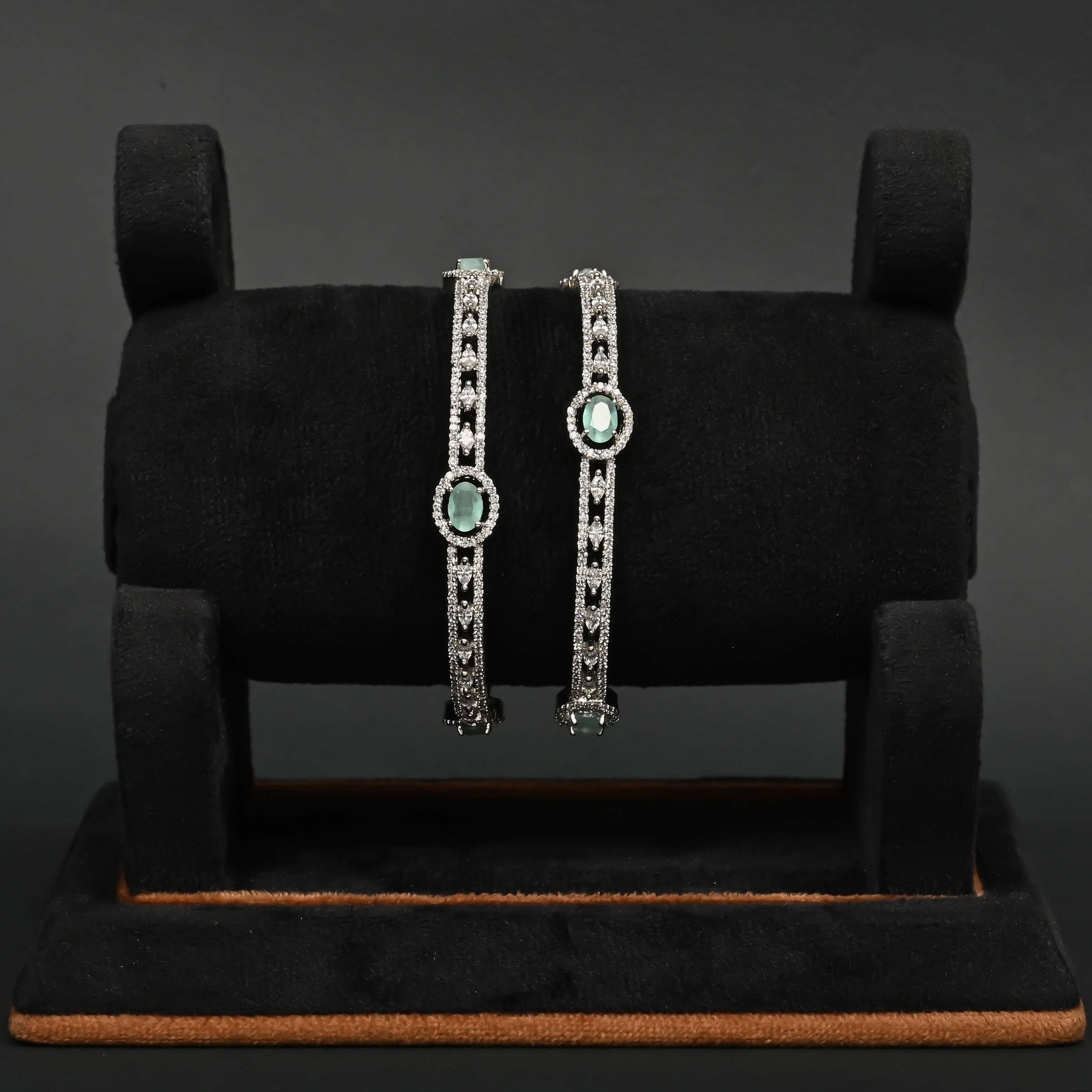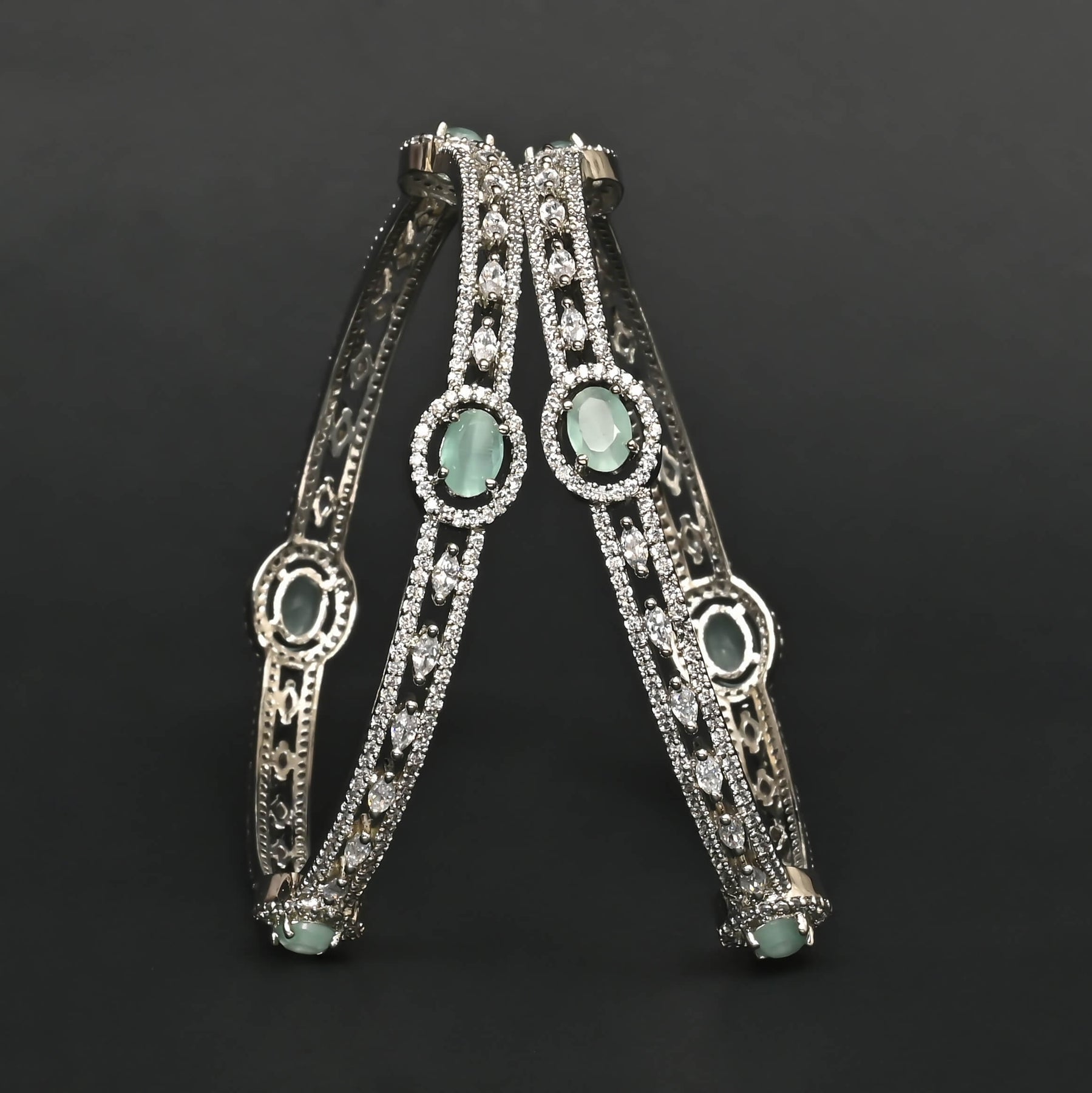 Experience elegance with these CZ White Gold Bangles, expertly handcrafted for a unique touch. Featuring genuine CZ stones and semi-precious mint stones, they offer refined sparkle and subtle color. The innovative side screw design ensures easy wear without compromising style. Perfect for those who appreciate one-of-a-kind craftsmanship and sophisticated sophistication.