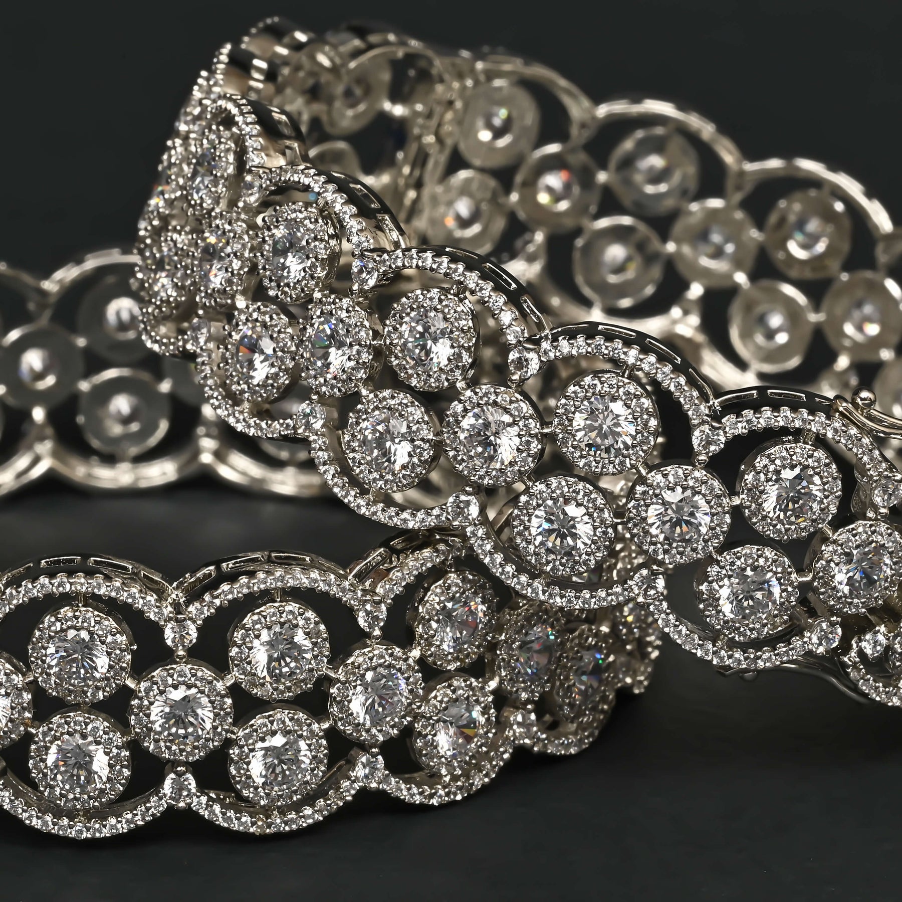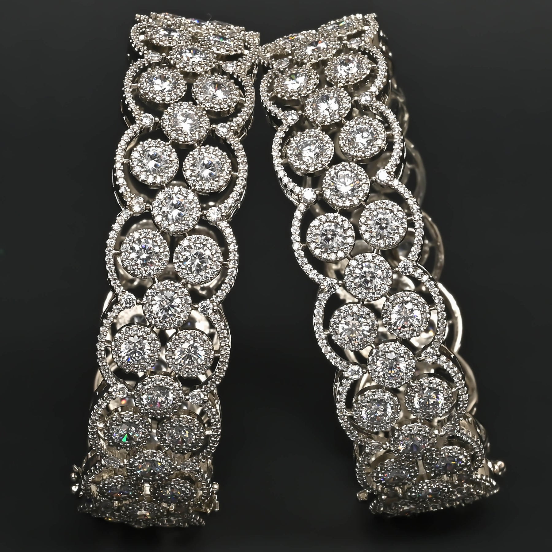 Elevate your elegance with these CZ White Gold Bangles, expertly handcrafted to showcase a unique, one-of-a-kind design. Featuring sparkling real CZ stones that mimic the brilliance of diamonds, these bangles offer timeless sophistication. The innovative side screw mechanism ensures effortless wear and a secure fit, combining style with practicality in every piece. Perfect for those who appreciate meticulous craftsmanship and refined jewelry.
