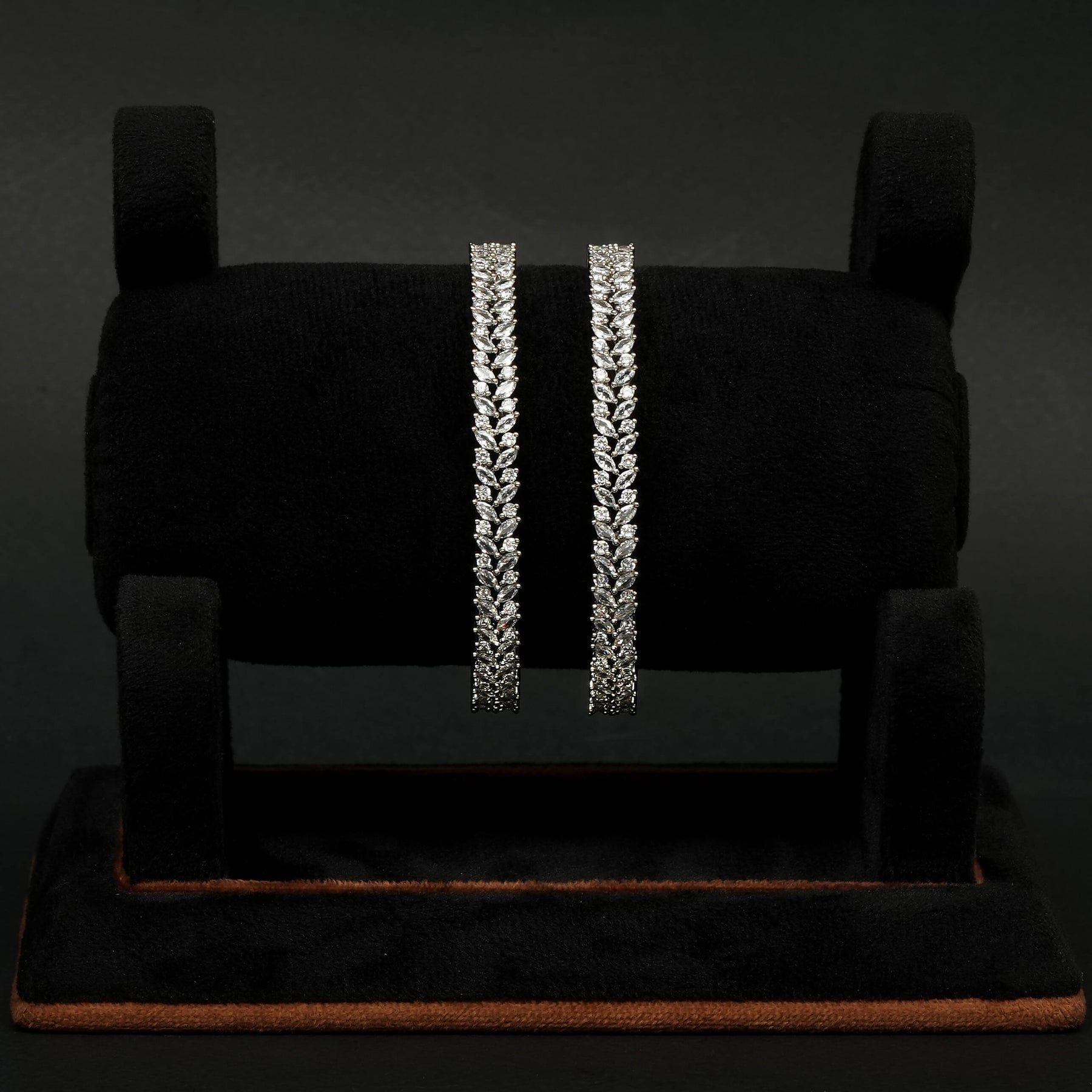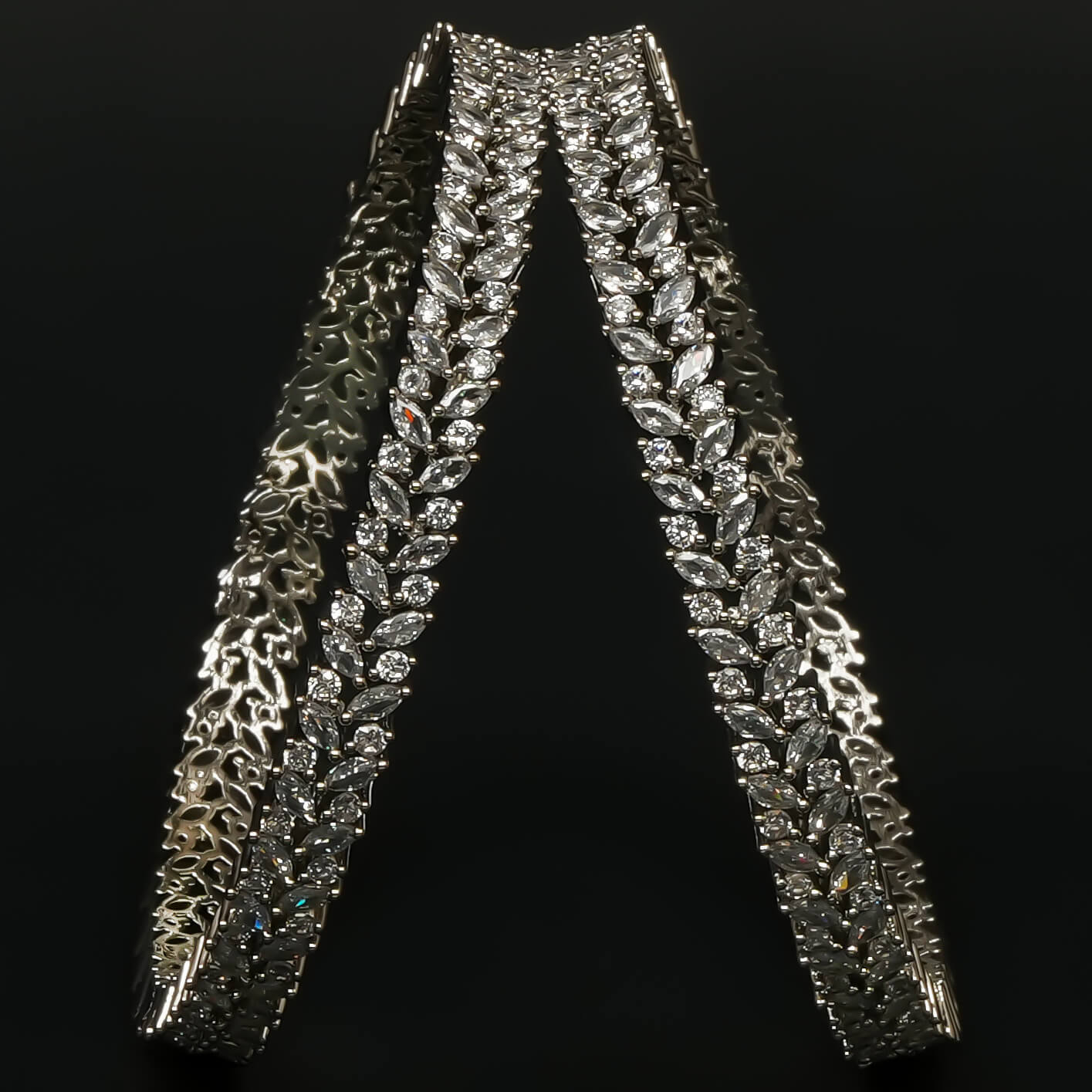 These CZ white gold bangles feature expertly handcrafted designs, showcasing genuine cubic zirconia stones for lasting brilliance. The unique one-of-a-kind design is complemented by a convenient side screw mechanism, ensuring easy and secure wear. Perfectly blending elegance with functionality, these bangles make a refined addition to any collection.