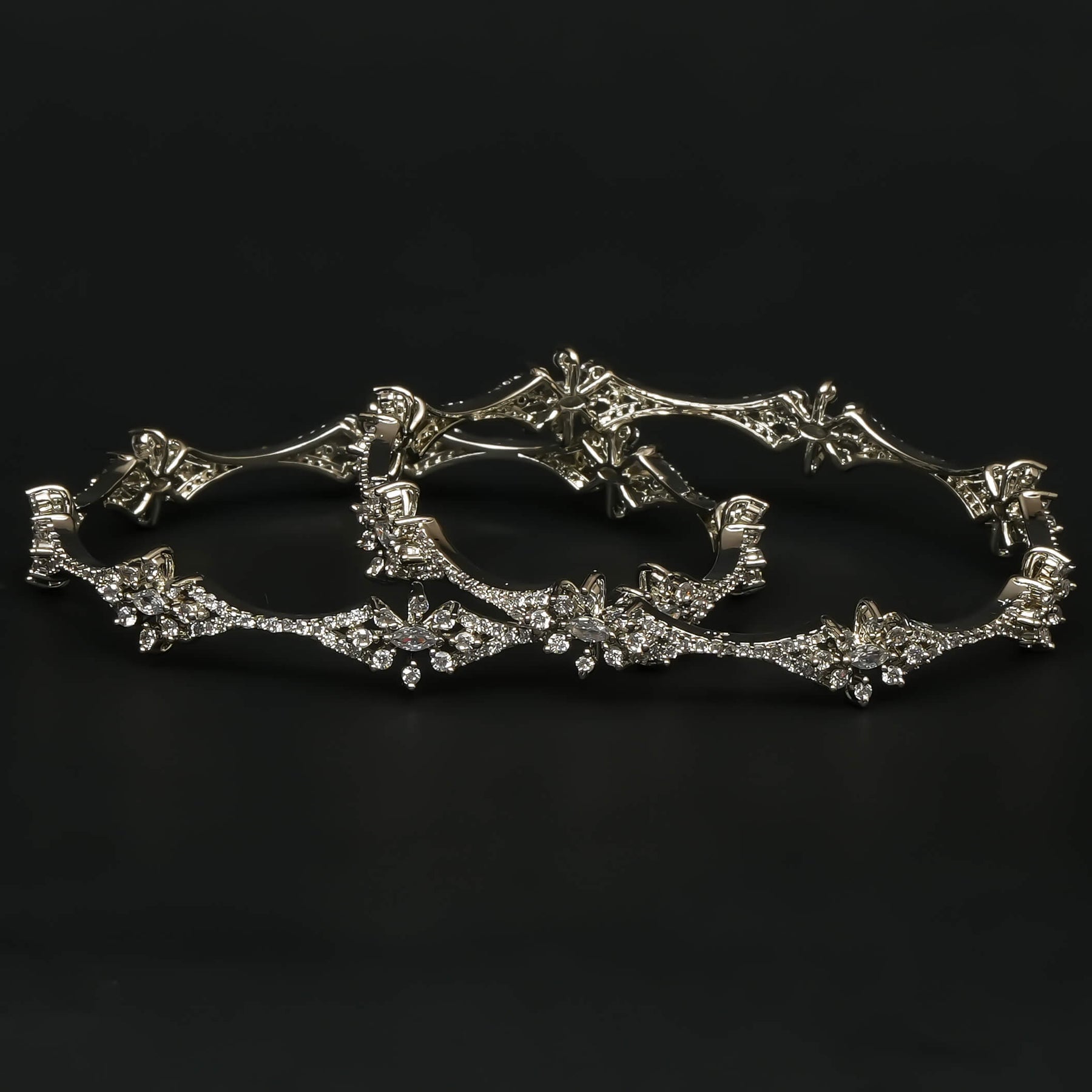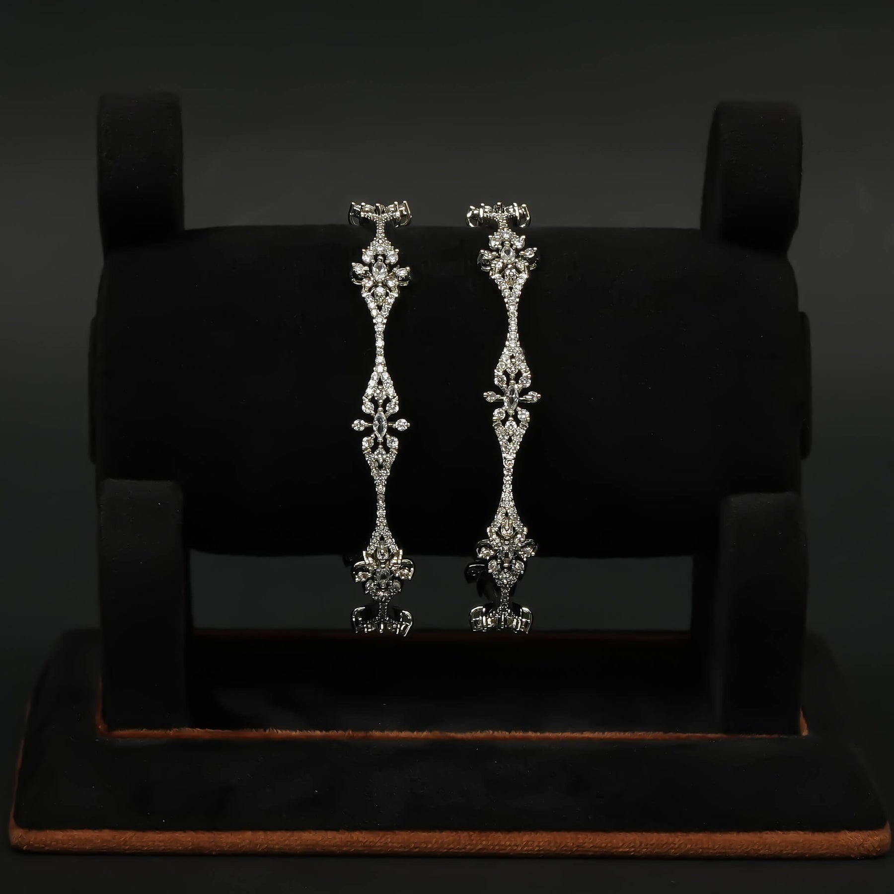 Elevate your elegance with these handcrafted CZ White Gold Bangles, featuring genuine cubic zirconia stones that offer a brilliant sparkle. Designed with a unique one-of-a-kind pattern, they include a convenient side screw mechanism for effortless wear and secure fit. Perfectly blending craftsmanship with sophistication, these bangles make a refined statement for any occasion.