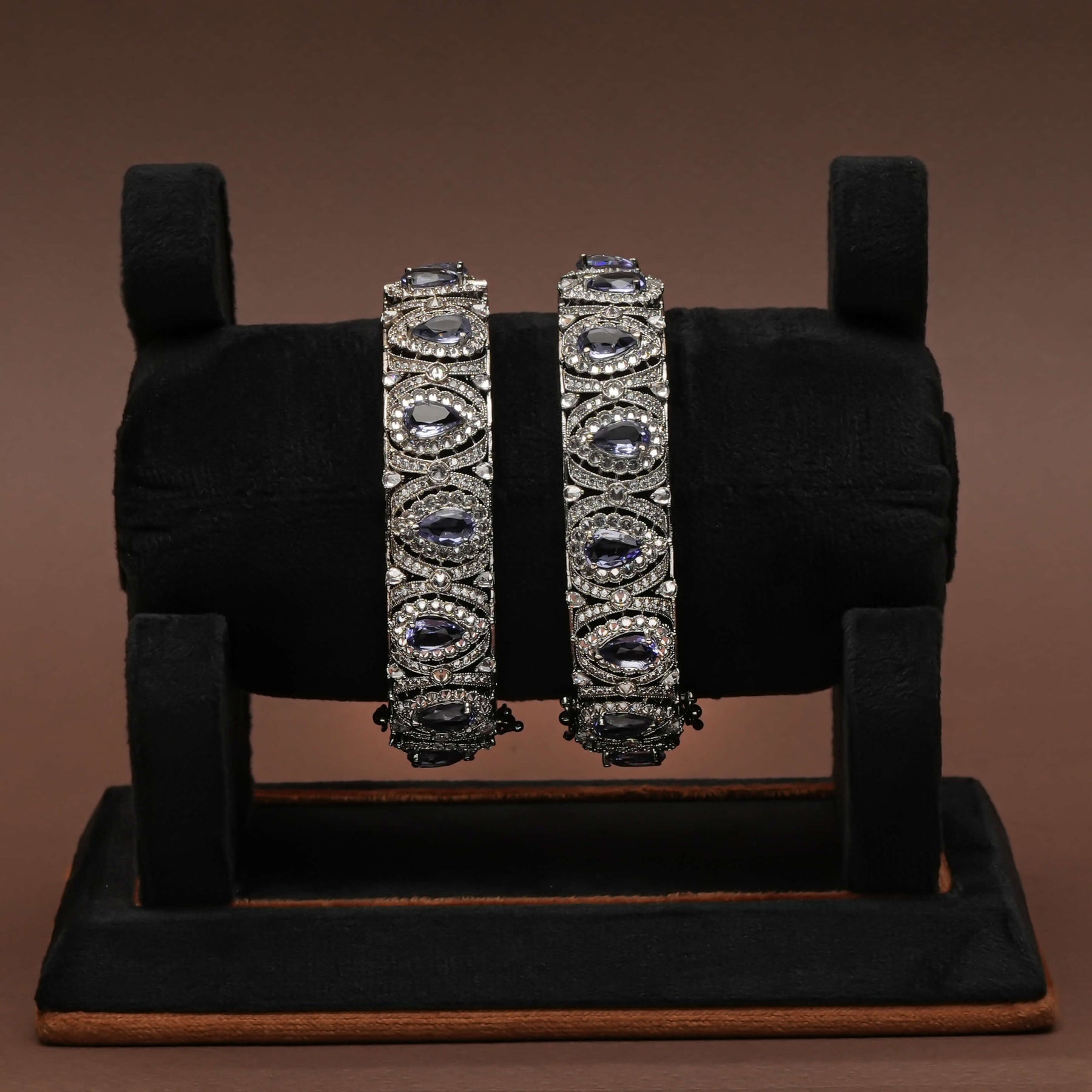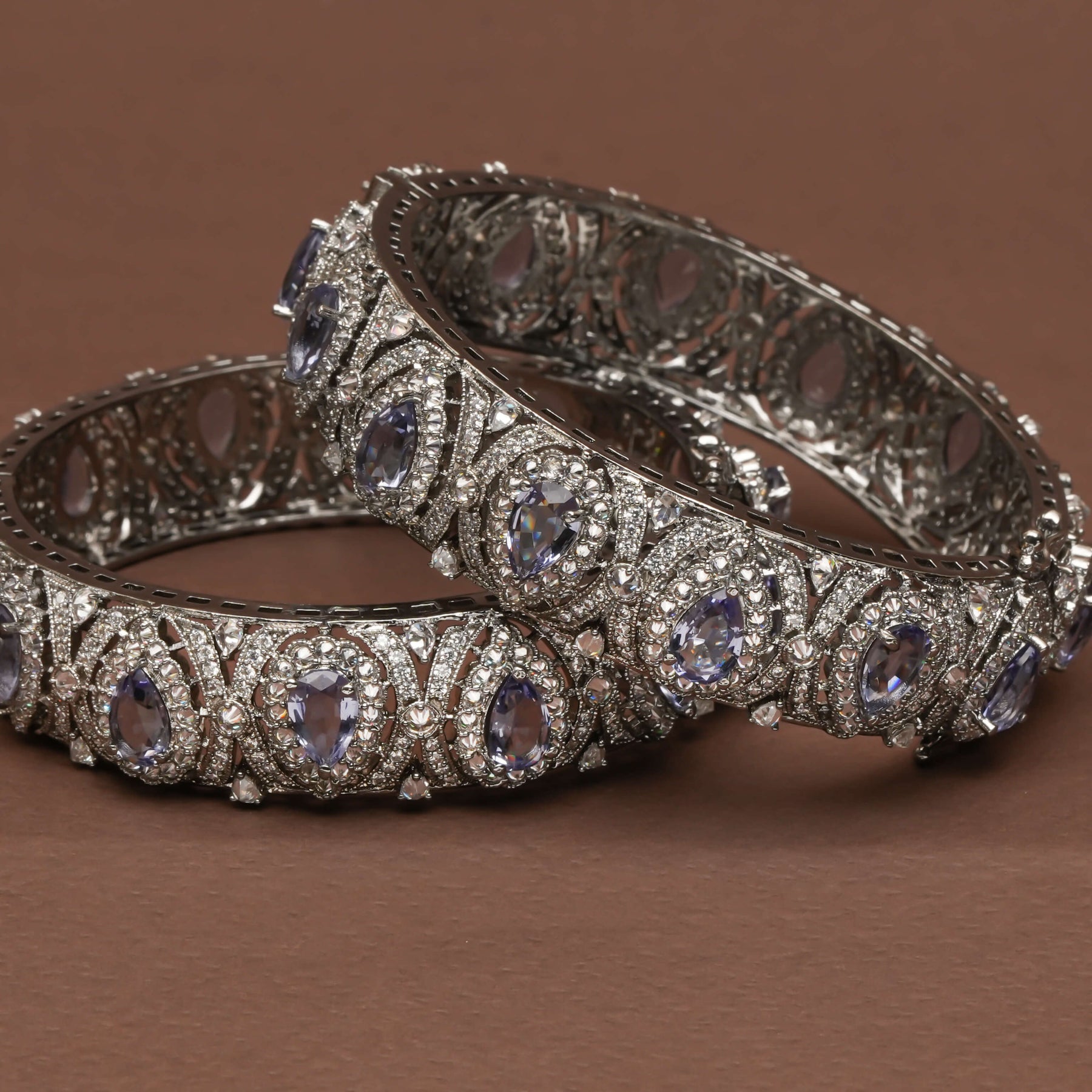 Experience elegance with these CZ White Gold Bangles, expertly handcrafted to showcase real cubic zirconia stones alongside semi-precious purple accents. The unique one-of-a-kind design features a convenient side screw, ensuring easy wear without compromising style. Perfect for adding a refined touch to any outfit, these bangles combine craftsmanship and sophistication seamlessly.