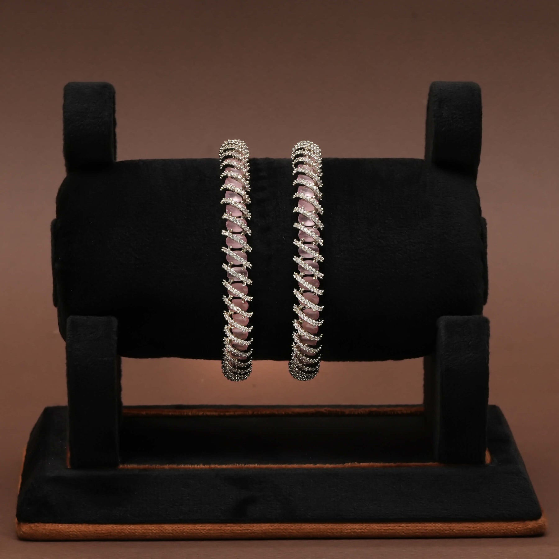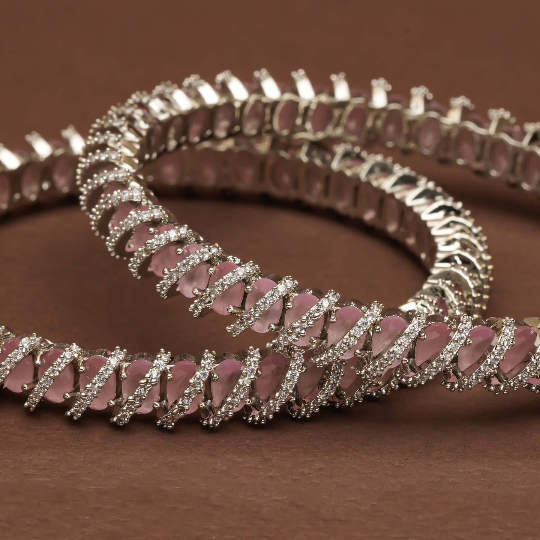 Experience elegance with these CZ White Gold Bangles, expertly handcrafted to showcase real CZ stones paired with semi-precious pink stones. The unique design features a side screw closure, ensuring easy and secure wear. Crafted with precision, each bangle offers a one-of-a-kind aesthetic that blends sophistication with everyday comfort. Perfect for those seeking timeless style with a modern touch.