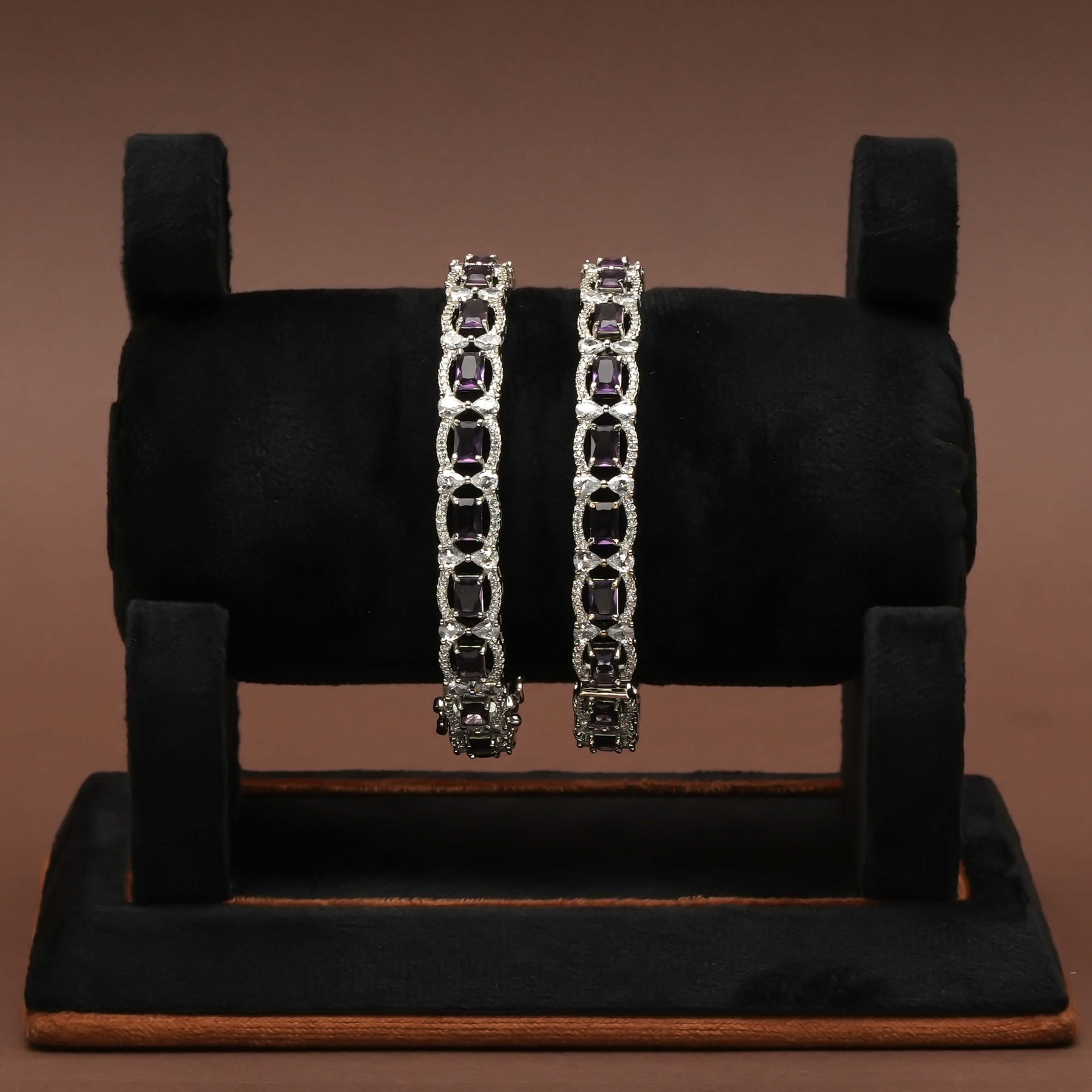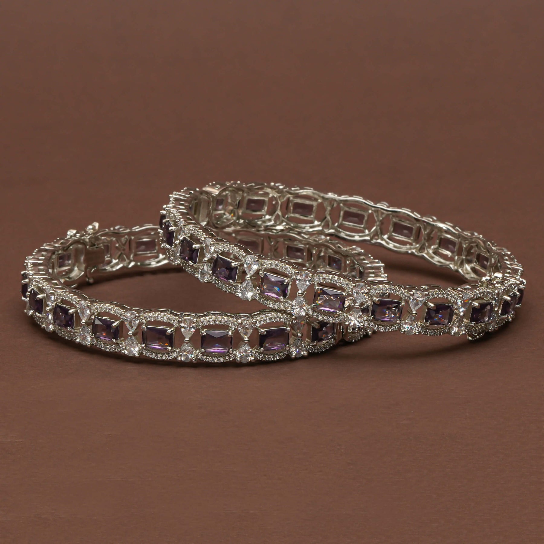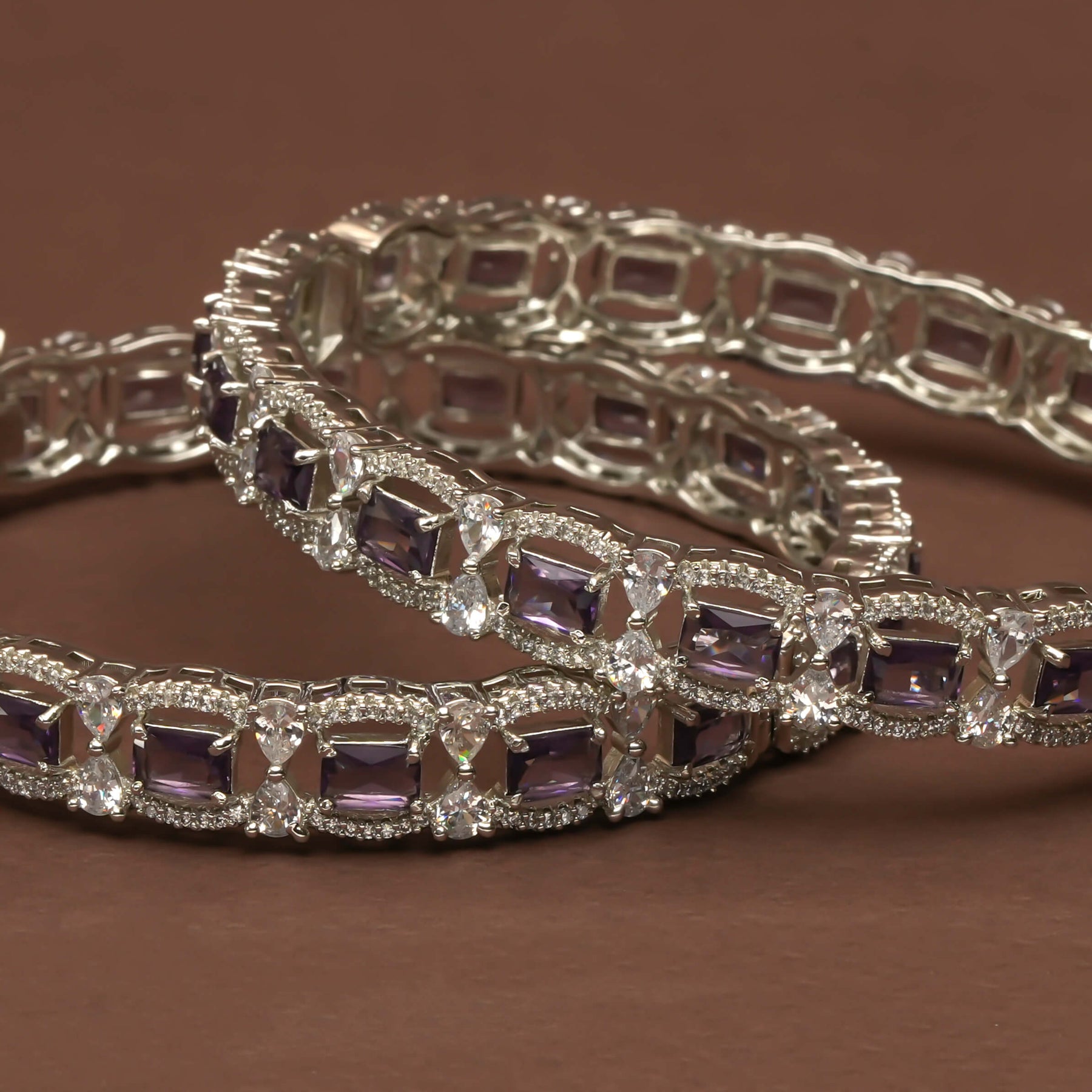 These CZ white gold finish bangles feature meticulously handcrafted designs that showcase genuine CZ stones alongside semi-precious purple accents. Equipped with a secure side screw mechanism, they offer effortless wearability while maintaining a distinctive, one-of-a-kind elegance. Ideal for those seeking refined craftsmanship combined with sophisticated style.