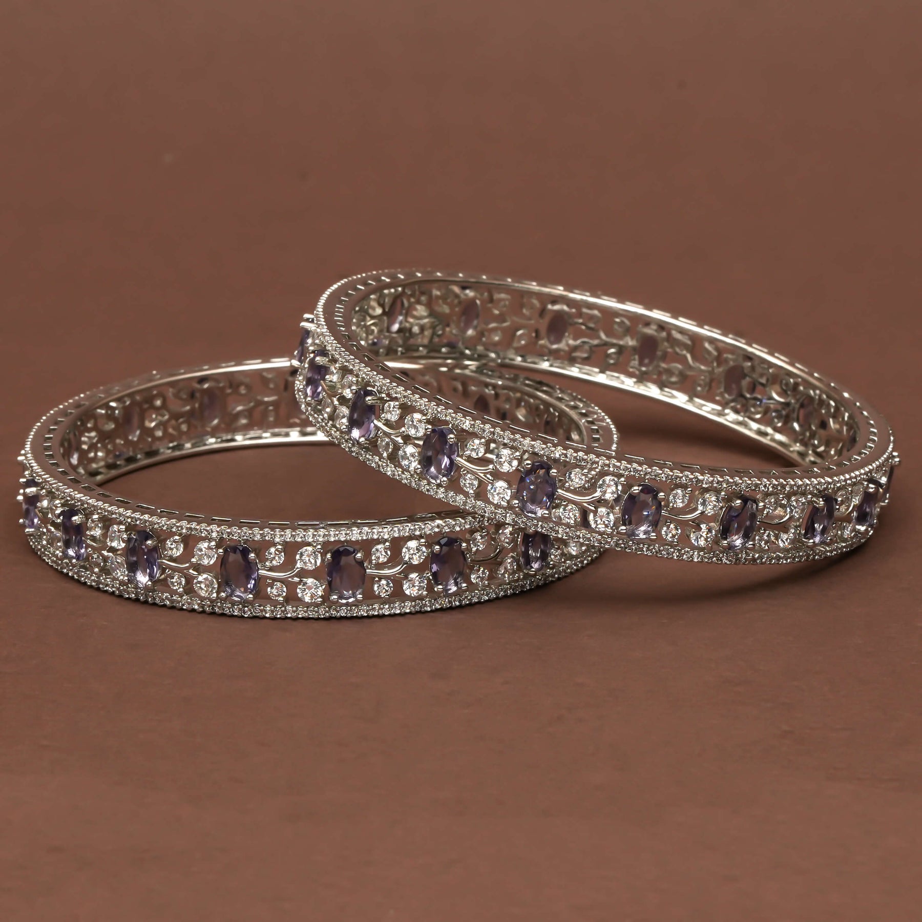 These CZ White Gold Bangles feature a unique handcrafted design that combines the brilliance of real cubic zirconia stones with the elegance of semi-precious purple stones. Crafted in a white gold finish, they offer both luxury and durability. A convenient side screw ensures easy wear without compromising style, making these bangles a distinctive addition to any collection.