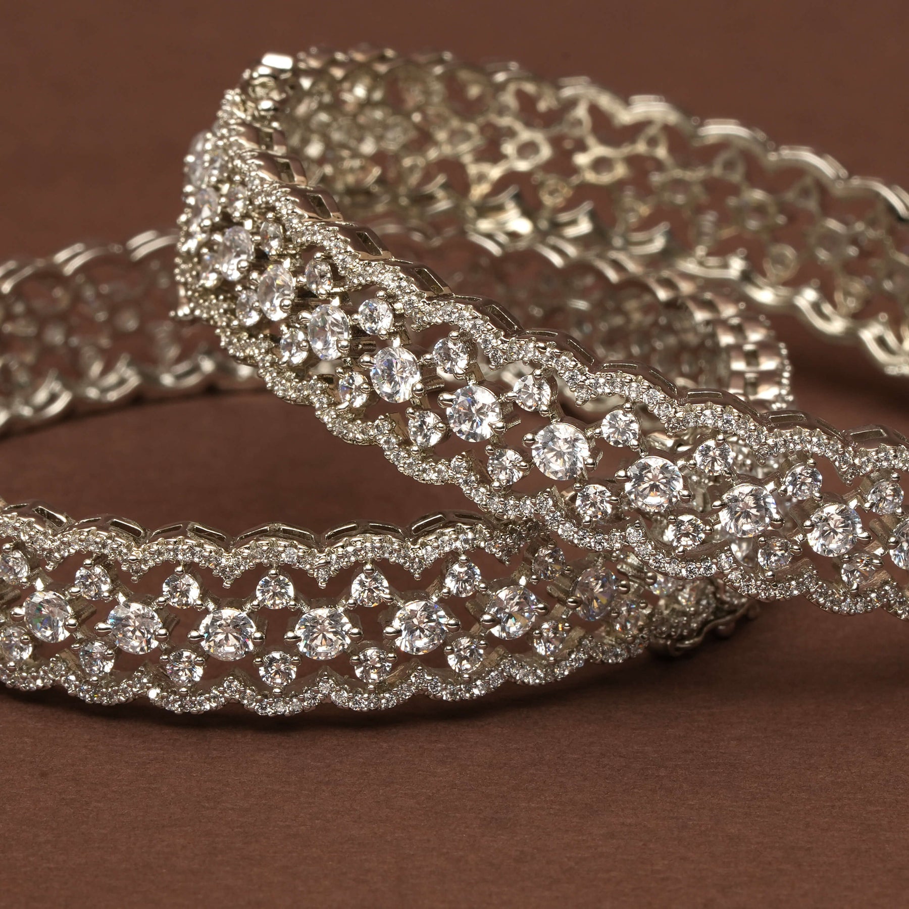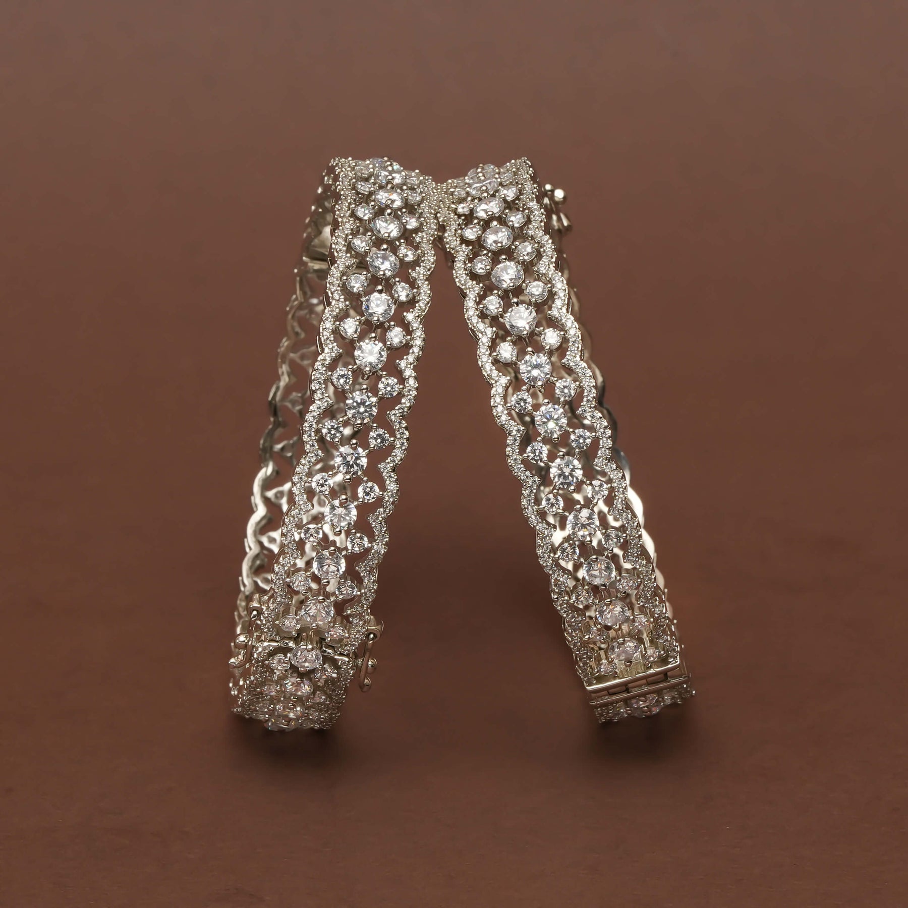These CZ White Gold Bangles feature a sophisticated white gold finish and are adorned with genuine CZ stones for lasting brilliance. Expertly handcrafted, each piece includes a discreet side screw mechanism for effortless wearing and removal. The unique design ensures a distinctive look, combining elegance with practicality for refined everyday wear.