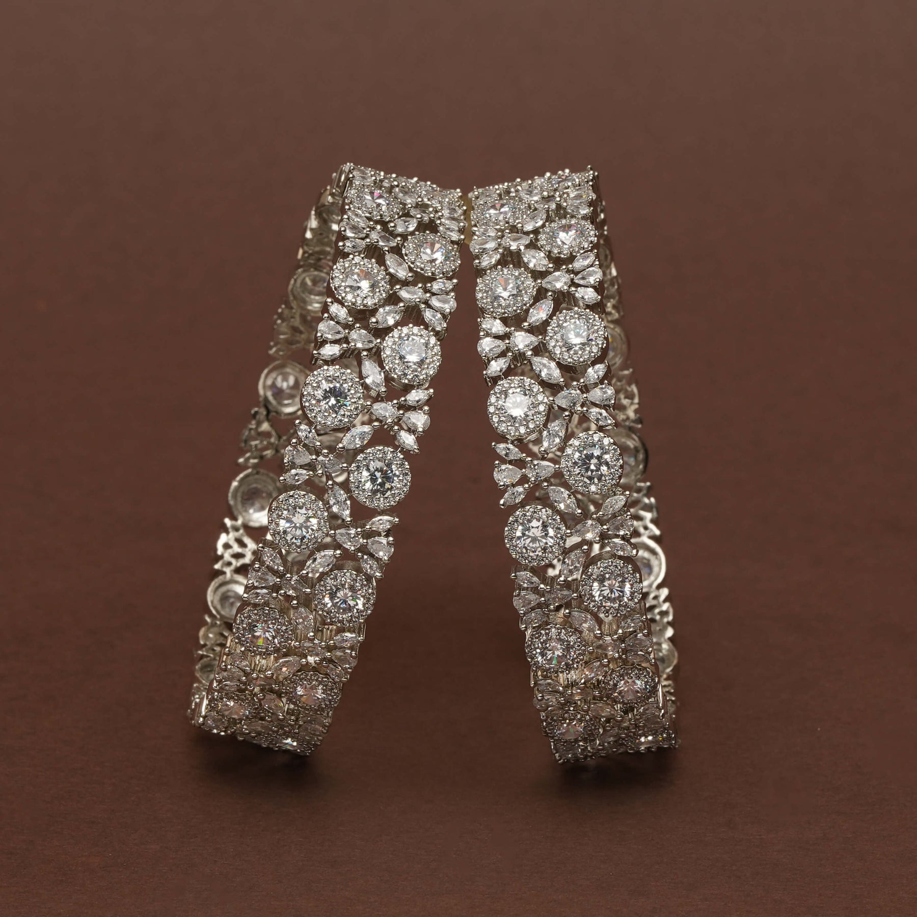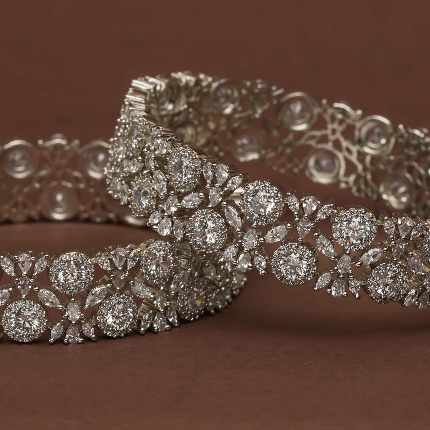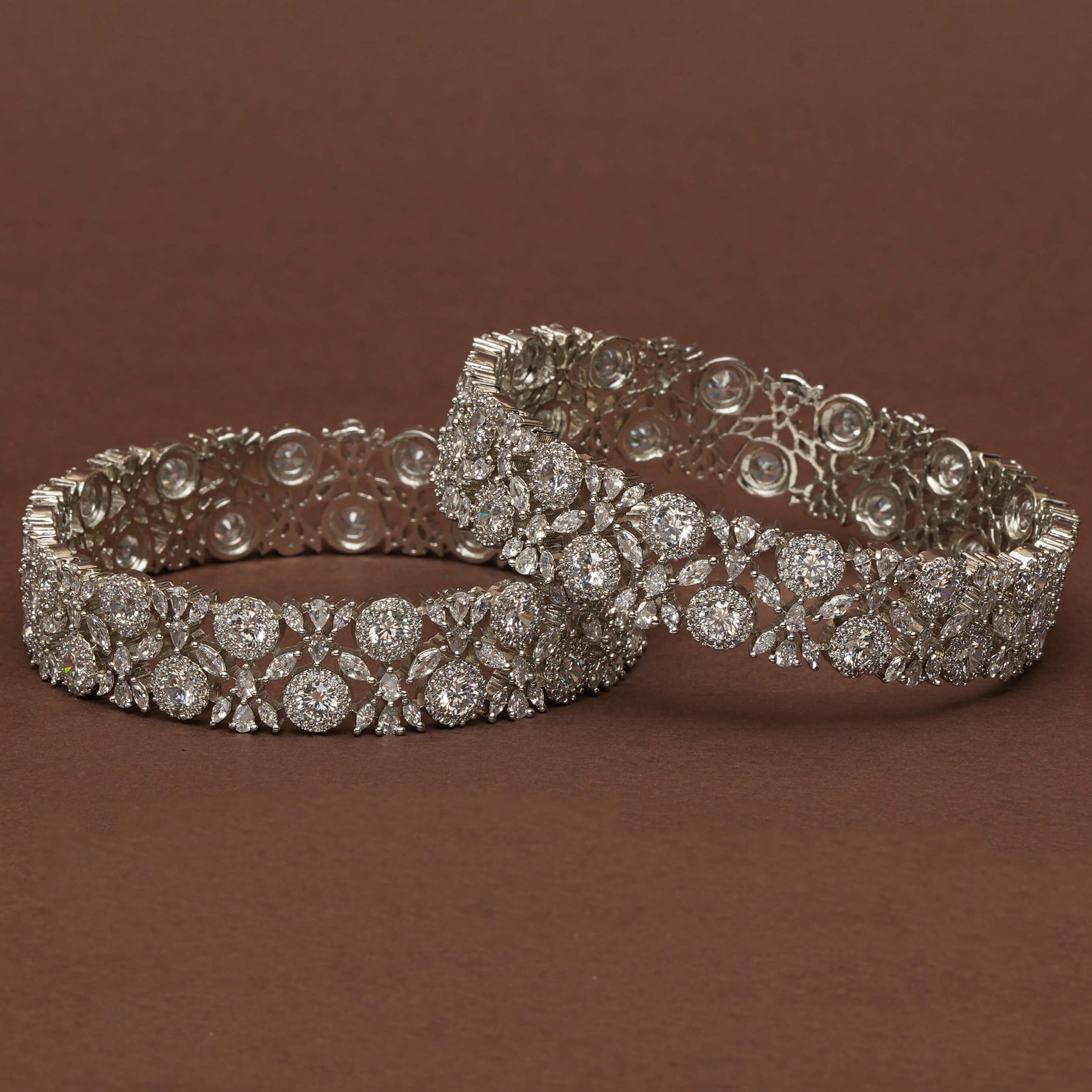 These CZ White Gold Bangles combine the brilliance of authentic cubic zirconia stones with expert handcrafted artistry. Designed with a white gold finish, each bangle features a unique one-of-a-kind pattern and a practical side screw closure for easy and secure wear, offering both sophistication and convenience.