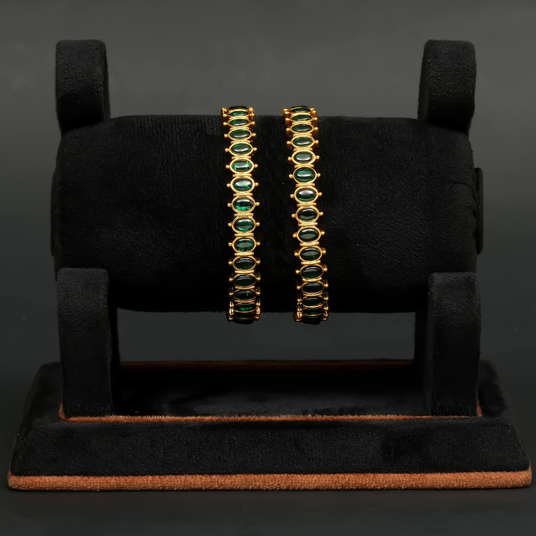 Elevate your elegance with these handcrafted emerald gold finish bangles, featuring genuine semi-precious emerald stones and sparkling CZ accents. Designed for convenience, the side screw ensures easy wear without compromising style. Each bangle boasts a one-of-a-kind design, reflecting expert craftsmanship and timeless sophistication. Perfect to add a refined touch to any ensemble.