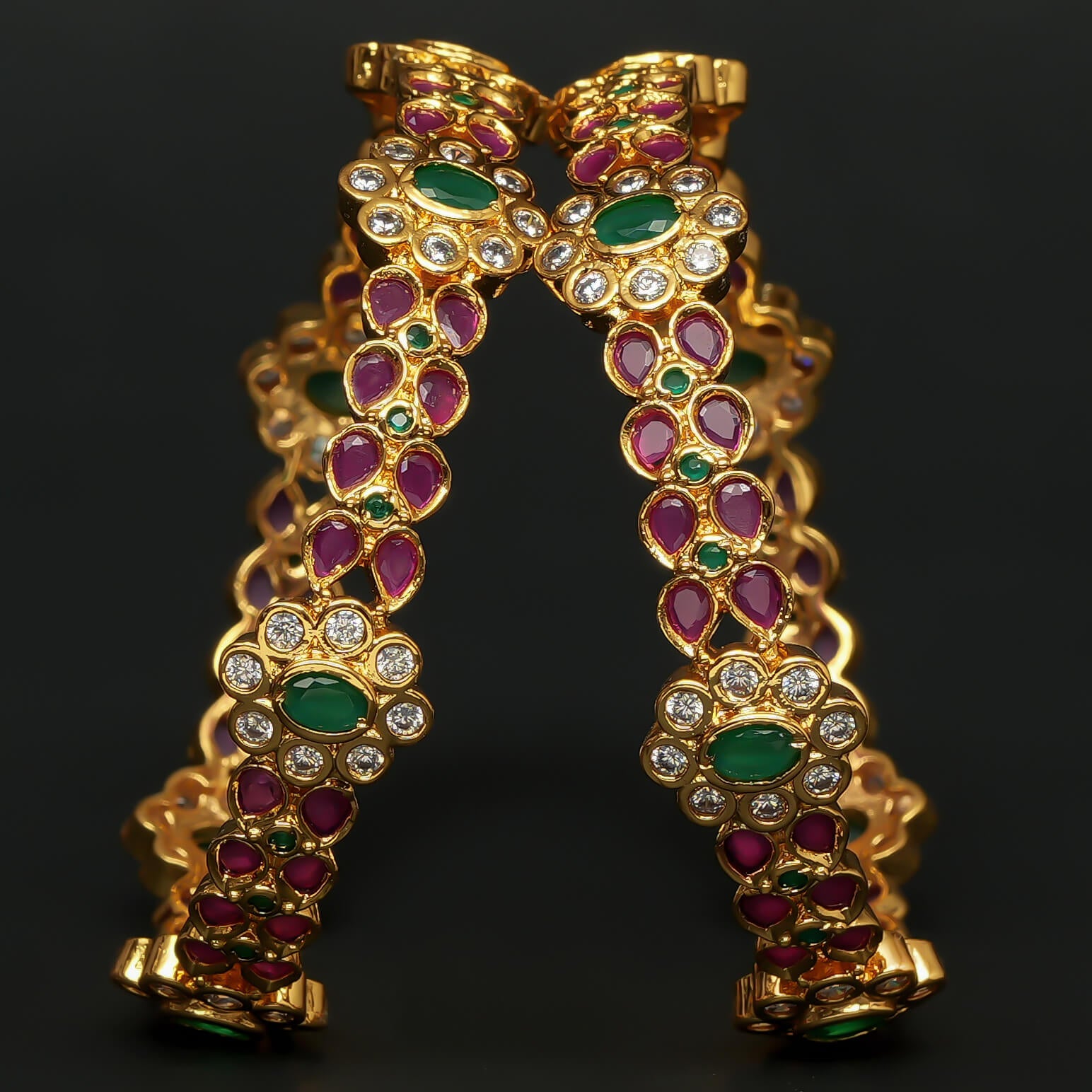 These gold finish bangles showcase expert craftsmanship with real CZ stones paired elegantly with semi-precious ruby and emerald accents. Handcrafted for a unique, one-of-a-kind design, each bangle features a side screw mechanism for effortless wear and secure fit. Perfect for those seeking timeless elegance combined with practical functionality.