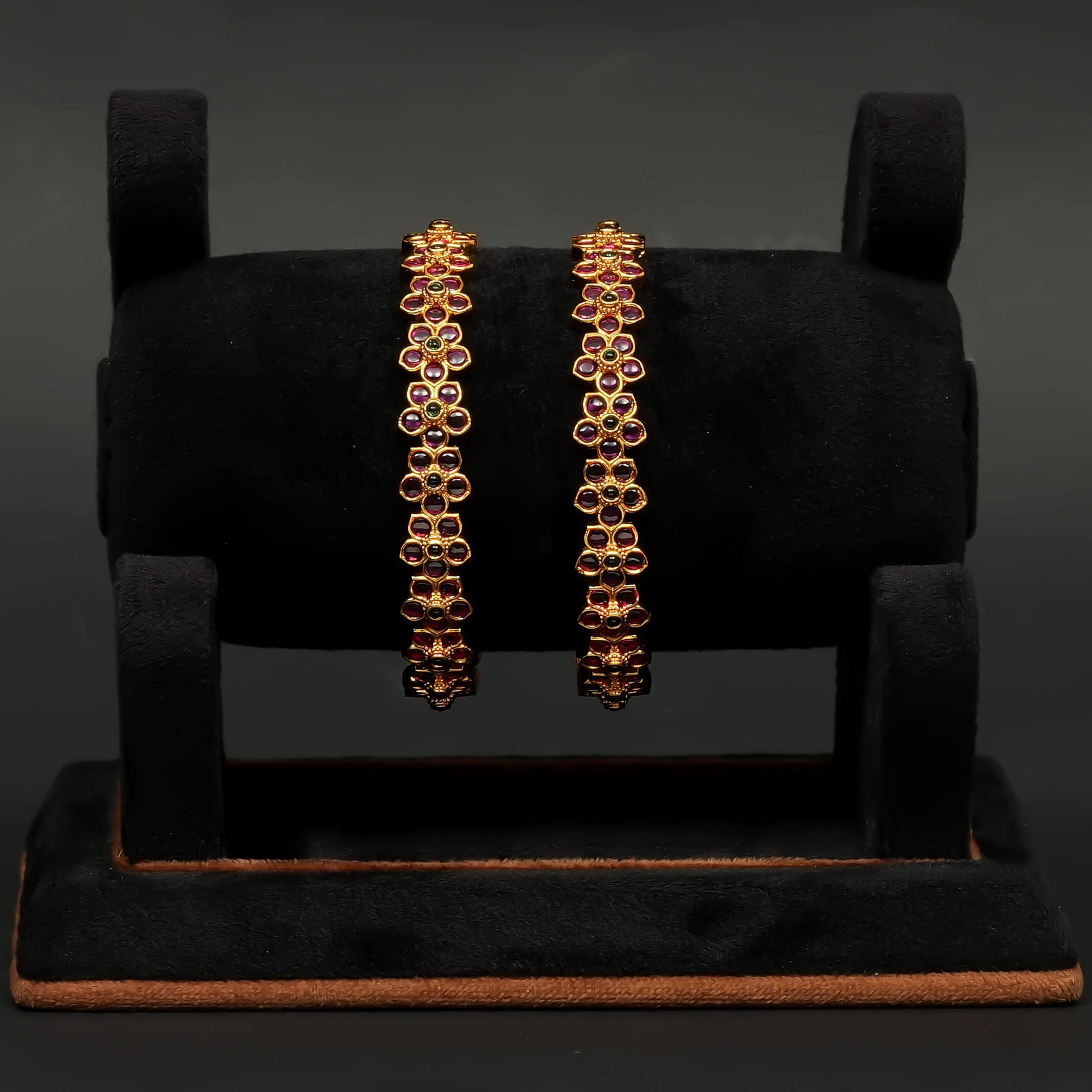 Elevate your elegance with these expertly handcrafted gold finish bangles. Featuring genuine CZ stones alongside semi-precious ruby and emerald accents, each piece showcases a unique, one-of-a-kind design. The side screw mechanism ensures easy wear and a secure fit, combining refined aesthetics with practical functionality. Perfect for adding a sophisticated touch to any ensemble.