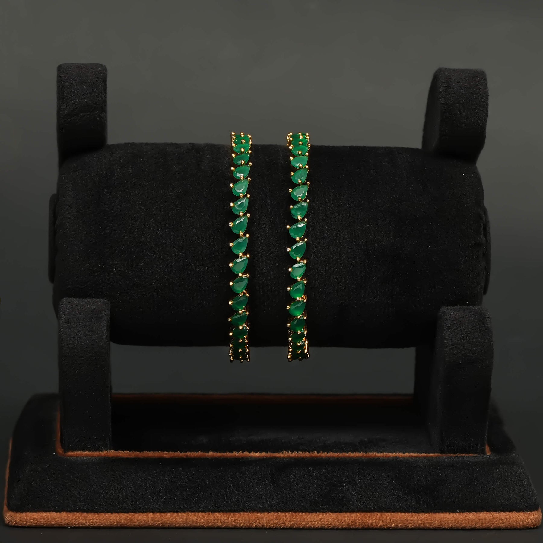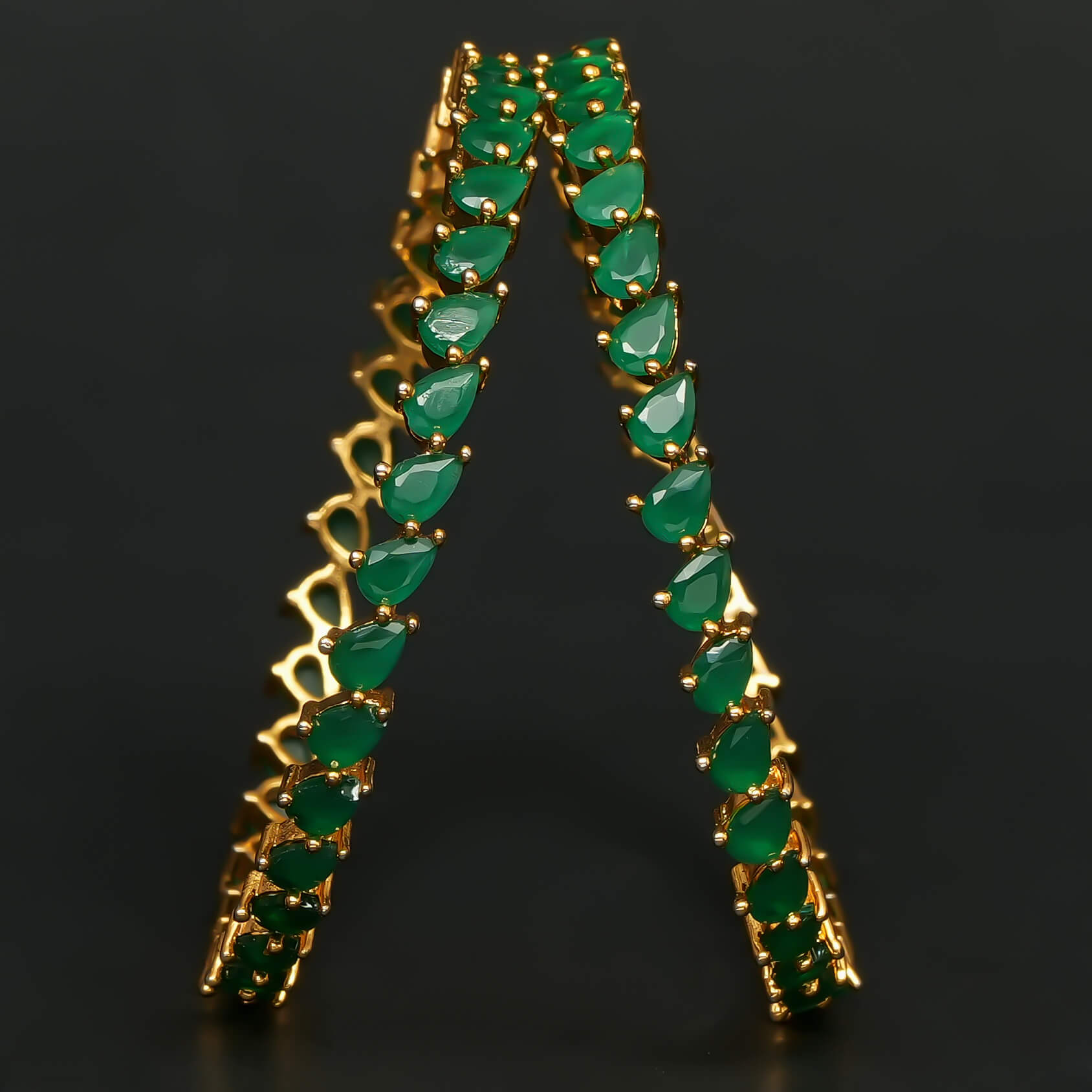 These handcrafted gold-finish bangles showcase semi-precious emerald stones accented with real cubic zirconia for lasting sparkle. Each piece features a unique, one-of-a-kind design combining expert craftsmanship with elegant materials, making them a refined choice for those seeking exclusive, sophisticated jewelry.