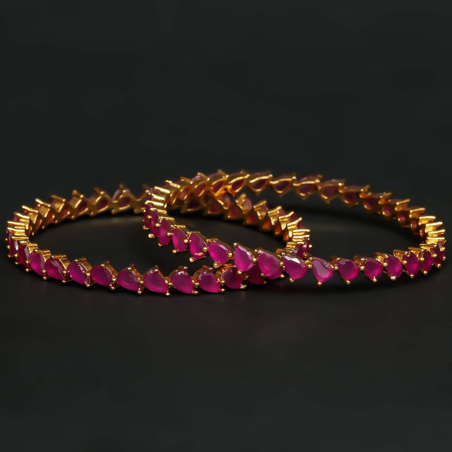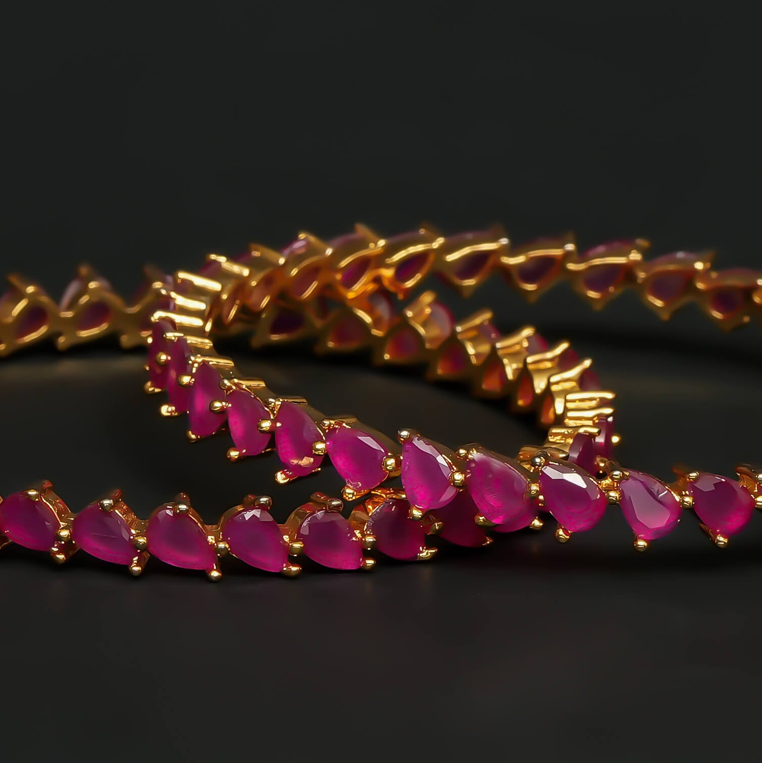 Elevate your accessory collection with these expertly handcrafted gold finish ruby bangles. Featuring genuine CZ stones and semi-precious ruby accents, each piece boasts a unique, one-of-a-kind design. Perfectly blending timeless craftsmanship with vibrant color, these bangles add a sophisticated touch to any ensemble.
