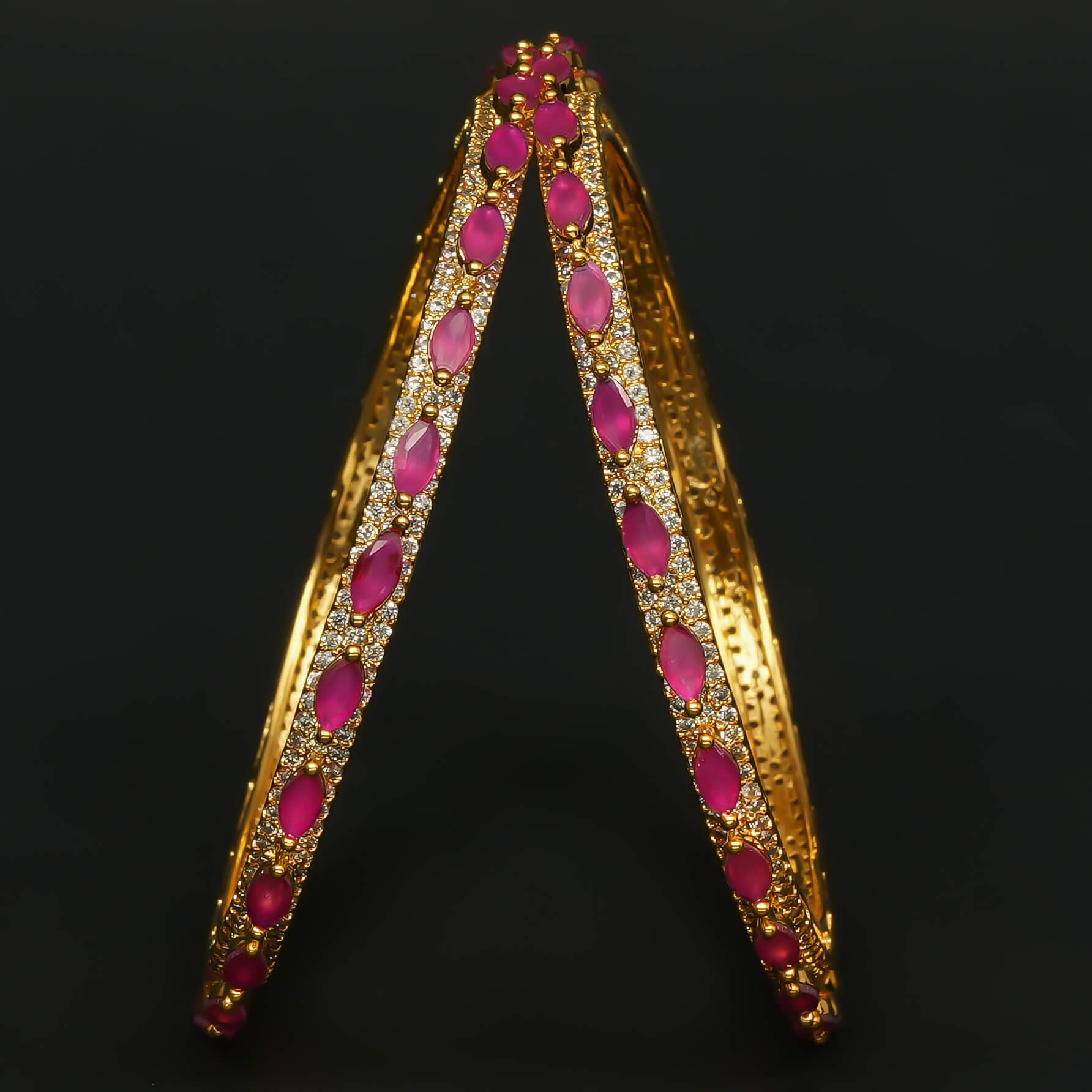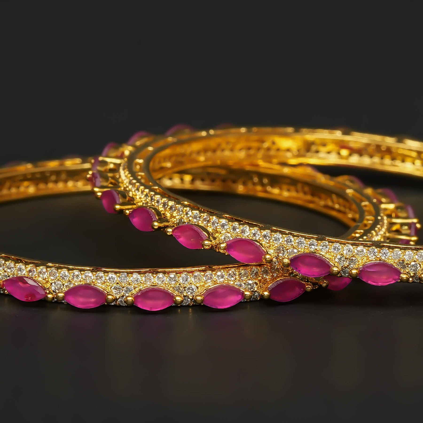 These handcrafted Ruby Gold Finish Bangles combine a luxurious gold finish with semi-precious ruby stones, highlighting an exclusive, one-of-a-kind design. Expertly crafted, these bangles offer a sophisticated and unique accessory that adds elegance and charm to any ensemble.