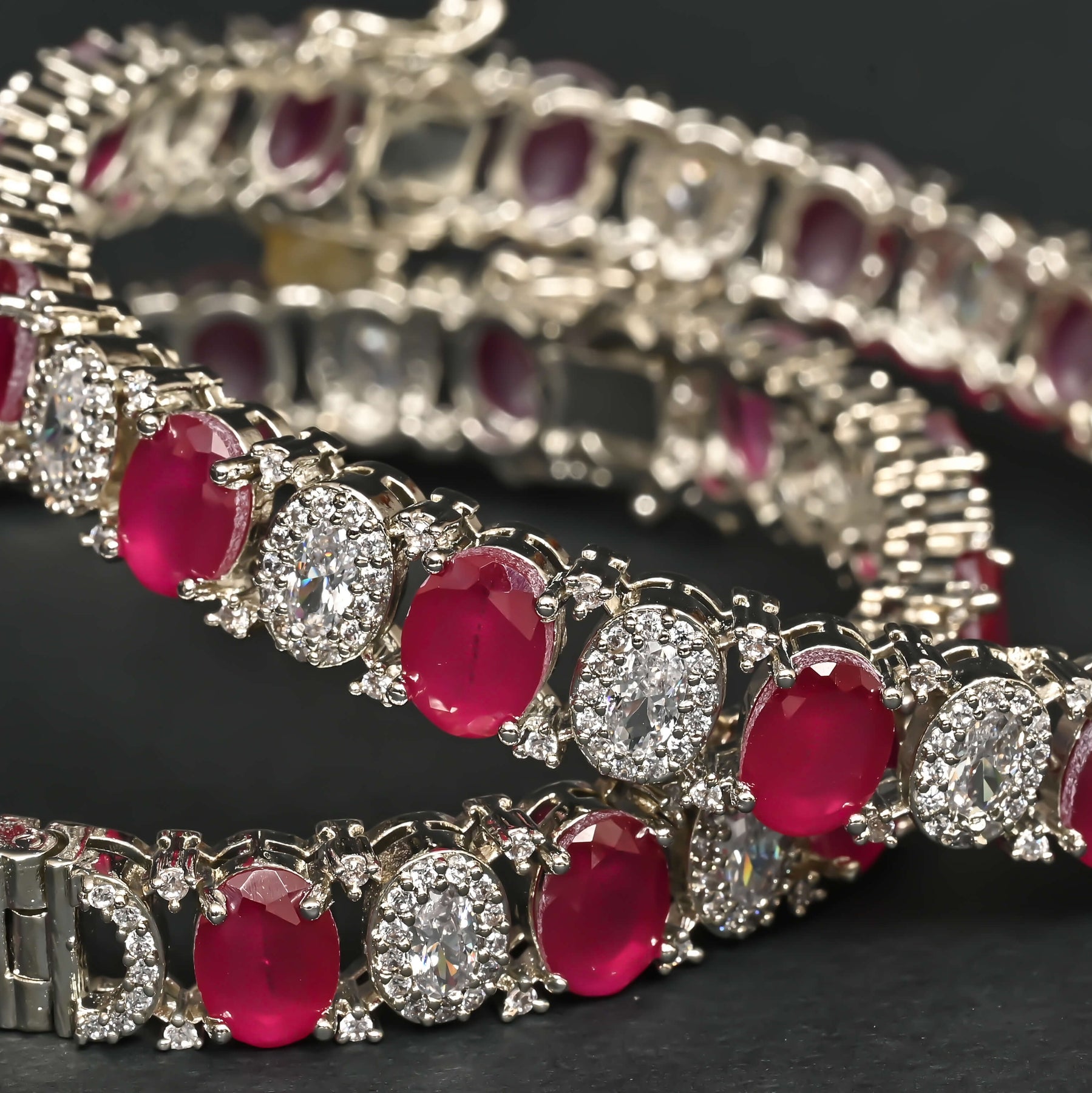 These Ruby White Gold Bangles showcase a unique handcrafted design featuring a lustrous white gold finish. Set with real CZ stones alongside semi-precious ruby stones, they deliver the striking brilliance of diamonds with added vibrant color. The side clip open mechanism ensures effortless and secure wear, blending exceptional craftsmanship with practical elegance.