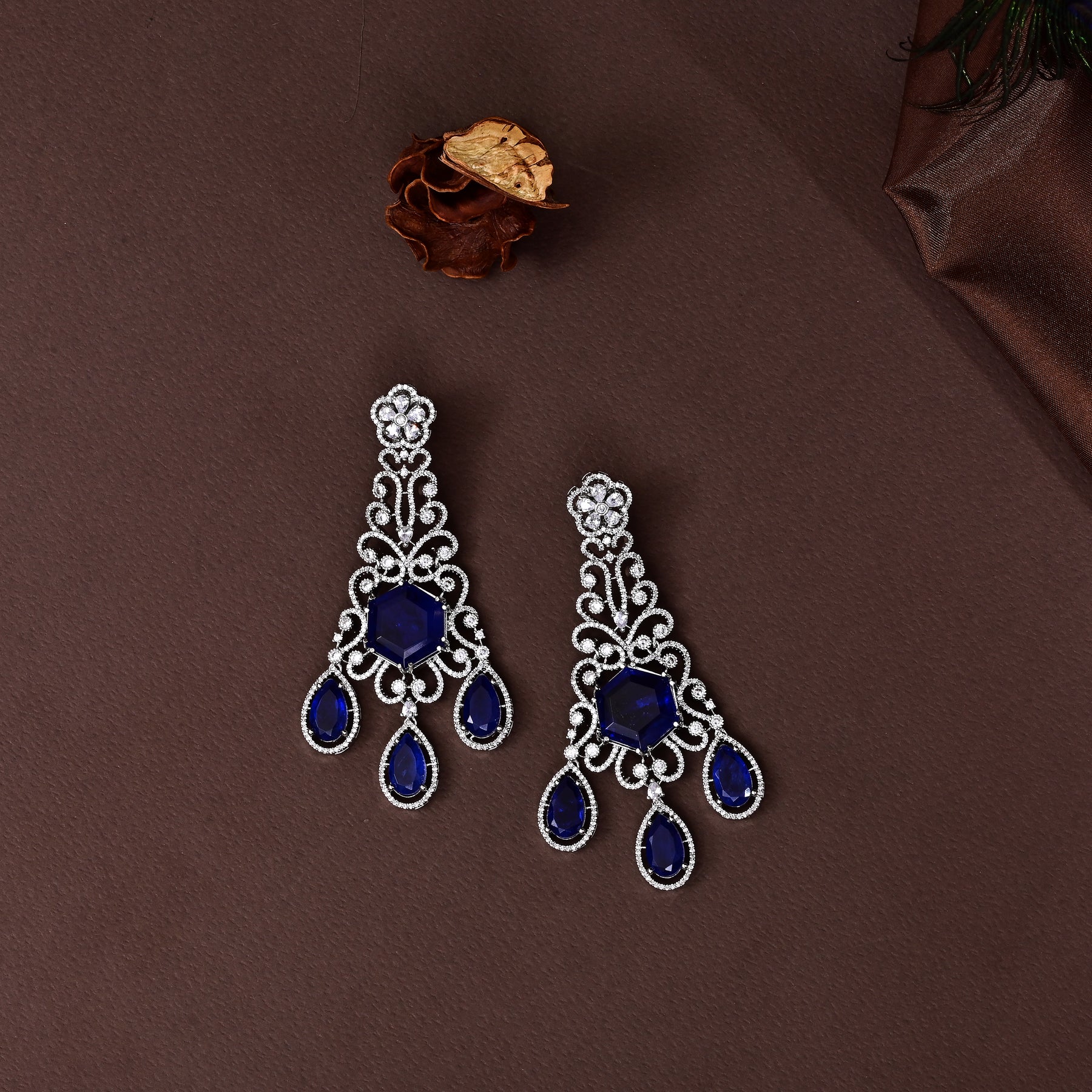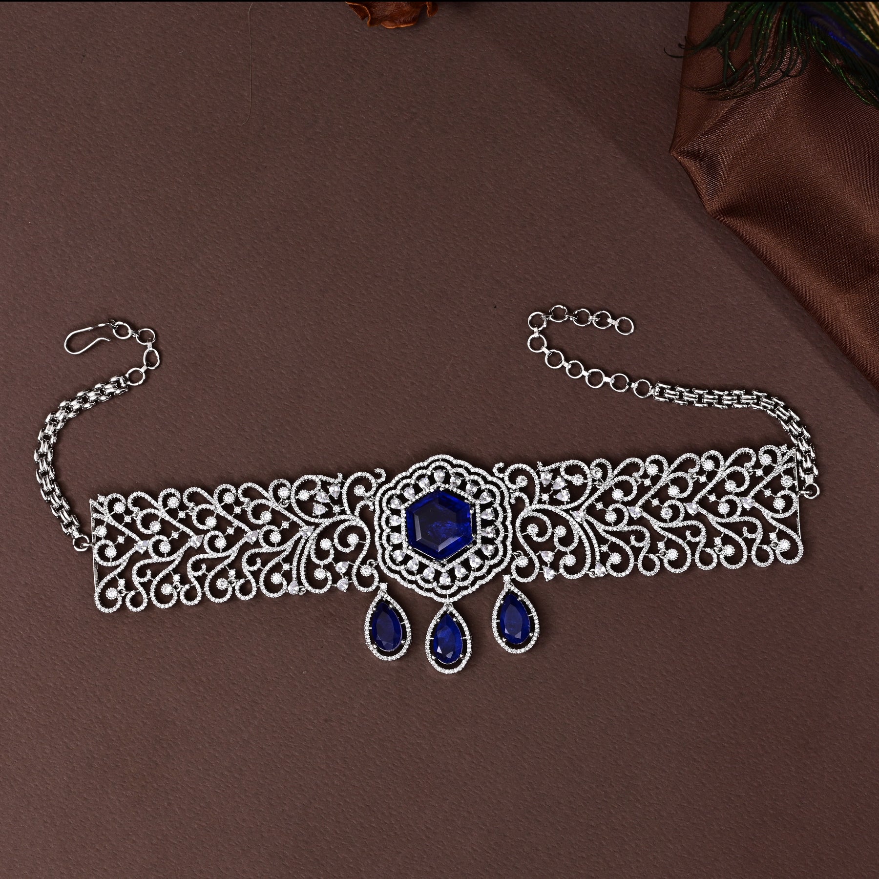 This exquisite choker set features real CZ stones and semi precious blue sapphire stones, expertly handmade to achieve a stunning, one-of-a-kind design. With a real diamond look, this exclusive choker exudes elegance and luxury. Elevate your style with this unique, expertly crafted accessory.