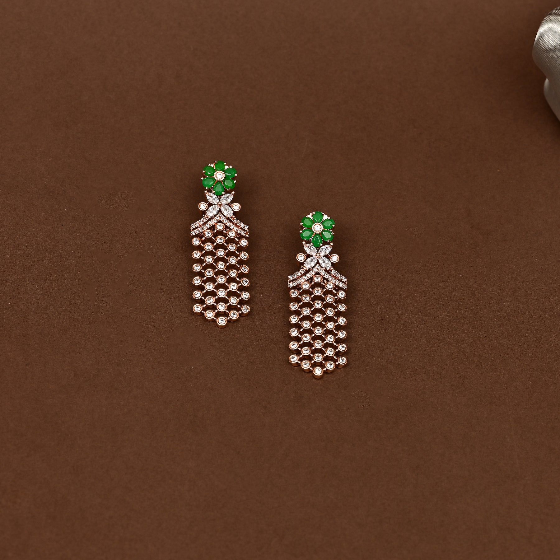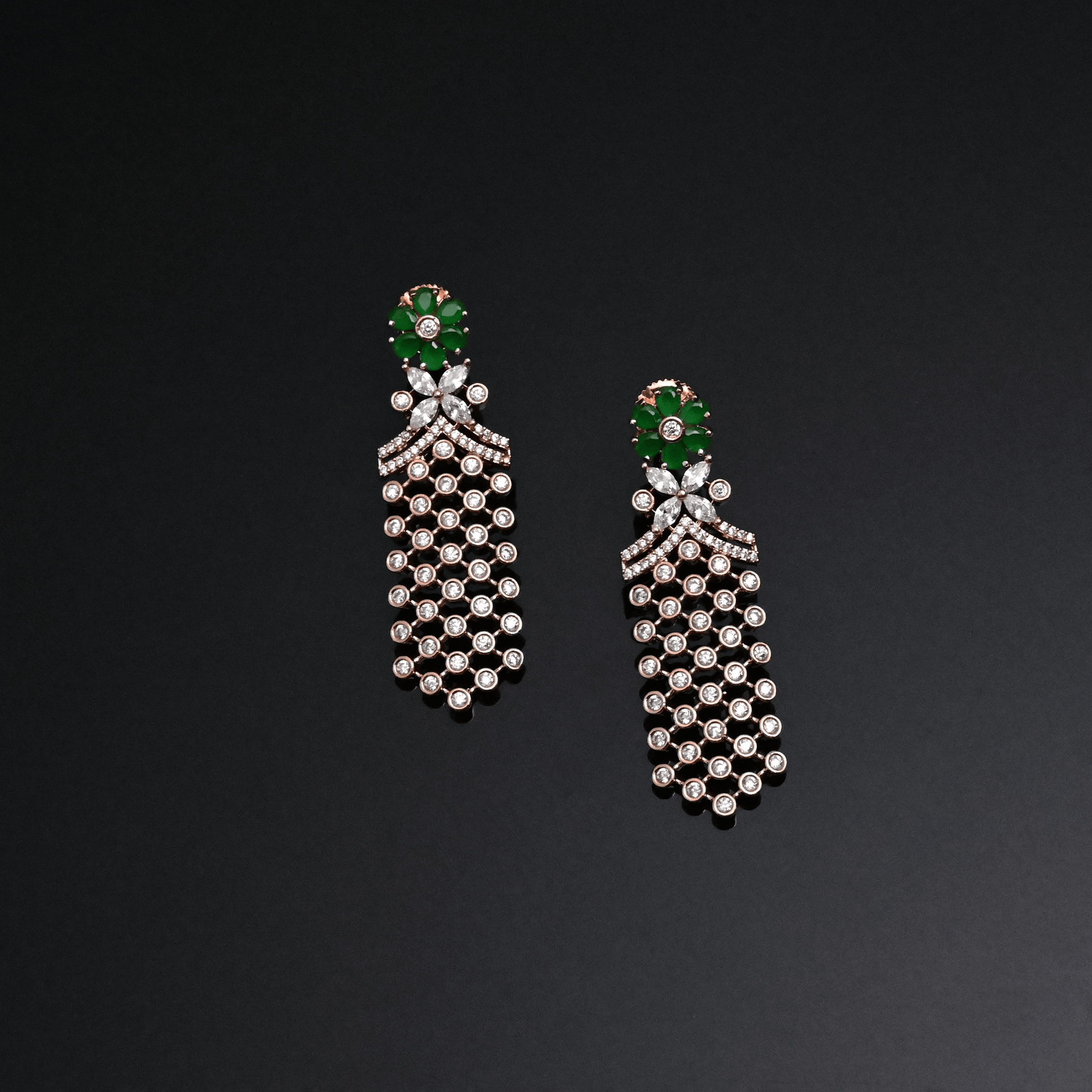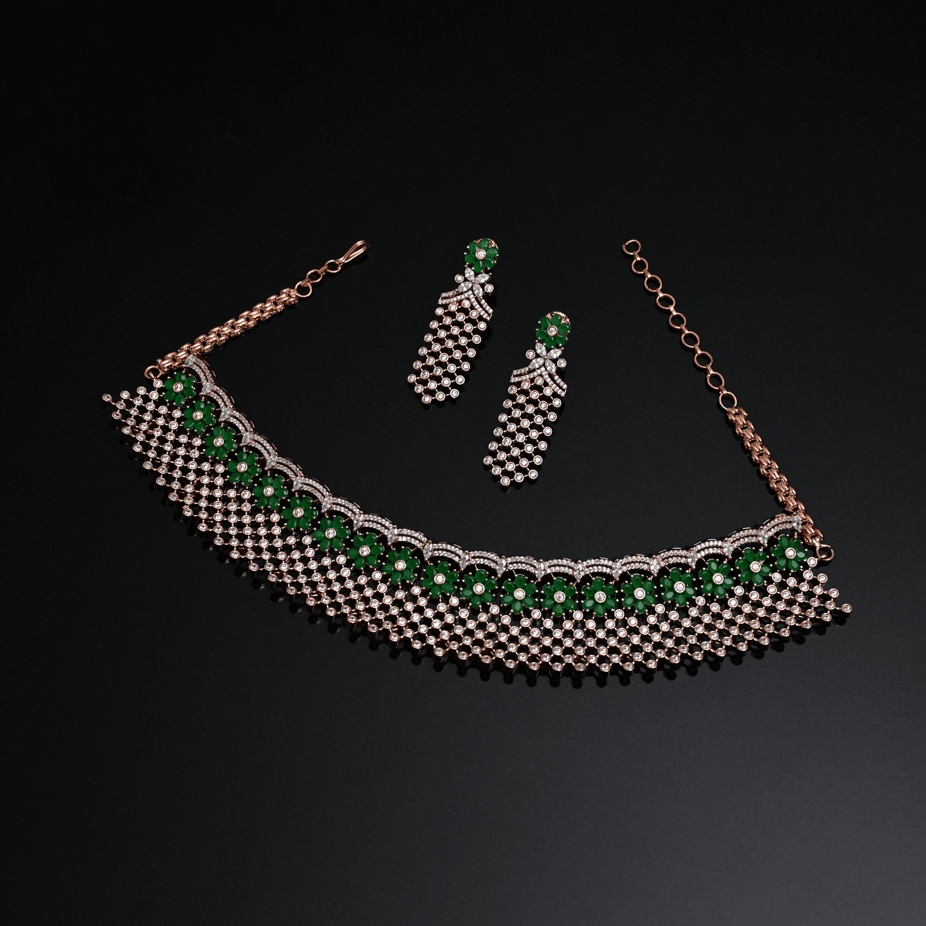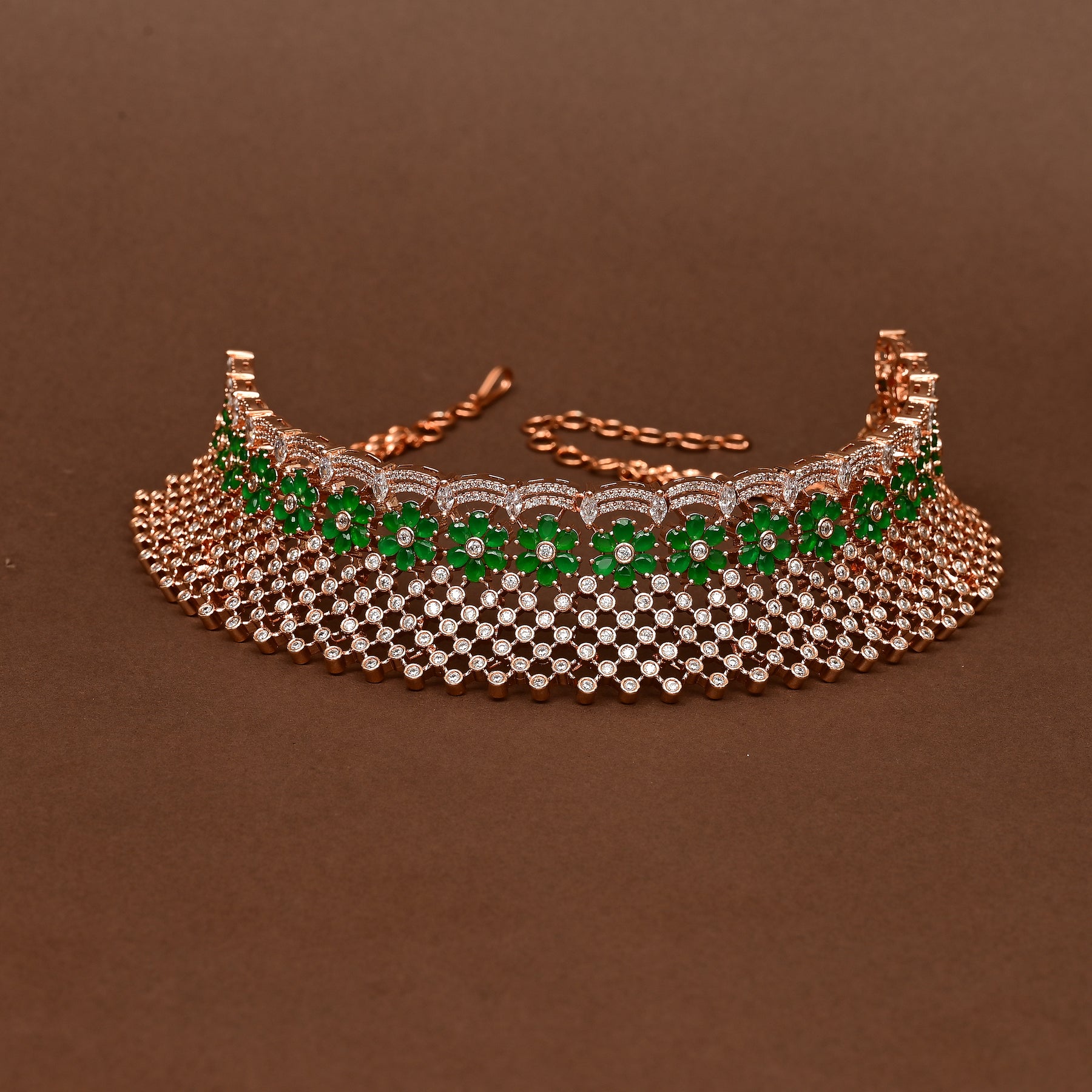 This CZ Choker features real CZ stones and semi-precious Emerald stones, carefully handcrafted to give a diamond-like shine. With its one-of-a-kind exclusive design, this choker is the perfect accessory for any outfit. Add a touch of elegance and luxury to your fashion with this exquisite piece.