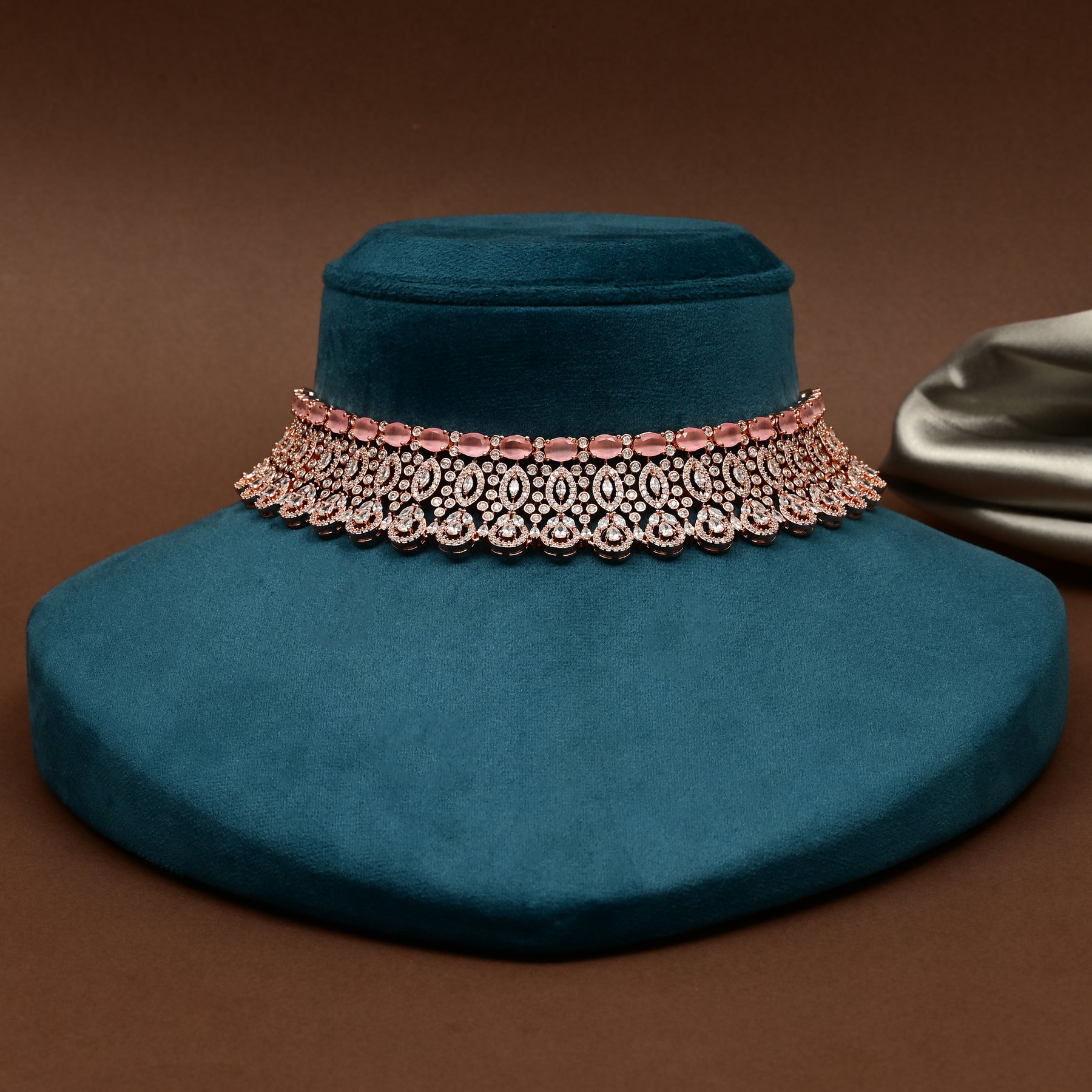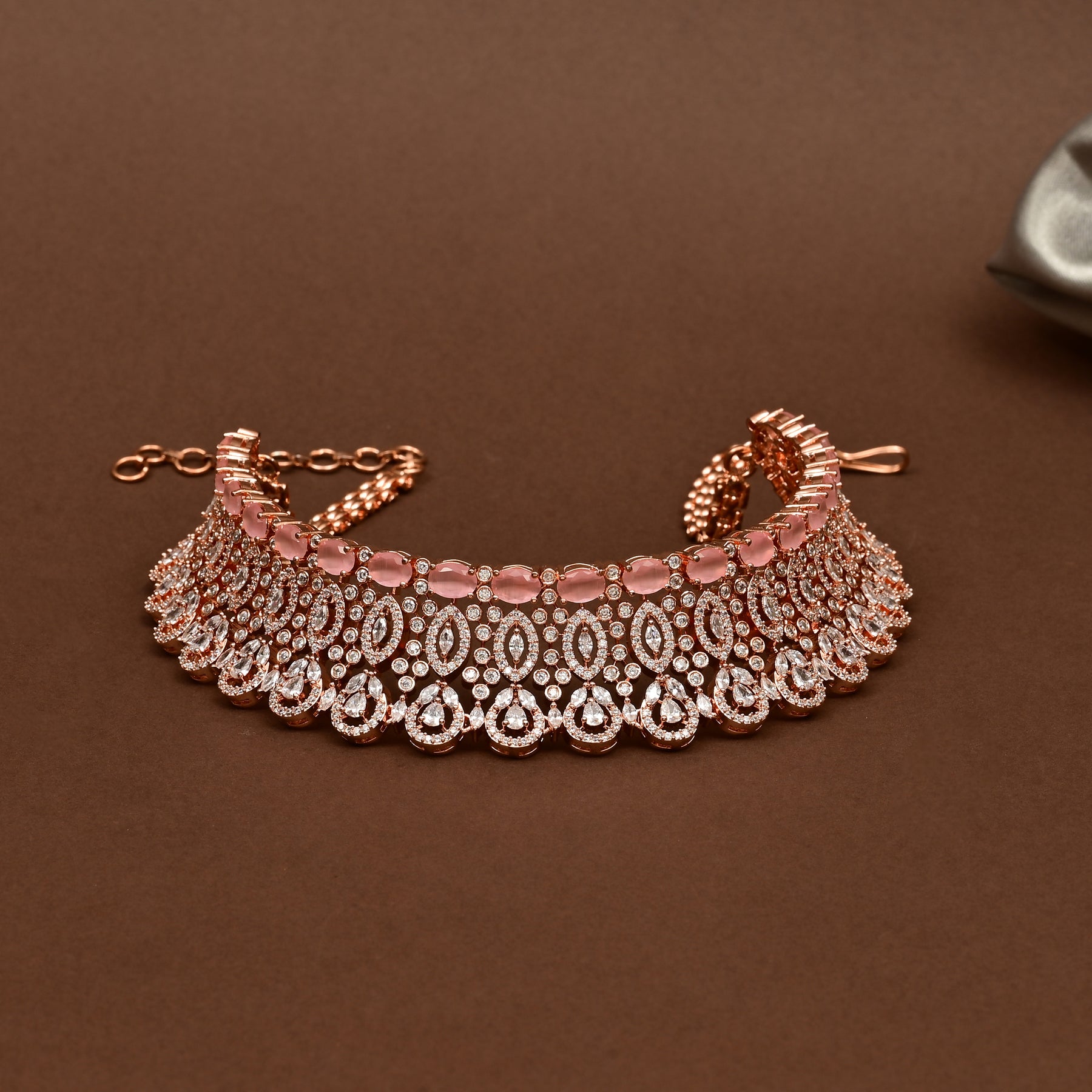 Introducing the CZ Choker, a luxurious and exclusive piece designed for those who crave elegance and sophistication. Adorned with sparkling CZ and semi-precious pink stones, this handcrafted rose gold choker is a true work of art. With its diamond-like shine, it is sure to make a statement and elevate any outfit. Don't miss out on this one-of-a-kind design.