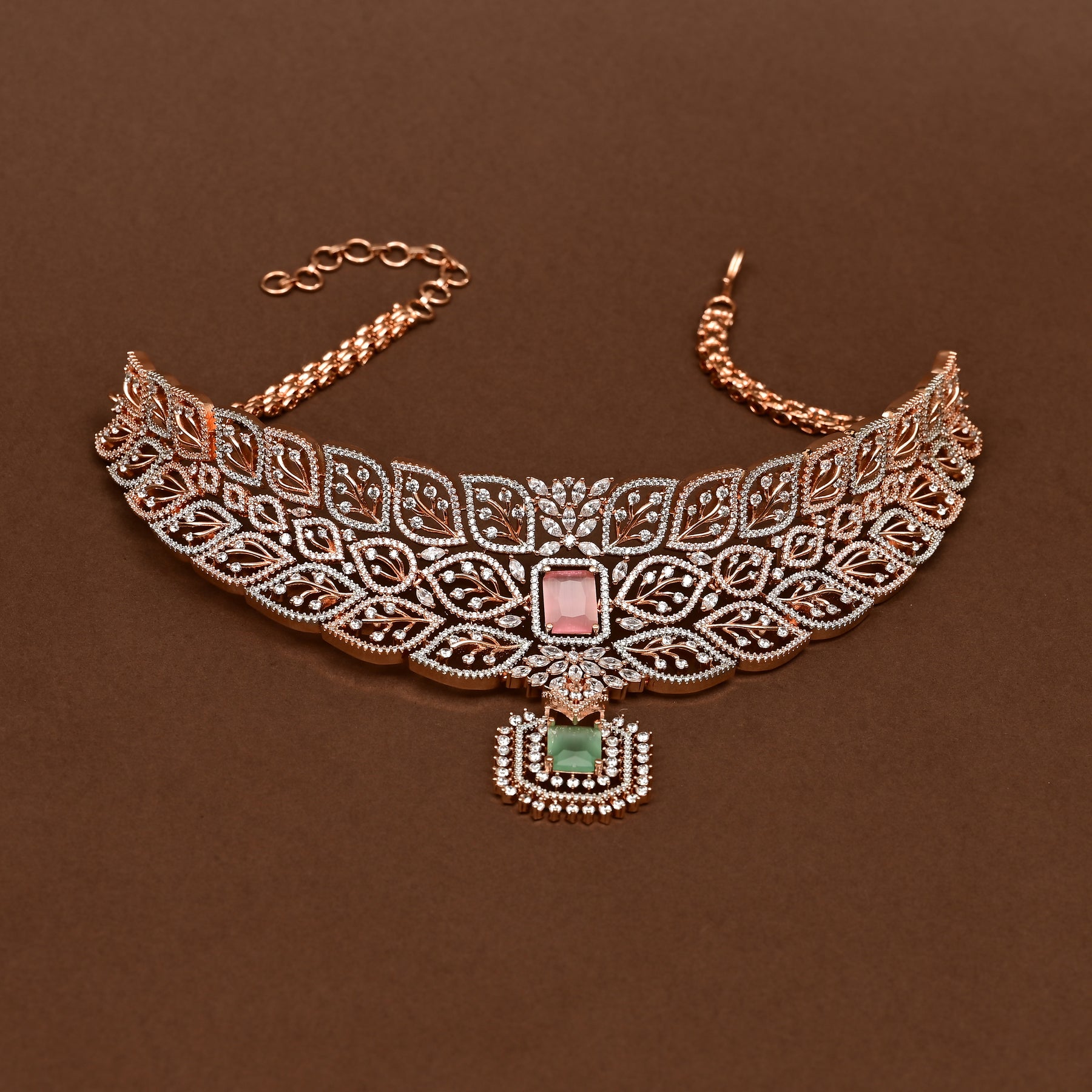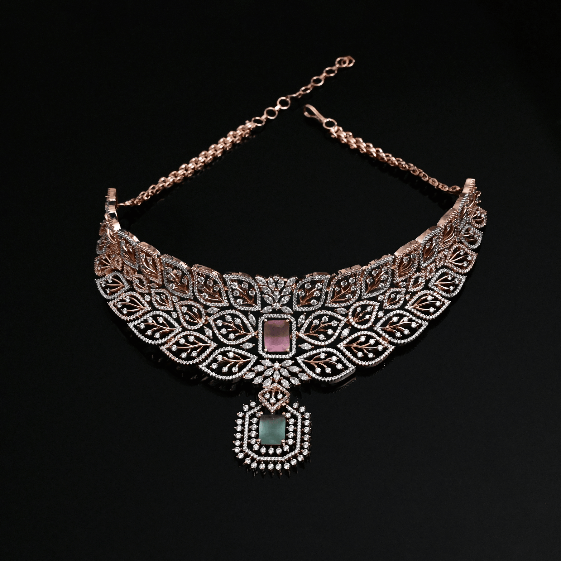 This CZ rose gold choker features semiprecious pastel pink and green stones that add a subtle pop of color. Expertly crafted with real CZ stones, this unique and exclusive design resembles a diamond-like sparkle. A must-have for any choker lover or jewelry enthusiast.