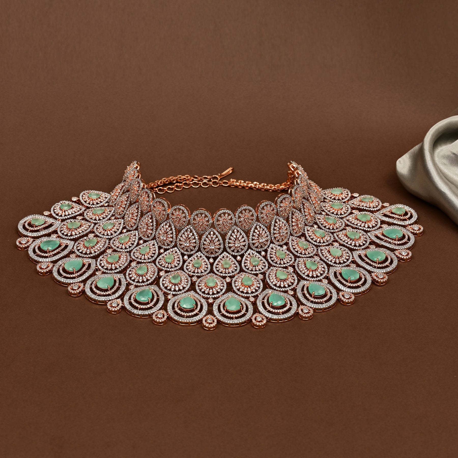 This CZ rose gold choker features semi-precious pastel green stones, along with real CZ stones. Hand-crafted to resemble diamonds, this one-of-a-kind piece showcases an exclusive design. Elevate your style with this exquisite choker.