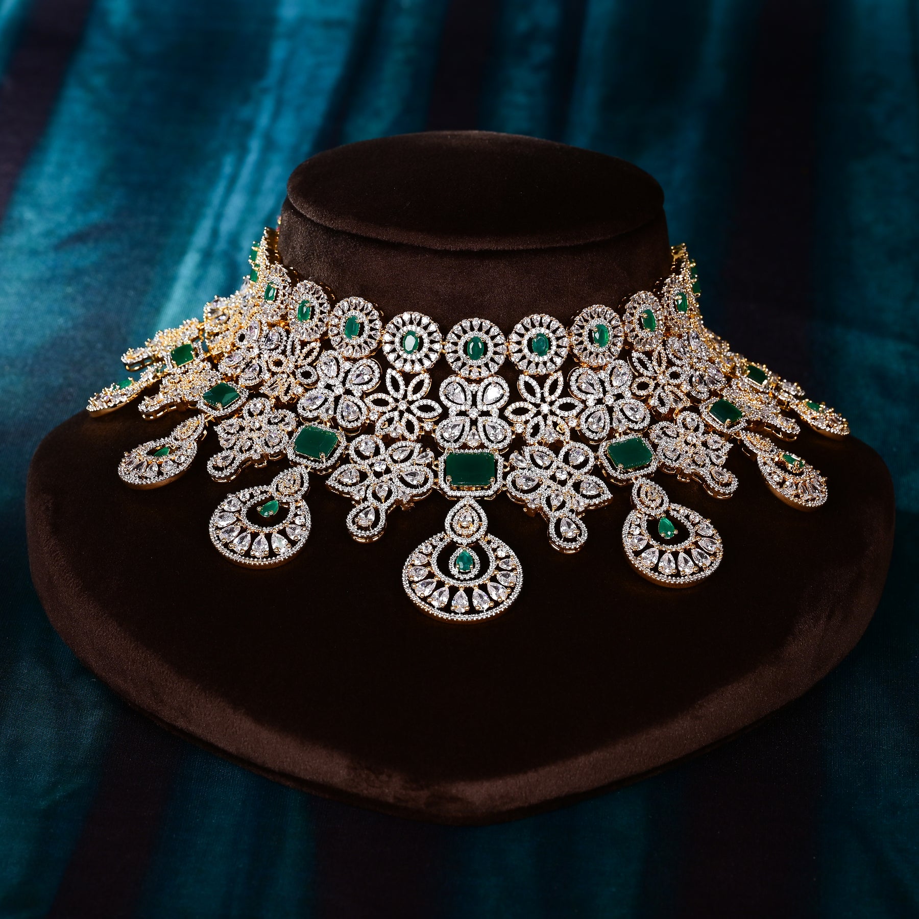 This CZ Emerald Choker features real CZ stones and semi-precious emerald stones, handcrafted to create an exquisite diamond-like choker set. Enjoy the luxurious look and feel of real diamonds without the high cost. Elevate your style with this exclusive, expertly crafted piece.