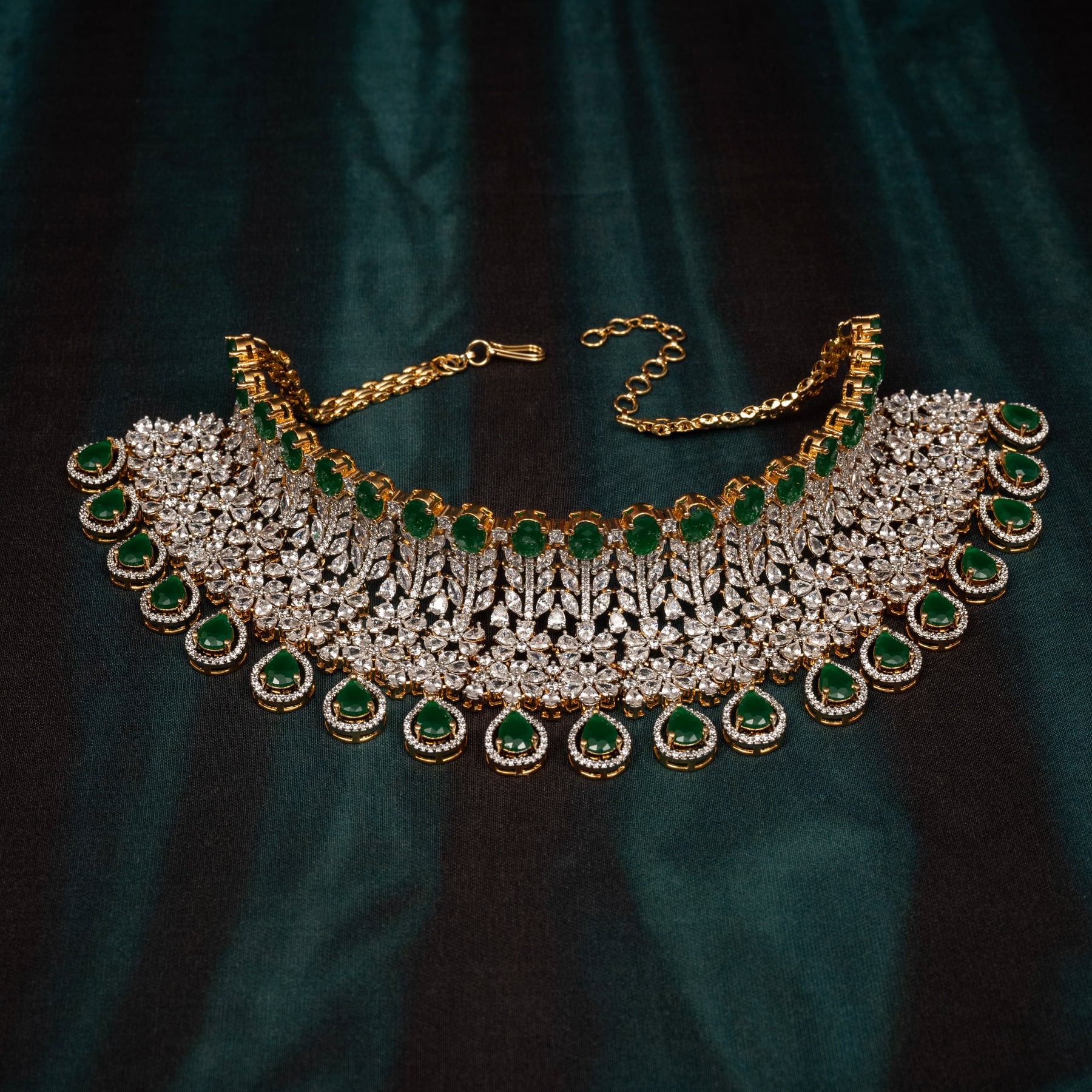 Elevate your style with our CZ Emerald Choker. With real CZ and semi-precious emerald stones, this hand-crafted piece boasts a diamond-like shine. The perfect combination of luxury and elegance, it's sure to make a stunning addition to any outfit.