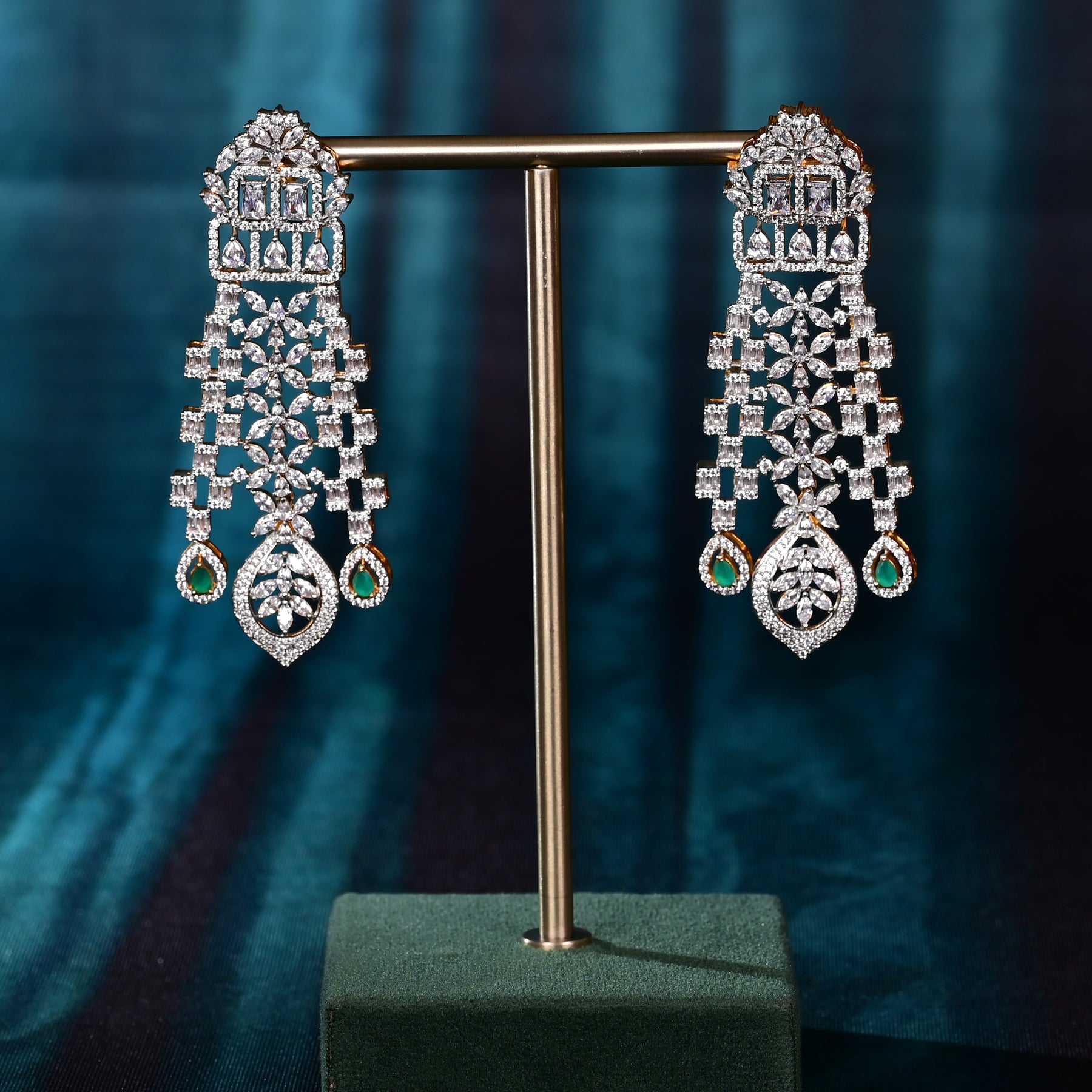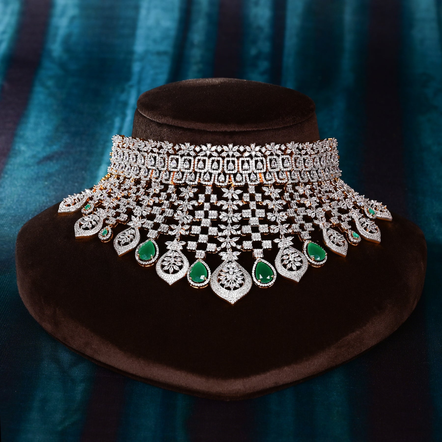 This CZ Emerald Choker features real CZ stones and semi-precious emerald stones, handcrafted to give a diamond-like appearance. Its one-of-a-kind, exclusive design adds a touch of elegance to any outfit. Enhance your style with the perfect combination of beauty and sophistication.