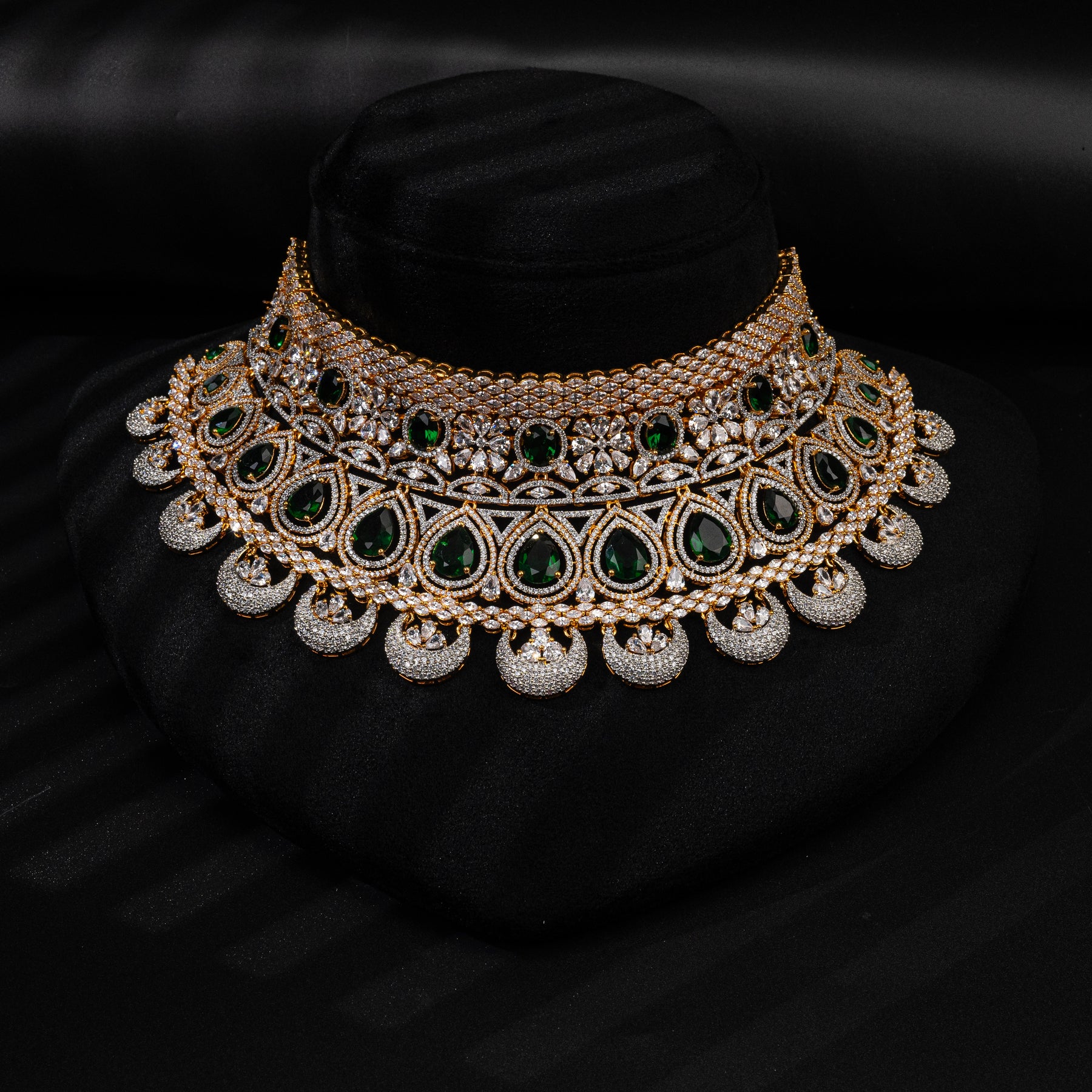 Expertly crafted with genuine CZ and semi-precious emerald stones, this choker boasts a unique and exclusive design. The diamond-like appearance adds a touch of luxury to any outfit. Elevate your style with this hand-crafted, one-of-a-kind piece.