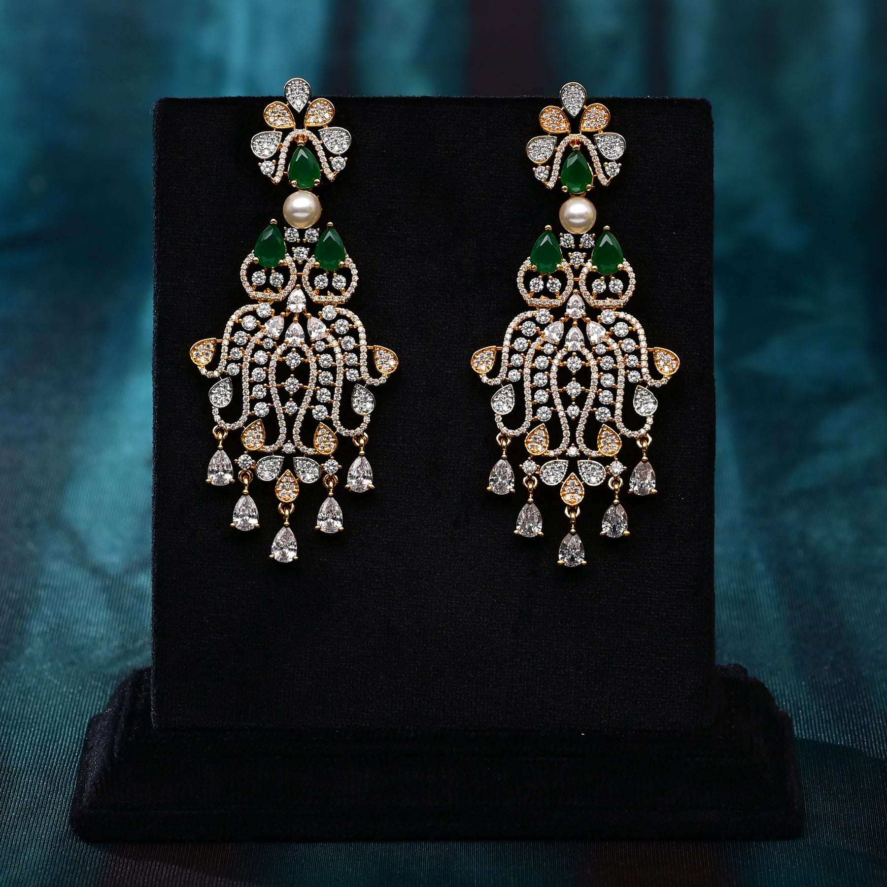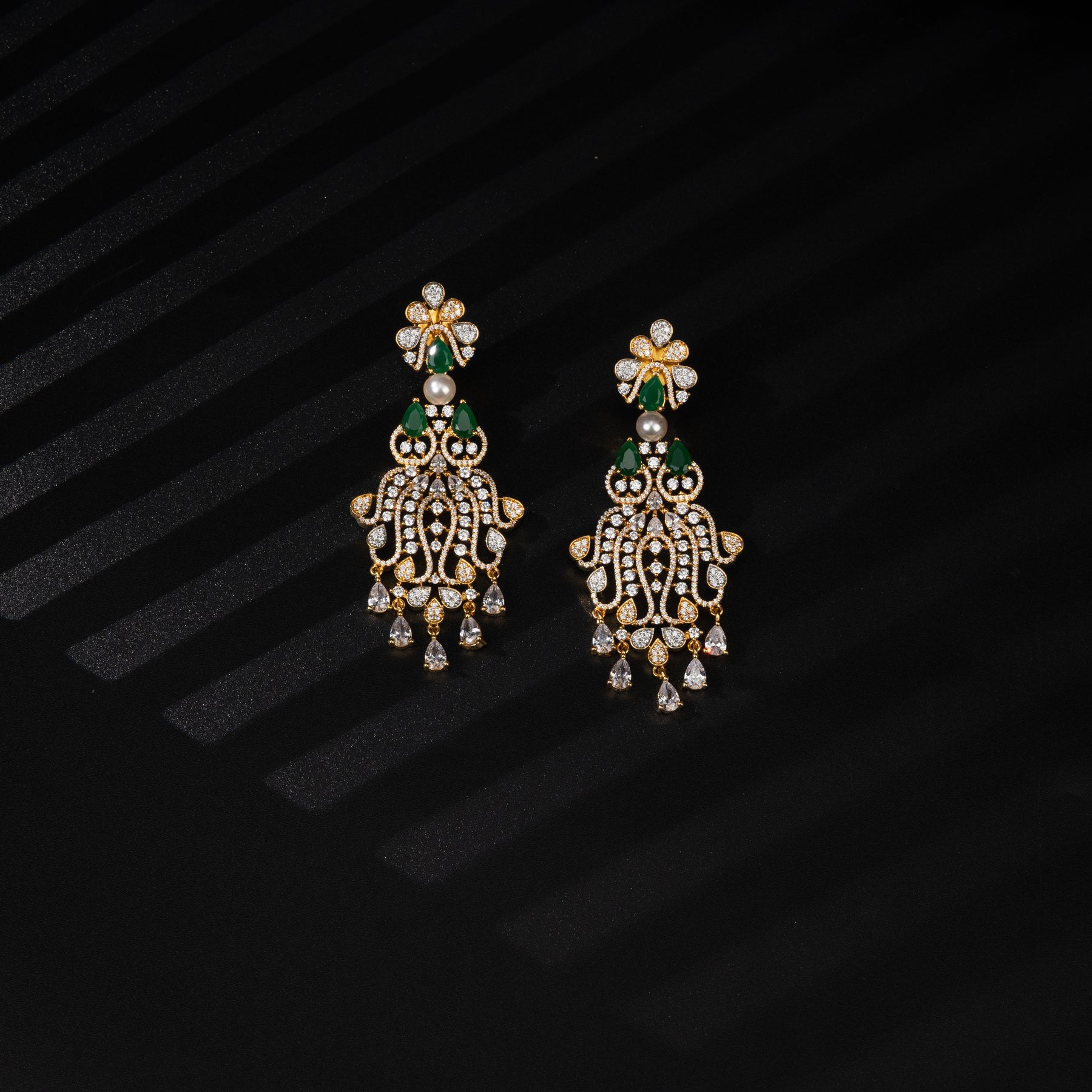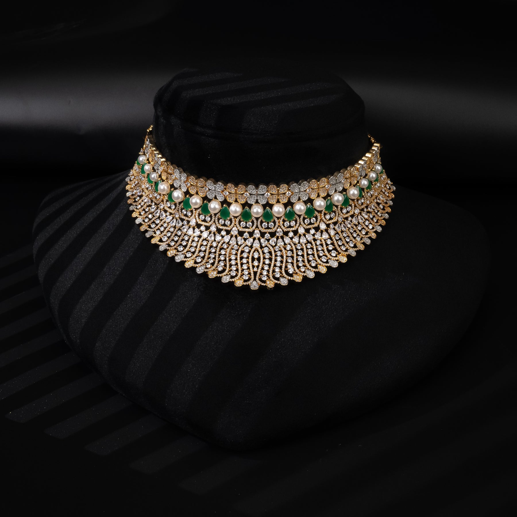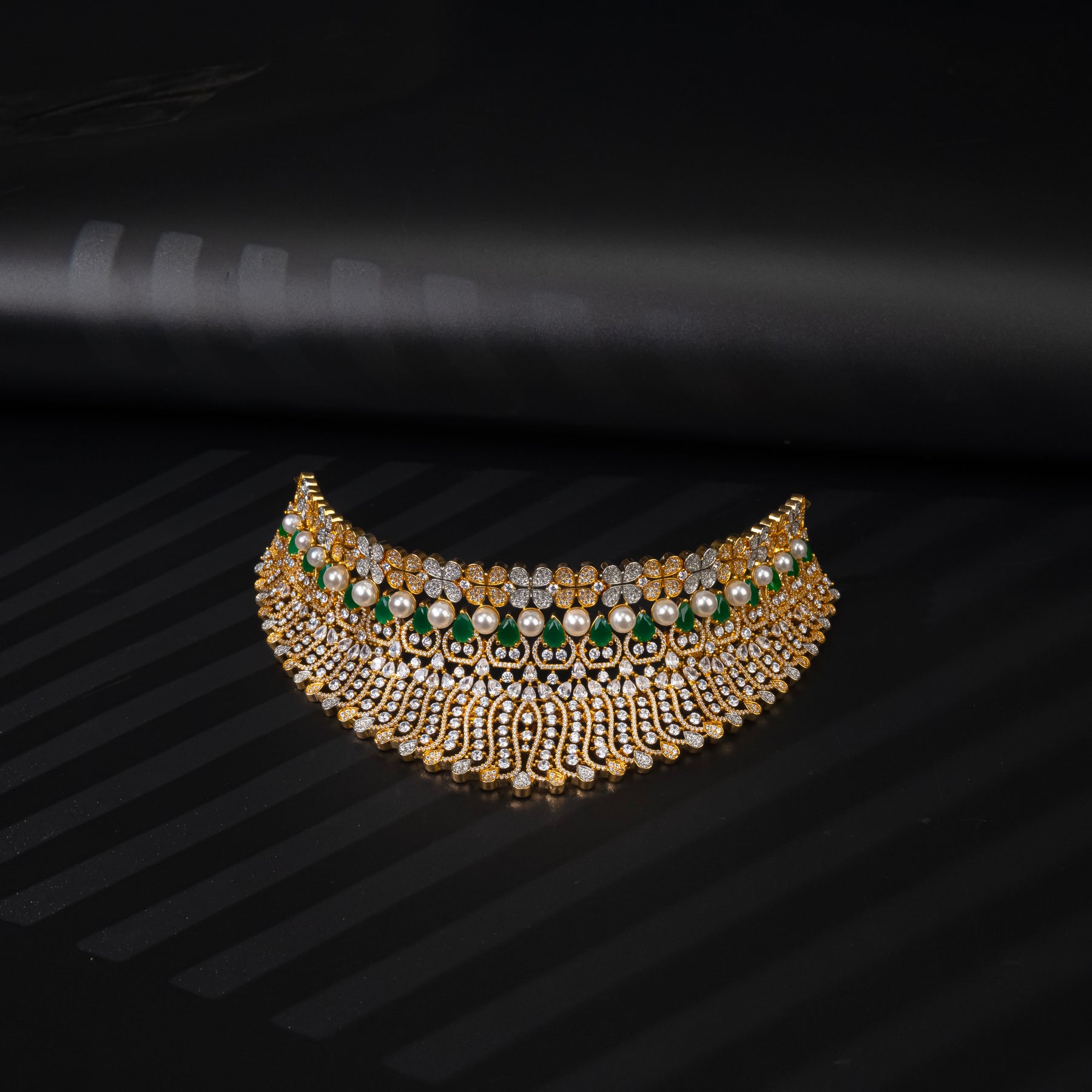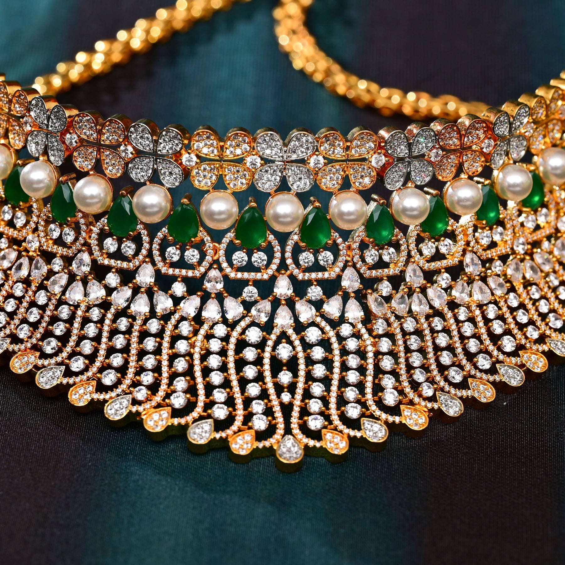 This handcrafted CZ Emerald Choker features real CZ and semi-precious emerald stones. Its exclusive design is further enhanced with diamond-like details and pearl embellishments. Elevate your look with this one-of-a-kind choker, perfect for any occasion.