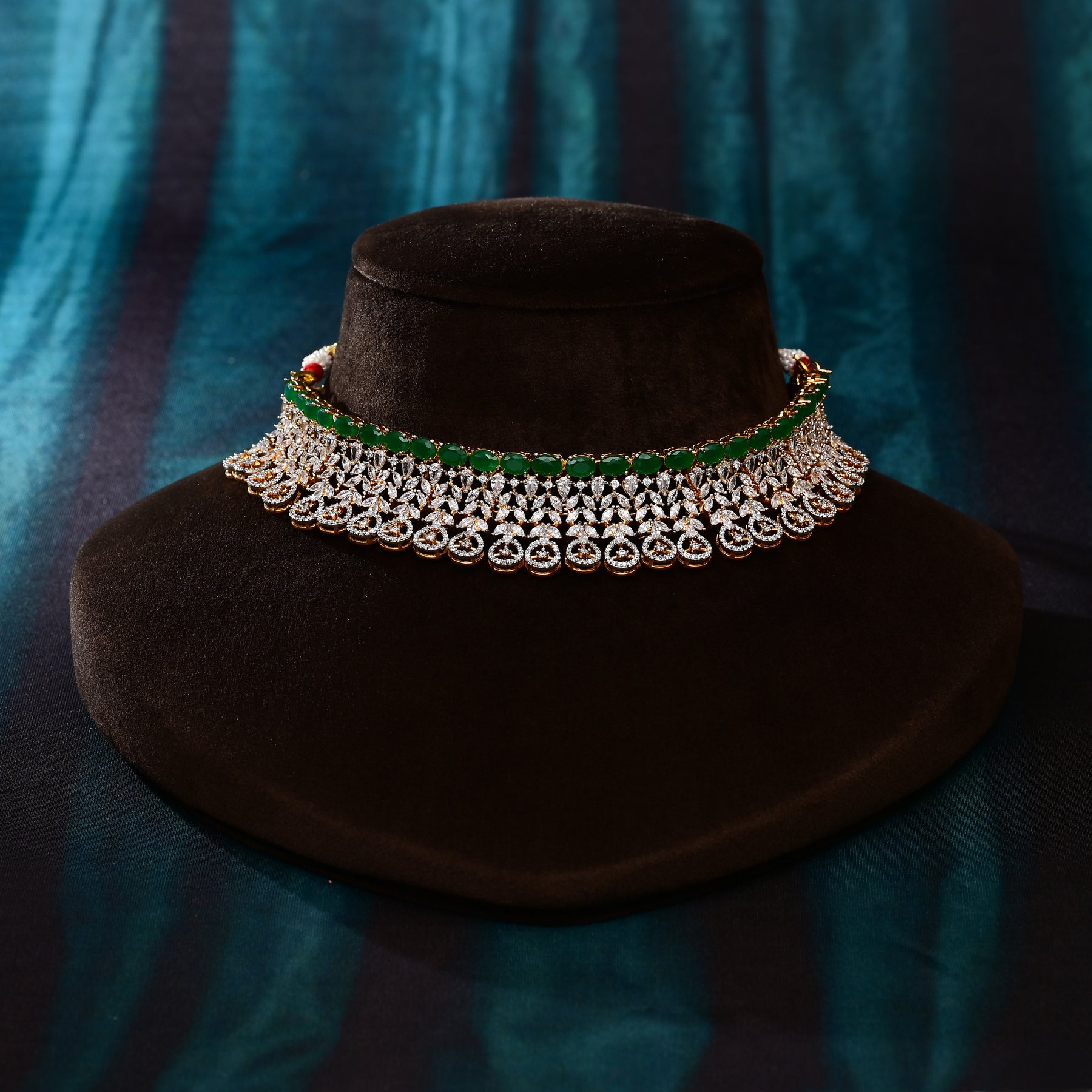 Expertly hand-crafted and showcasing real CZ and semi-precious Emerald stones, this unique choker is a one-of-a-kind piece with a design exclusive to our brand. The sparkling diamond-like appearance will add a touch of elegance to any outfit.