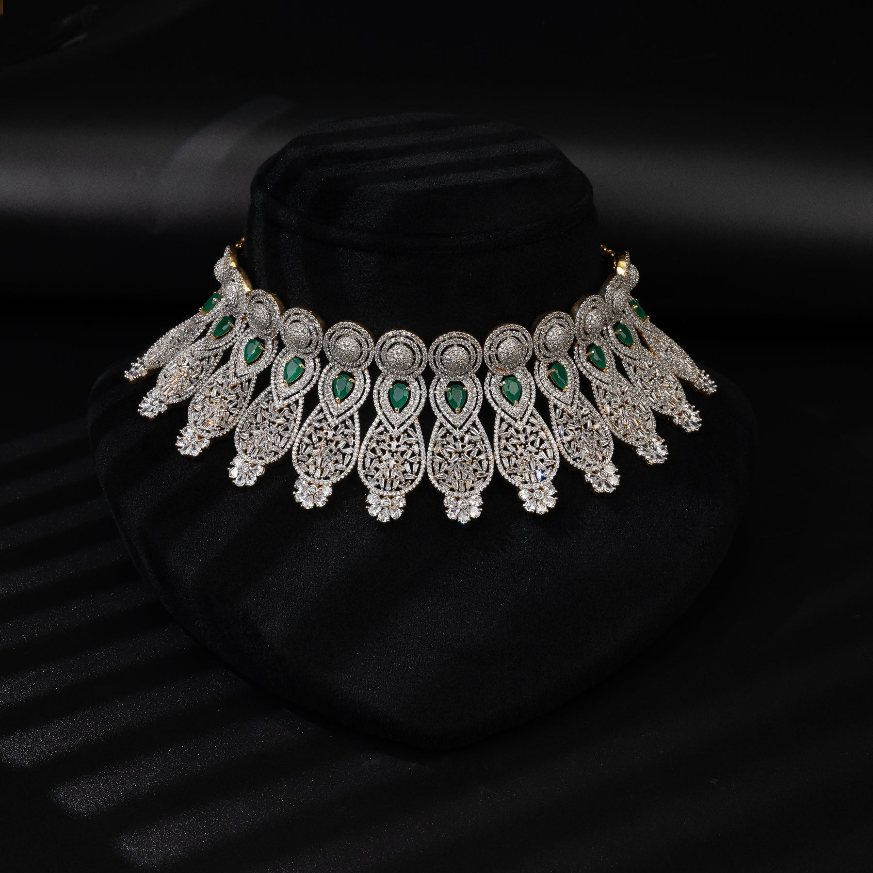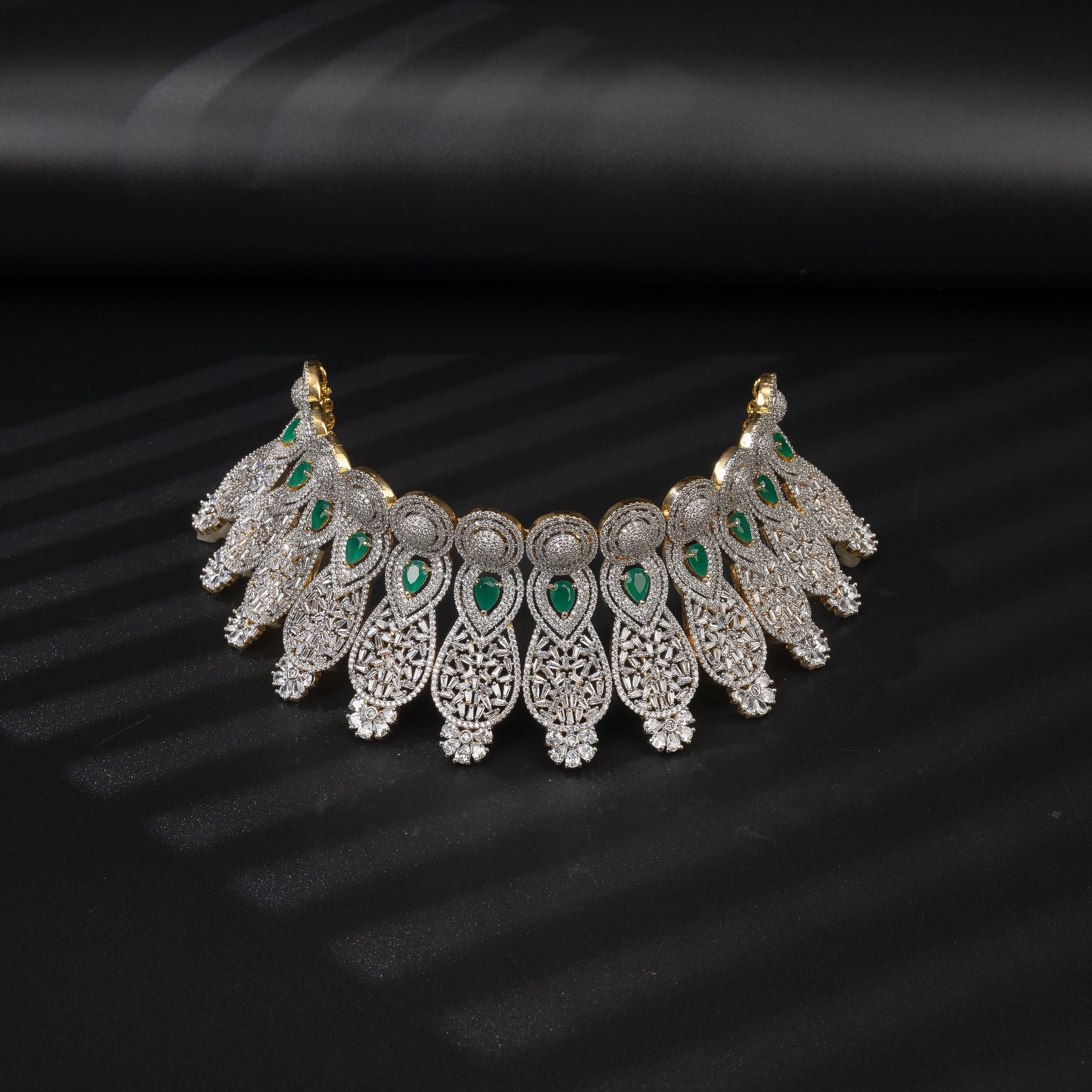 Expertly handcrafted, this CZ Emerald Choker boasts real CZ stones and semi-precious Emerald stones for a stunning, diamond-like sparkle. With its one-of-a-kind and exclusive design, this choker is the perfect statement piece for any occasion. Elevate any outfit with this unique and luxurious accessory.