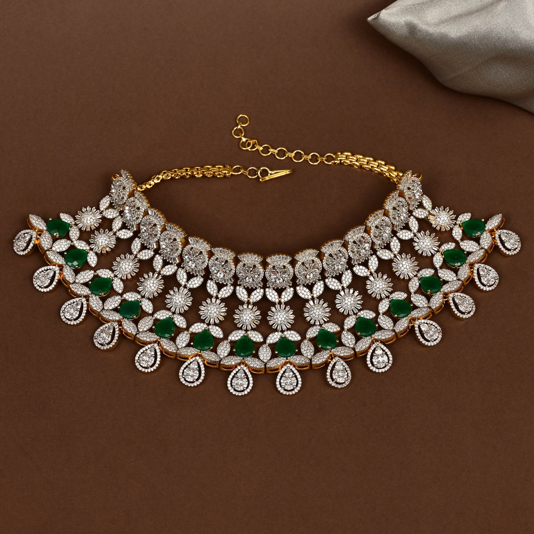 Expertly crafted with real CZ stones and semi-precious Emeralds, this choker and earring set boasts a one-of-a-kind design that is sure to make a statement. The sparkling, diamond-like finish adds a touch of elegance, making it a must-have for any jewelry collection.